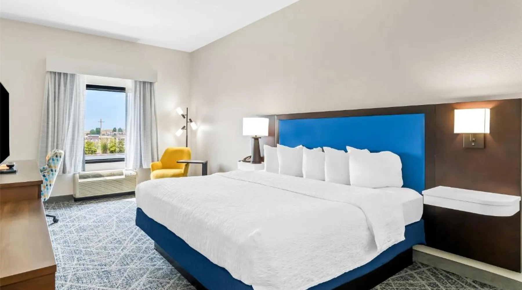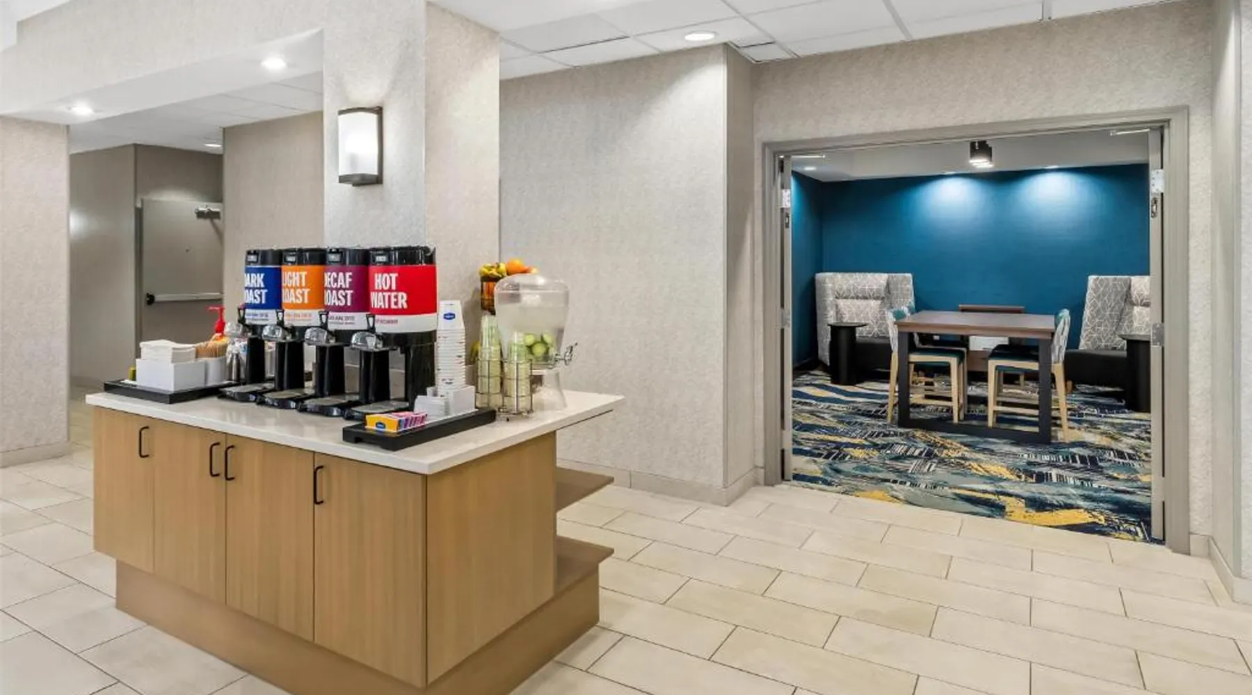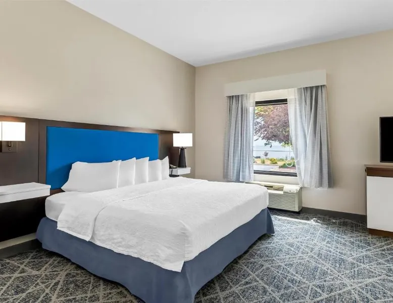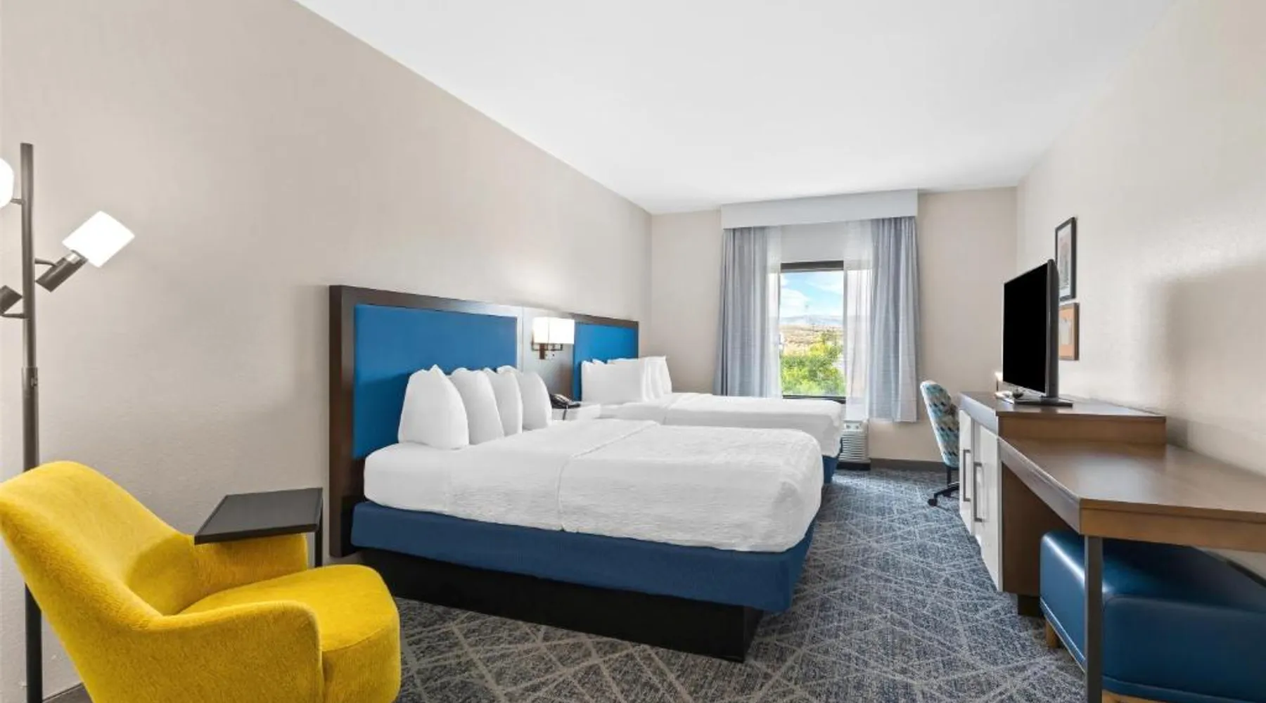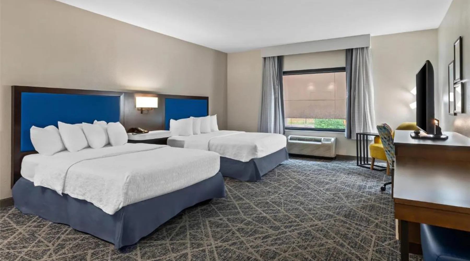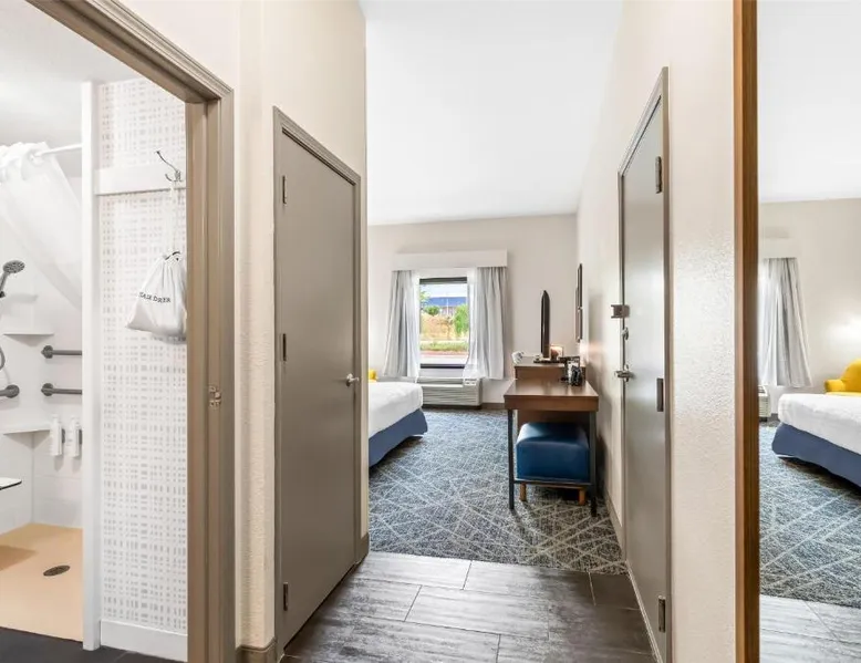 Comfortable Accommodations: Hampton Inn Laramie in Laramie offers family rooms with free WiFi, air-conditioning, and modern amenities. Each room includes a tea and coffee maker, hairdryer, refrigerator, microwave, shower, and TV. Leisure Facilities: Guests can enjoy an indoor swimming pool, fitness center, and hot tub. The property features a fitness room, elevator, outdoor seating area, and a minimarket. Free on-site parking is available. Convenient Location: Located 9.3 mi from Laramie Regional Airport and 1.2 mi from War Memorial Stadium, the hotel is near an ice-skating rink. The surrounding area offers various attractions. Guest Services: The hotel provides a 24-hour front desk, daily housekeeping, room service, and a daily breakfast. Guests appreciate the attentive staff, room cleanliness, and the quality of the breakfast provided by the property. This room features a flat-screen TV, a work desk and tea and coffee-making facilities.