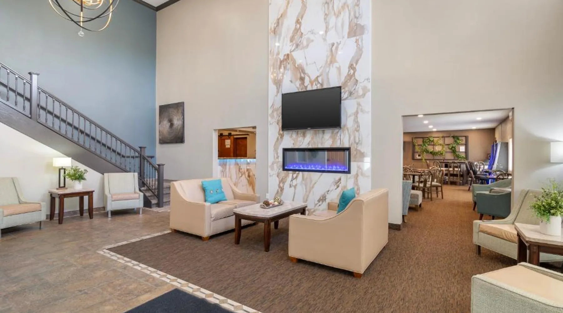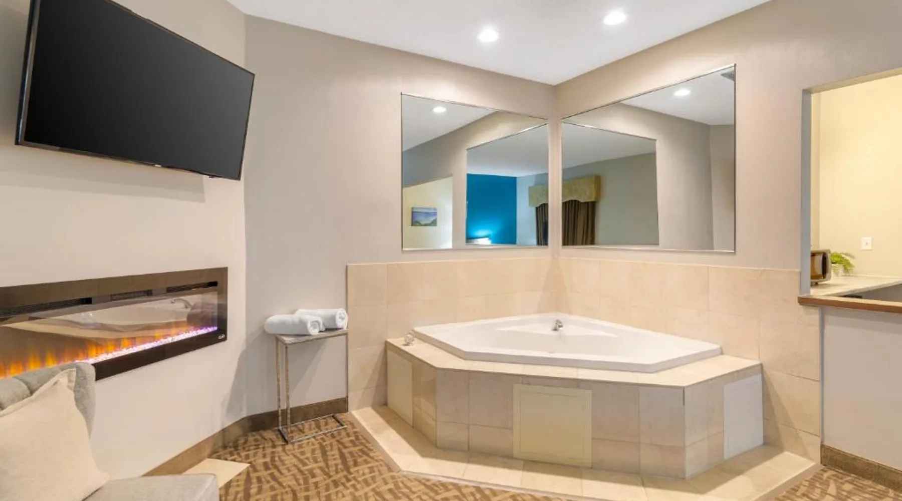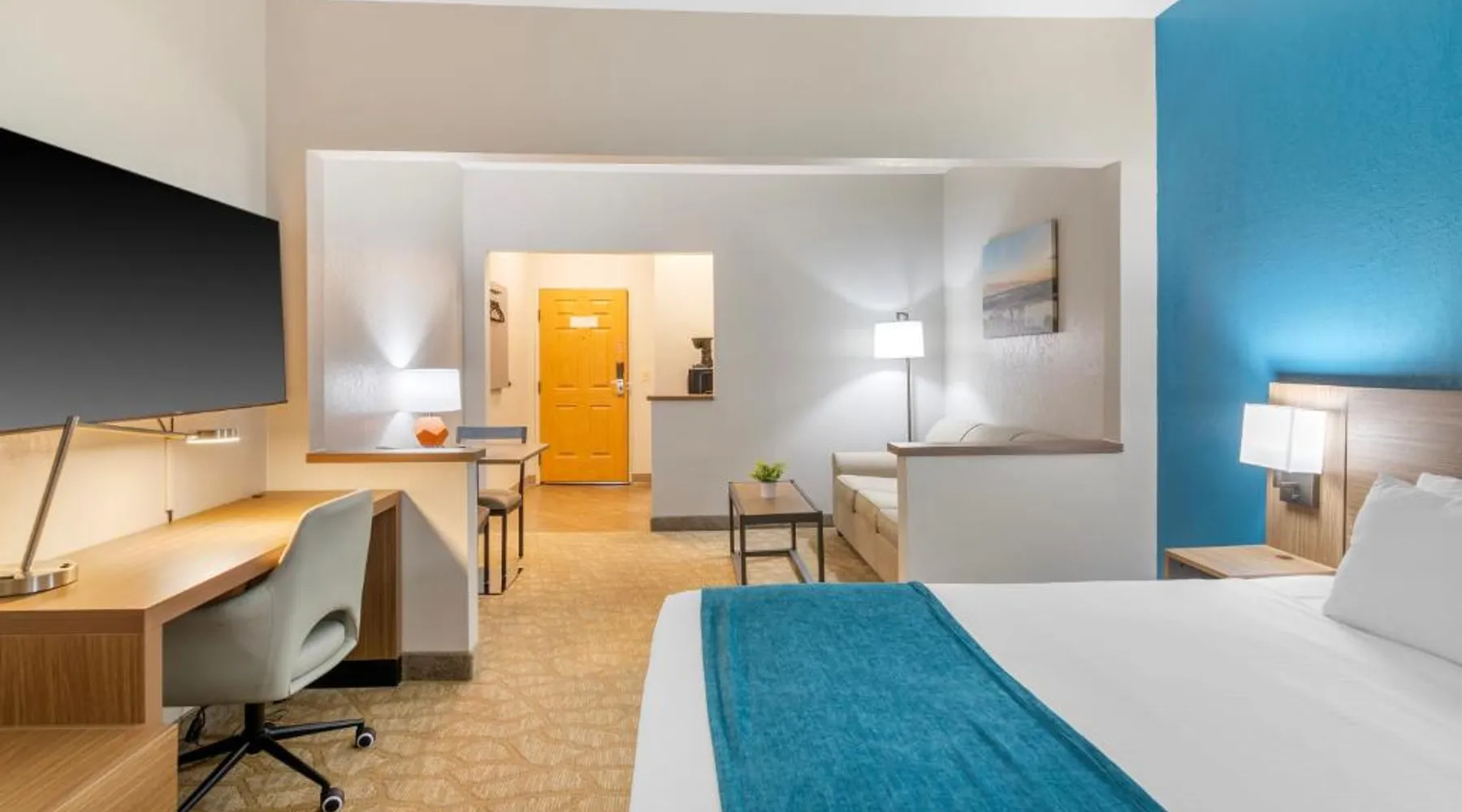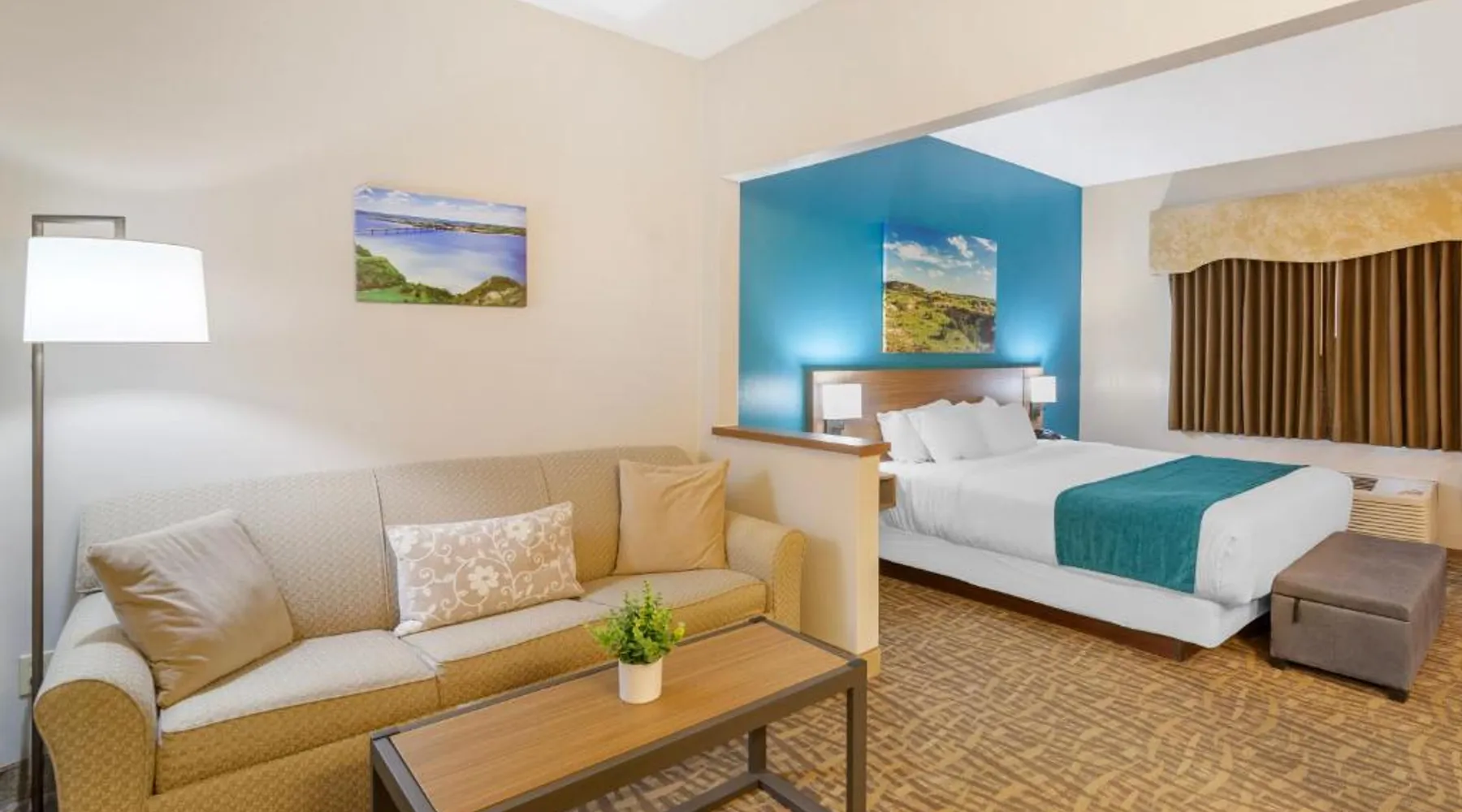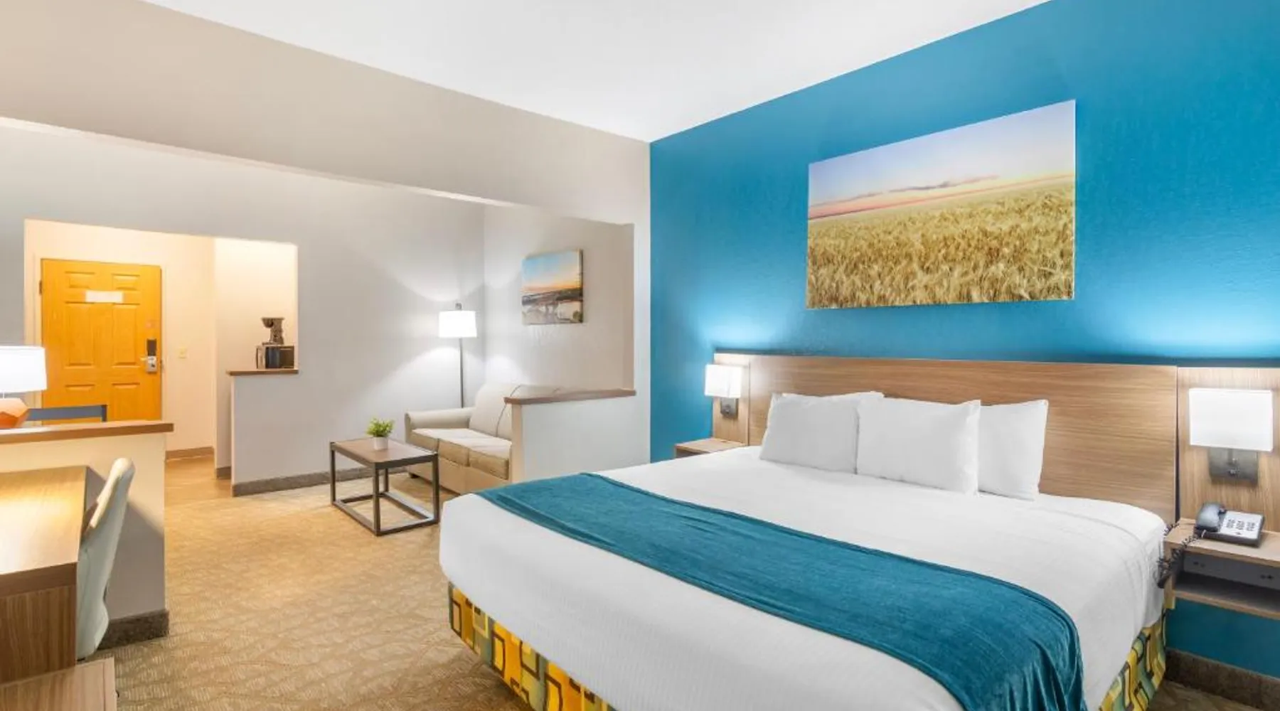 Comfortable Accommodations: EverSpring Suites in Bismarck offers comfortable rooms with air-conditioning, private bathrooms, and city views. Each room includes a sofa bed, work desk, and free WiFi. Relaxing Facilities: Guests can enjoy a spa and wellness center, indoor swimming pool, and hot tub. Additional amenities include a bar, fitness center, and free on-site private parking. Convenient Location: Located 1.9 mi from Bismarck Municipal Airport, the hotel is a 17-minute walk from Dakota Zoo. Nearby attractions include North Dakota State Capitol and Bismarck State College, each 2.5 mi away. Guest Satisfaction: Highly rated for its attentive staff, room cleanliness, and comfortable beds. Boasting a flat-screen TV with cable, this suite is equipped with tea and coffee-making facilities, a fridge and microwave.