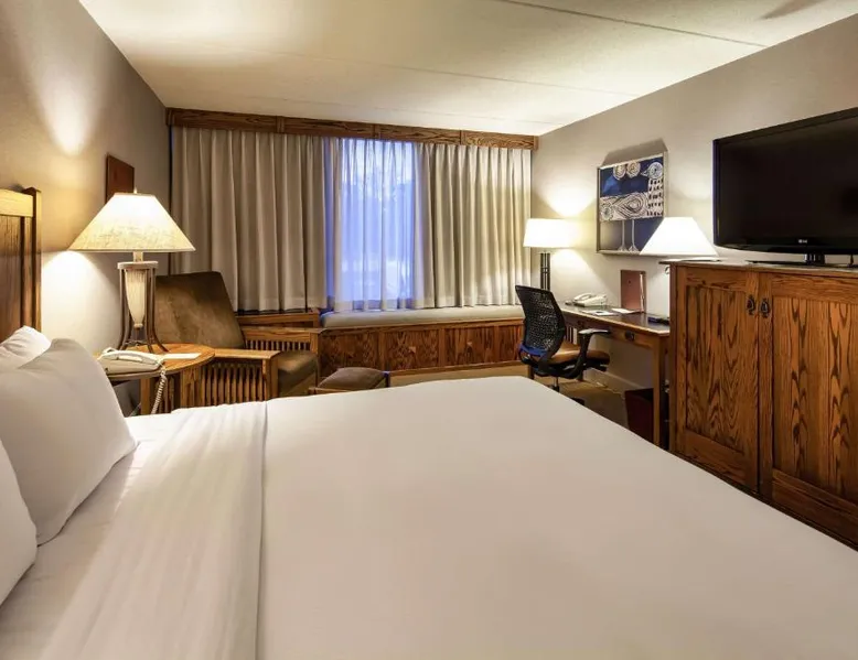 Comfortable Accommodations: Rooms feature air-conditioning, free WiFi, tea and coffee makers, and work desks. Additional amenities include bathrobes, spa baths, and sofa beds. Dining Options: The family-friendly restaurant serves American cuisine with vegetarian, vegan, and gluten-free options. Guests can enjoy lunch and dinner in a welcoming ambiance. Leisure Facilities: The hotel offers a fitness center, indoor swimming pool, sun terrace, and hot tub. Free on-site parking and an outdoor play area cater to families. Convenient Location: Located in Mundelein, the property is 22 mi from Chicago O'Hare International Airport. Nearby attractions include an ice-skating rink and various museums. This room features a small seating area with a chair, cable TV, and an in-suite safe.