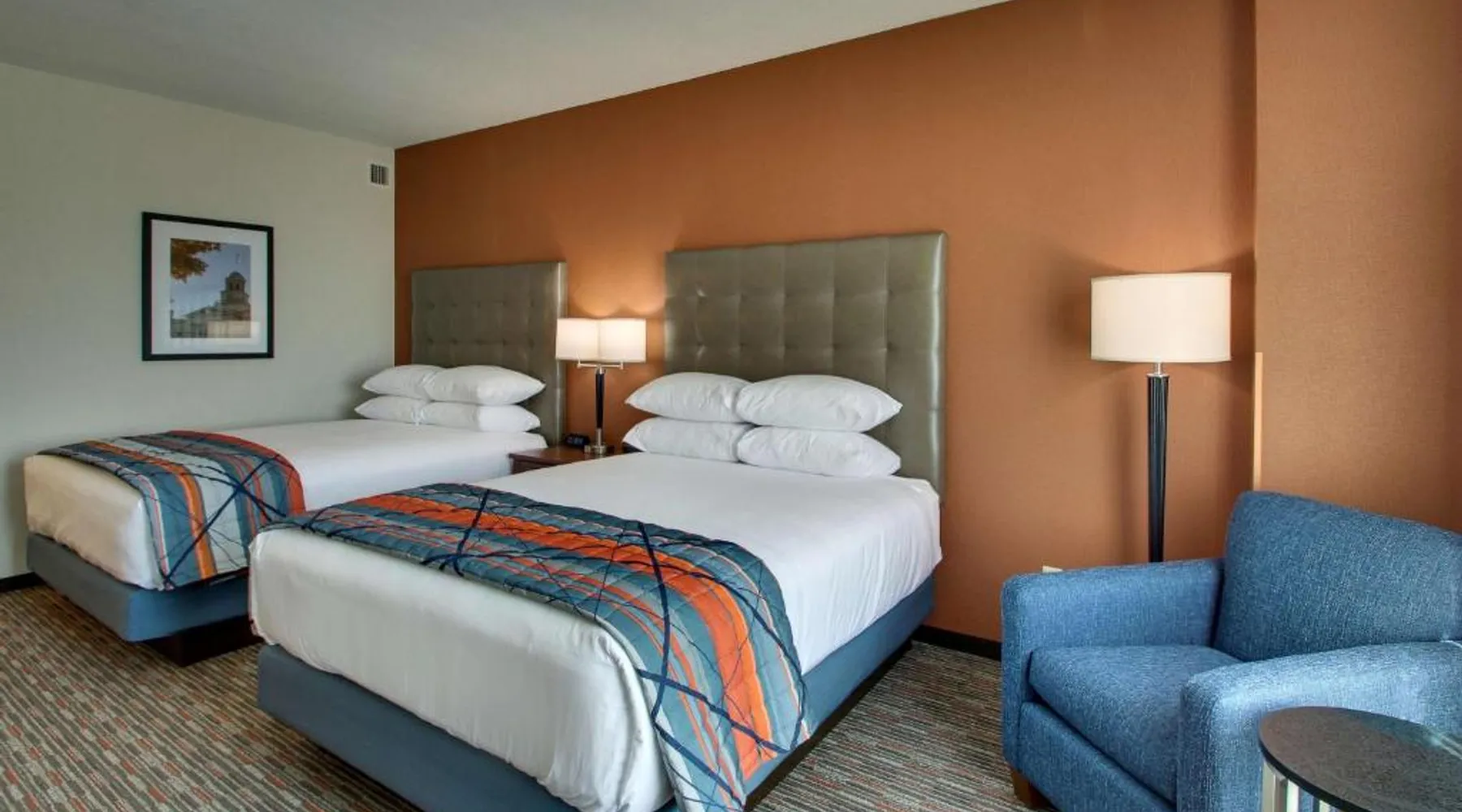 Comfortable Accommodations: Drury Inn & Suites Iowa City Coralville in Coralville offers family rooms with air-conditioning, private bathrooms, and free WiFi. Each room includes a work desk, refrigerator, and TV. Leisure Facilities: Guests can enjoy a fitness center, outdoor swimming pool, and hot tub. Additional amenities include a elevator, business area, and free on-site private parking. Dining Options: A buffet breakfast is provided each morning, along with dinner options. The property staff and service support receive high ratings from guests. Nearby Attractions: Kinnick Stadium is 2.5 mi away, Paramount Theater 24 mi, and The Eastern Iowa Airport 19 mi from the hotel. This air-conditioned quadruple room is consisted of of a flat-screen TV with cable channels and a private bathroom. The unit has 2 beds.
