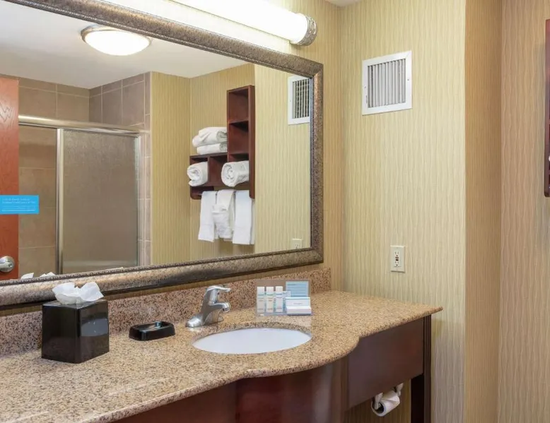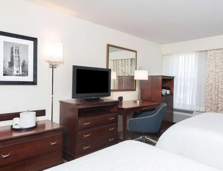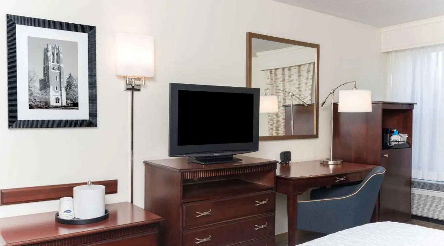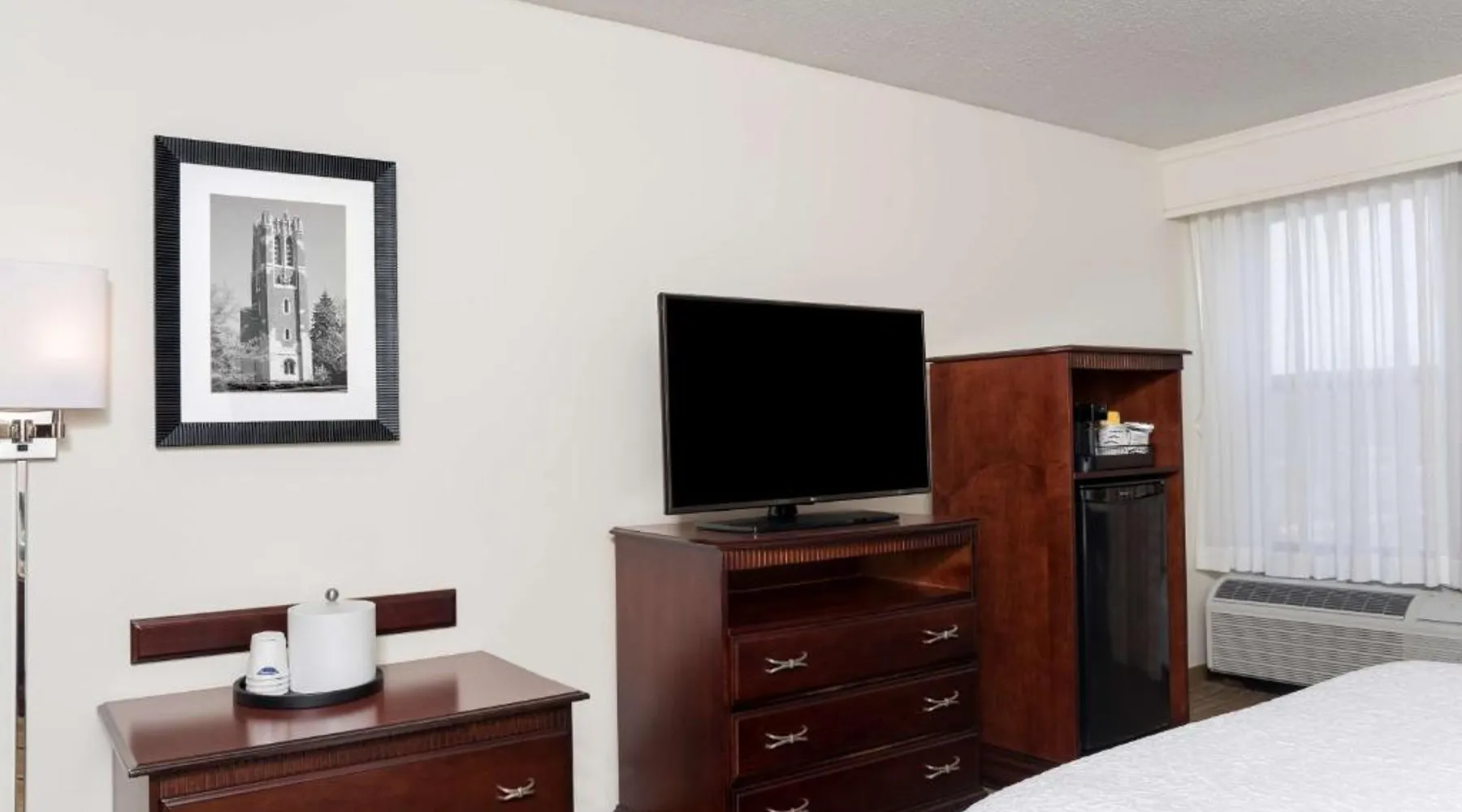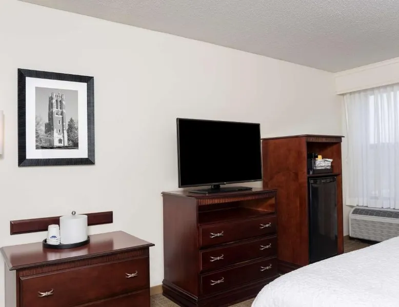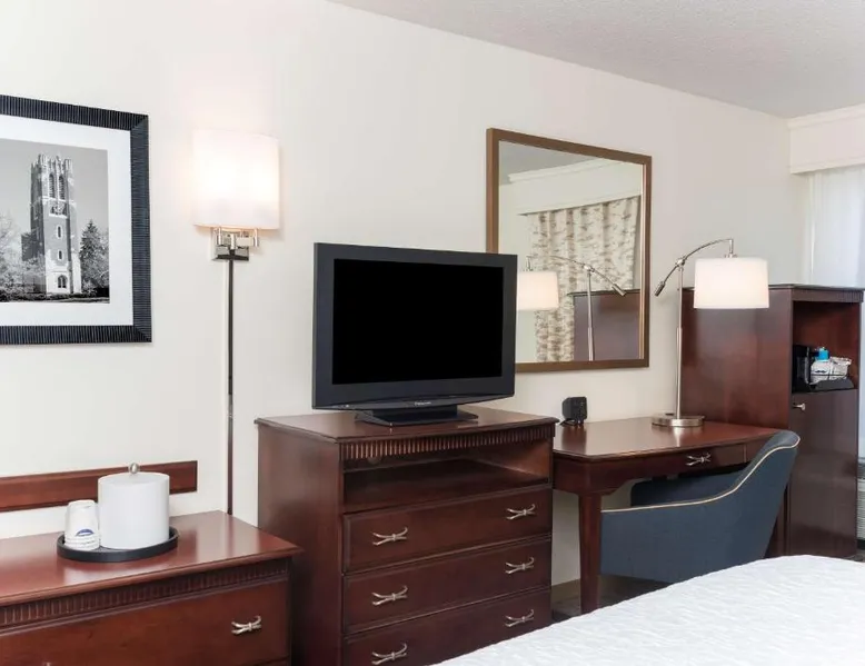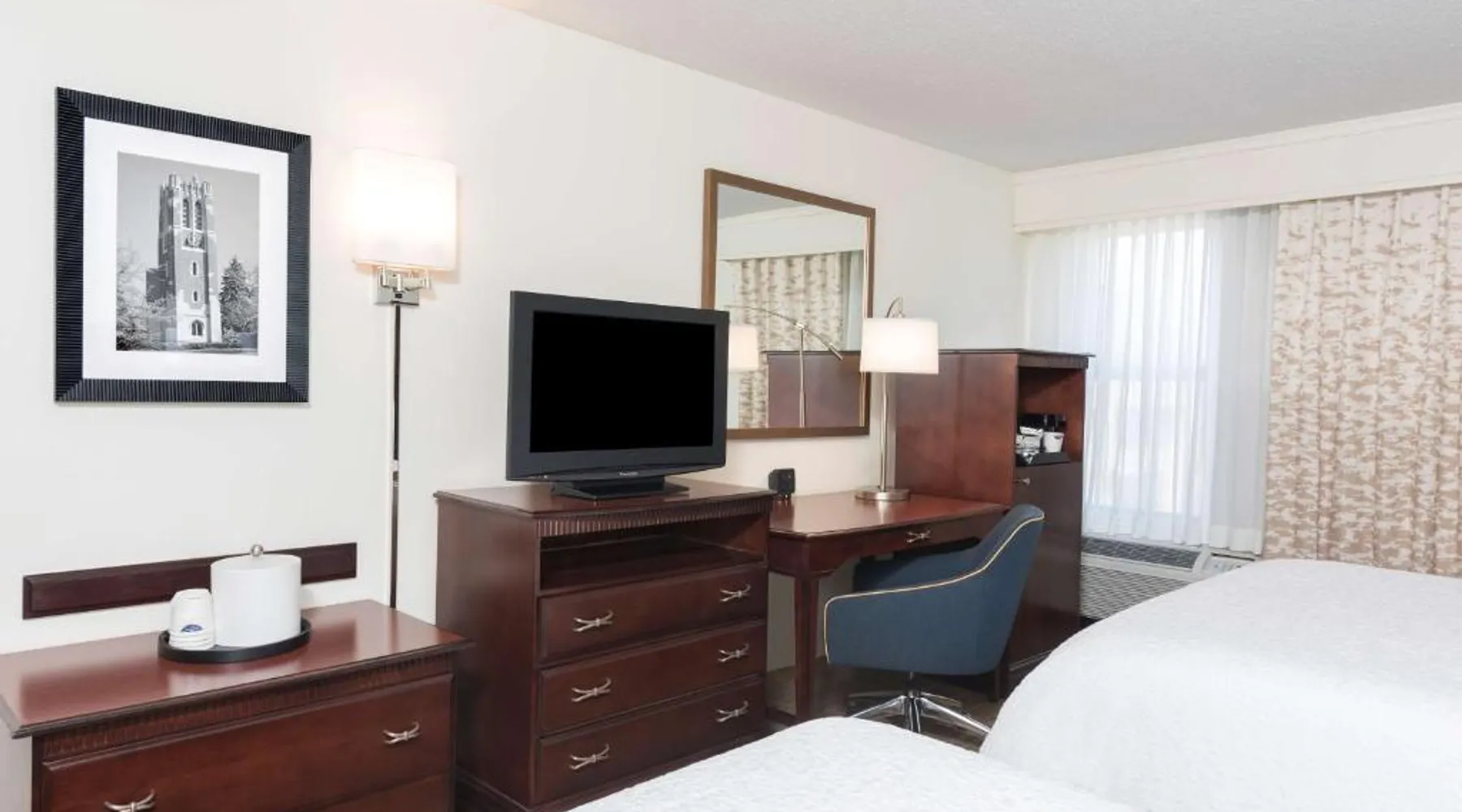 Comfortable Accommodations: Hampton Inn East Lansing in East Lansing offers family rooms with sofa beds and seating areas. Each room includes a tea and coffee maker, hairdryer, refrigerator, microwave, shower, and TV. Exceptional Facilities: Guests enjoy an indoor swimming pool, fitness center, and free WiFi. Additional amenities include a fitness room, elevator, 24-hour front desk, daily housekeeping service, business area, full-day security, and luggage storage. Delicious Breakfast: A continental, American, or buffet breakfast is served with warm dishes. The property staff provide excellent service support, ensuring a pleasant stay. Prime Location: Located 6.8 mi from Capital Region International Airport, the hotel is close to attractions such as Jack Breslin Arena and Wharton Center, both 2.8 mi away. Michigan State University is 3.1 mi from the property. This room features a spa bath, and flat-screen TV. A microwave and small refrigerator are also included.