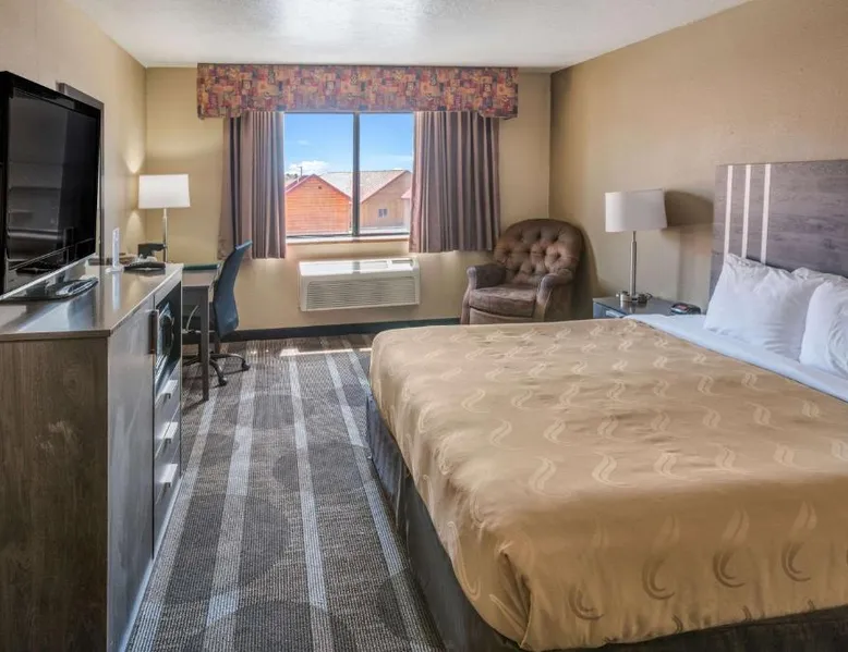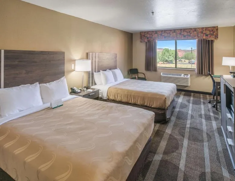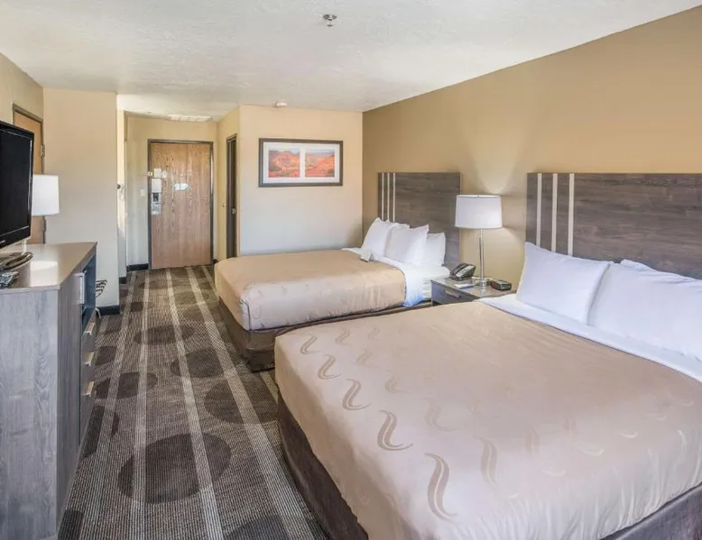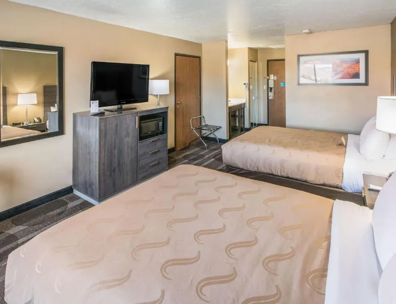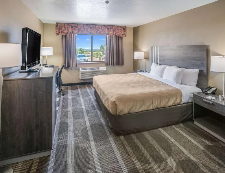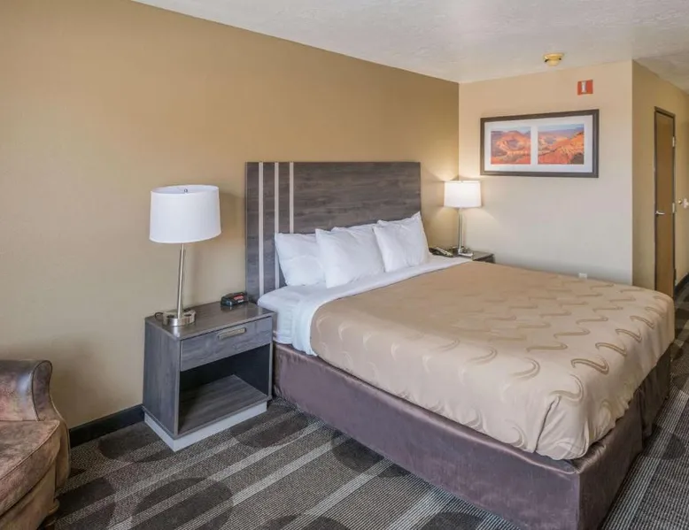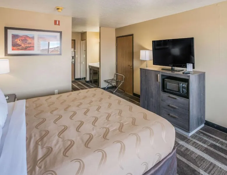 Quality Inn Kanab is located in the city of Kanab, located between Bryce Canyon National Park, the North Rim of Grand Canyon National Park and Zion National Park. This Kanab, UT hotel is a great place to stay for those who enjoy outdoor recreation. With so many diverse wilderness areas, national monuments and parks in the region, there's always something to do. Kanab is located in Kane County and is often called Little Hollywood because so many movies have been filmed in the area. Several exciting festivals and events are hosted throughout the year. If visiting in August, don't miss the annual Western Legends Roundup celebration, the world's only cowboy poetry rodeo competition. Guests of this Kanab, UT hotel can enjoy amenities and features like free wireless high-speed Internet access, free coffee, free local calls and it is a pet-friendly hotel (additional fees apply). Enjoy our free hot breakfast featuring eggs, meat, yogurt, fresh fruit, cereal and more. After a busy day of sightseeing and adventure, relax in the outdoor pool and hot tub. Access to copy and fax services is offered. Laundry facilities are located on the premises for your added convenience. All guest rooms of this Utah hotel have coffee makers, curved shower rods, desks, hair dryers, irons, ironing boards and cable television. In addition, some rooms come equipped with microwaves and refrigerators. Ask about rooms with whirlpool bathtubs. Nonsmoking rooms can be requested. The double room offers a tea and coffee maker and heating. The unit has 1 bed.