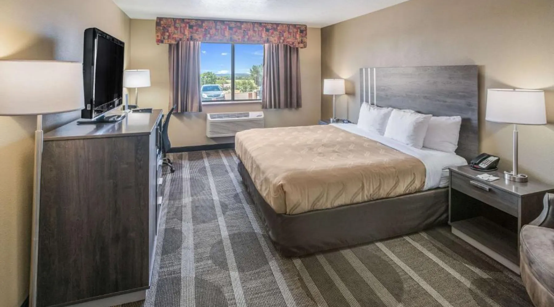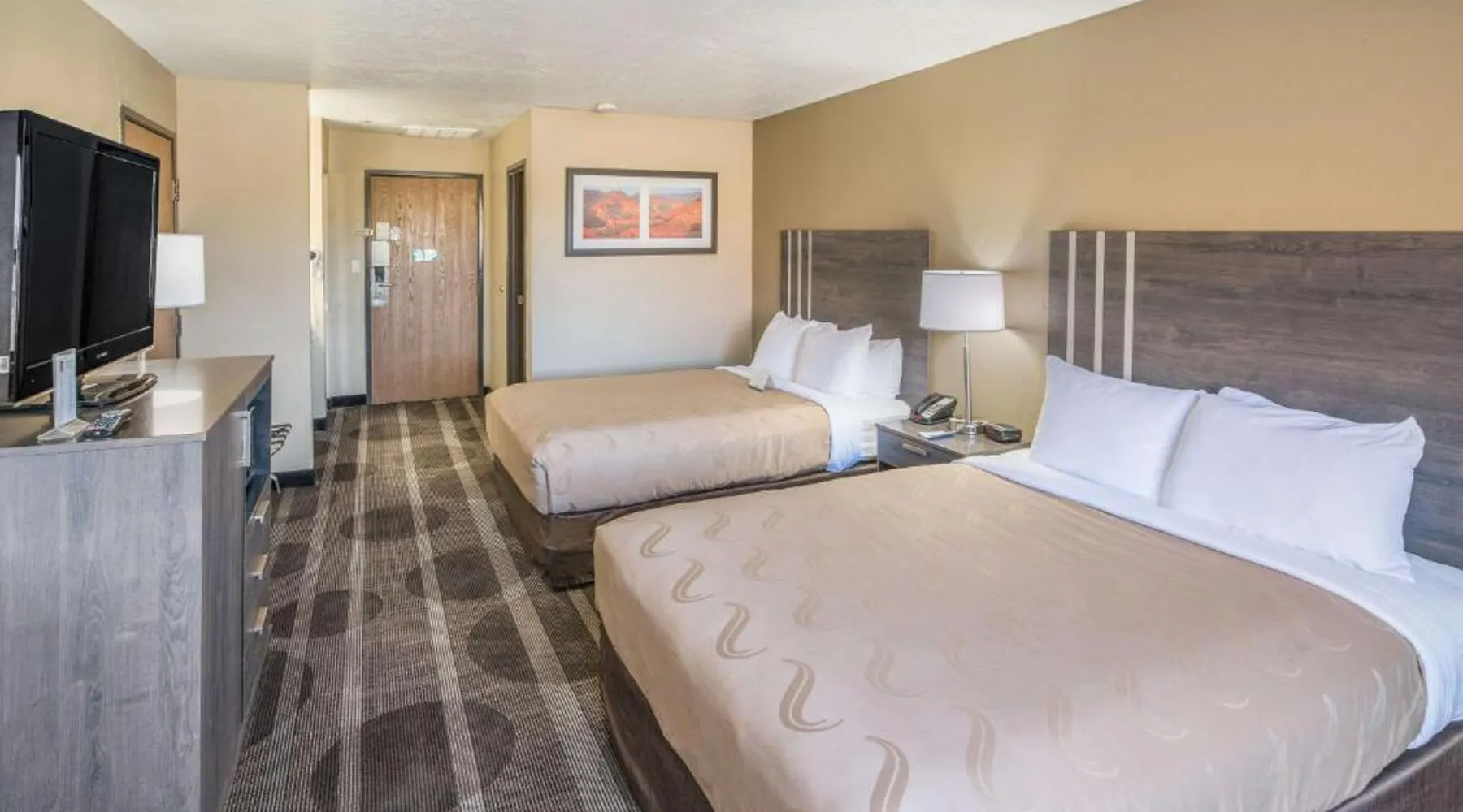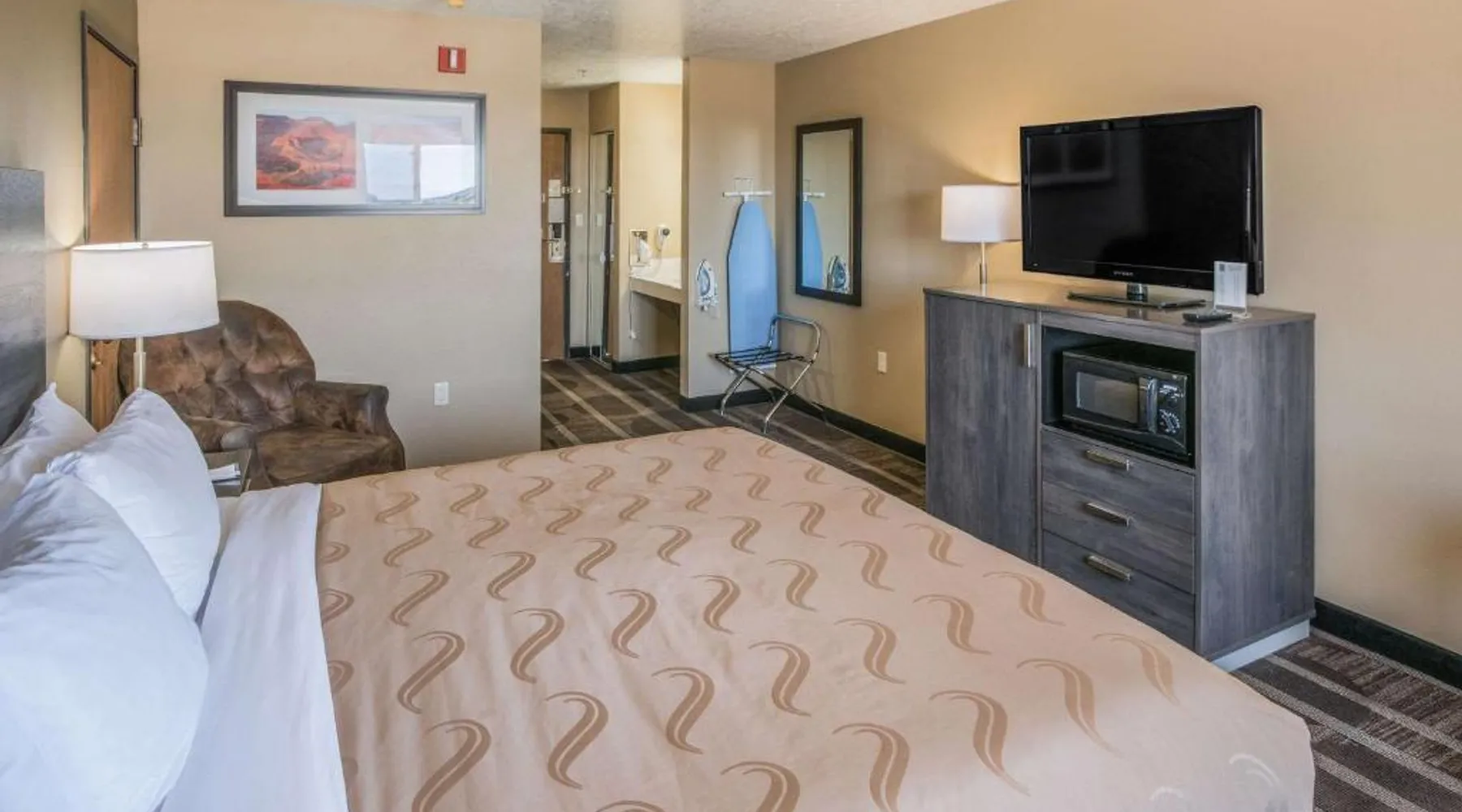 Quality Inn Kanab is located in the city of Kanab, located between Bryce Canyon National Park, the North Rim of Grand Canyon National Park and Zion National Park. This Kanab, UT hotel is a great place to stay for those who enjoy outdoor recreation. With so many diverse wilderness areas, national monuments and parks in the region, there's always something to do. Kanab is located in Kane County and is often called Little Hollywood because so many movies have been filmed in the area. Several exciting festivals and events are hosted throughout the year. If visiting in August, don't miss the annual Western Legends Roundup celebration, the world's only cowboy poetry rodeo competition. Guests of this Kanab, UT hotel can enjoy amenities and features like free wireless high-speed Internet access, free coffee, free local calls and it is a pet-friendly hotel (additional fees apply). Enjoy our free hot breakfast featuring eggs, meat, yogurt, fresh fruit, cereal and more. After a busy day of sightseeing and adventure, relax in the outdoor pool and hot tub. Access to copy and fax services is offered. Laundry facilities are located on the premises for your added convenience. All guest rooms of this Utah hotel have coffee makers, curved shower rods, desks, hair dryers, irons, ironing boards and cable television. In addition, some rooms come equipped with microwaves and refrigerators. Ask about rooms with whirlpool bathtubs. Nonsmoking rooms can be requested. The double room offers a tea and coffee maker and heating. The unit has 1 bed.