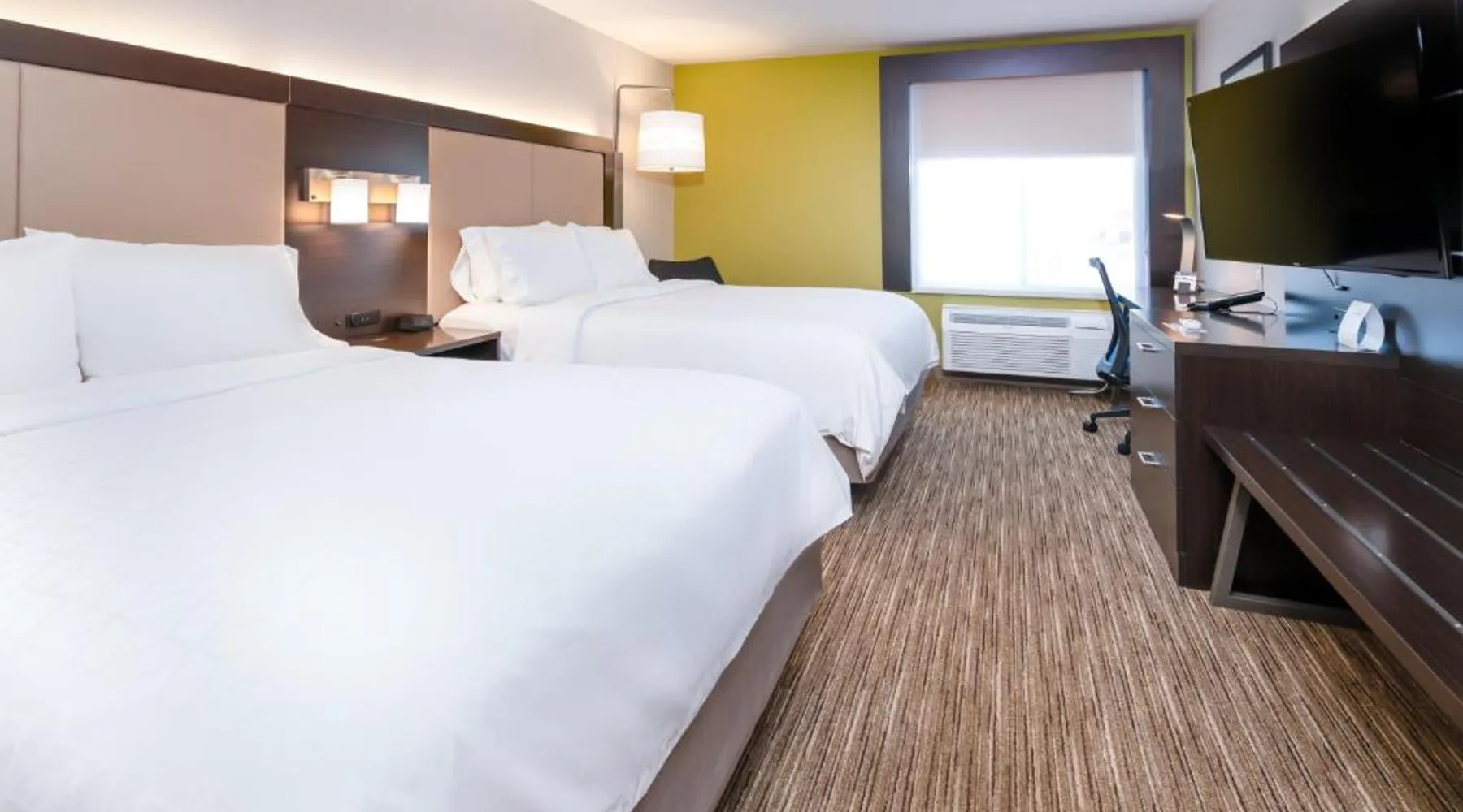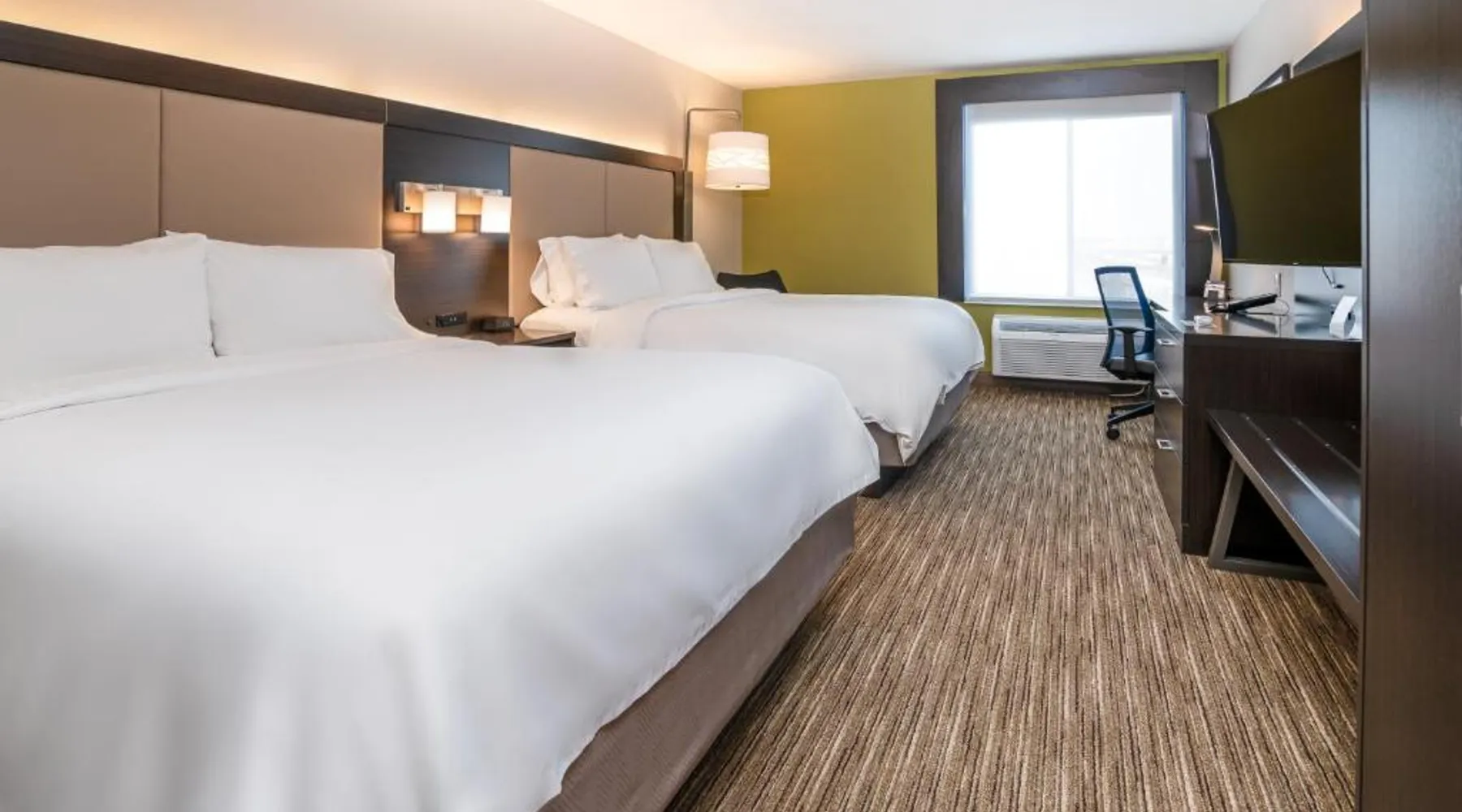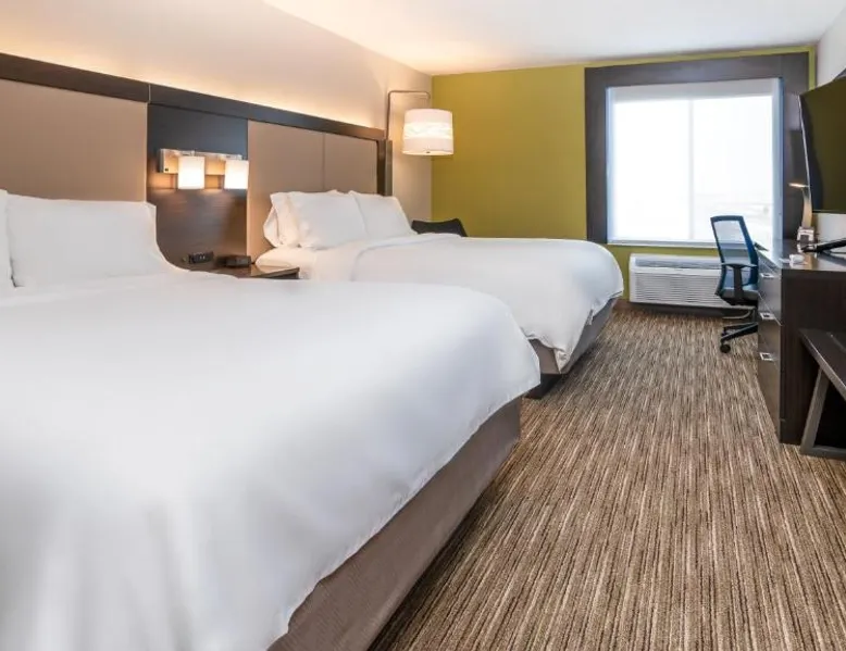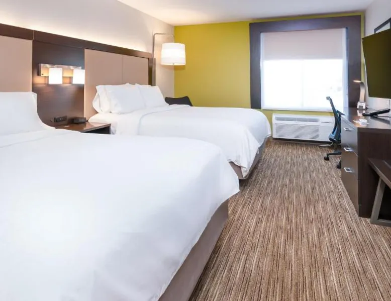 Comfortable Accommodations: Holiday Inn Express Hotel & Suites Coon Rapids - Blaine Area by IHG in Coon Rapids offers air-conditioned rooms with private bathrooms, free WiFi, and modern amenities. Each room includes a work desk, TV, and complimentary toiletries. Leisure Facilities: Guests can enjoy an indoor swimming pool, fitness center, and hot tub. Additional facilities include a elevator, 24-hour front desk, daily housekeeping, and free off-site private parking. Dining Options: A complimentary American buffet breakfast is served daily, featuring warm dishes, fresh pastries, pancakes, fruits, and juice. Location and Attractions: Located 22 mi from Minneapolis-Saint Paul International Airport, the hotel is near attractions such as Amc Theaters Coon Rapids 16 (1.5 mi) and Terrace Park (2.3 mi). An ice-skating rink is also in the vicinity. Queen Room with Two Queen Beds - Non-Smoking Offering free Wi-Fi and a 50-inch flat-screen cable TV, this room is equipped with a refrigerator and a microwave.