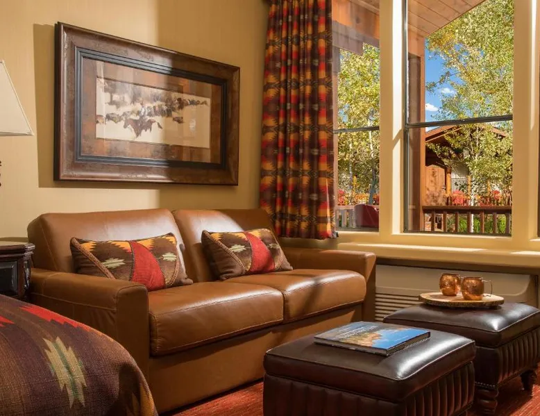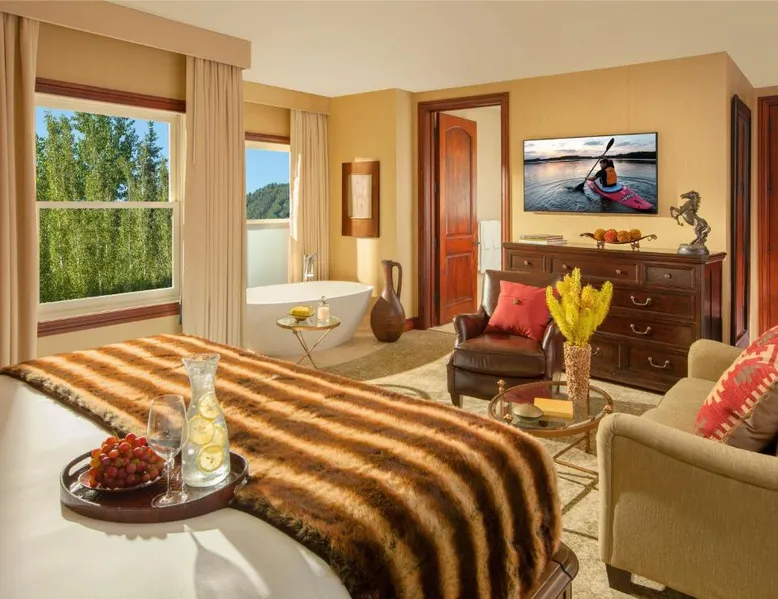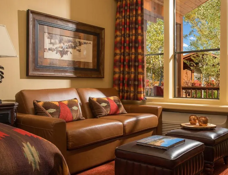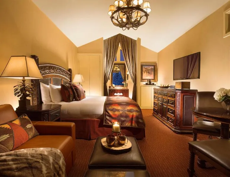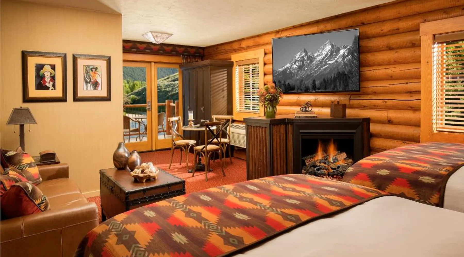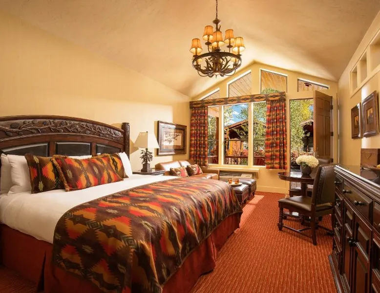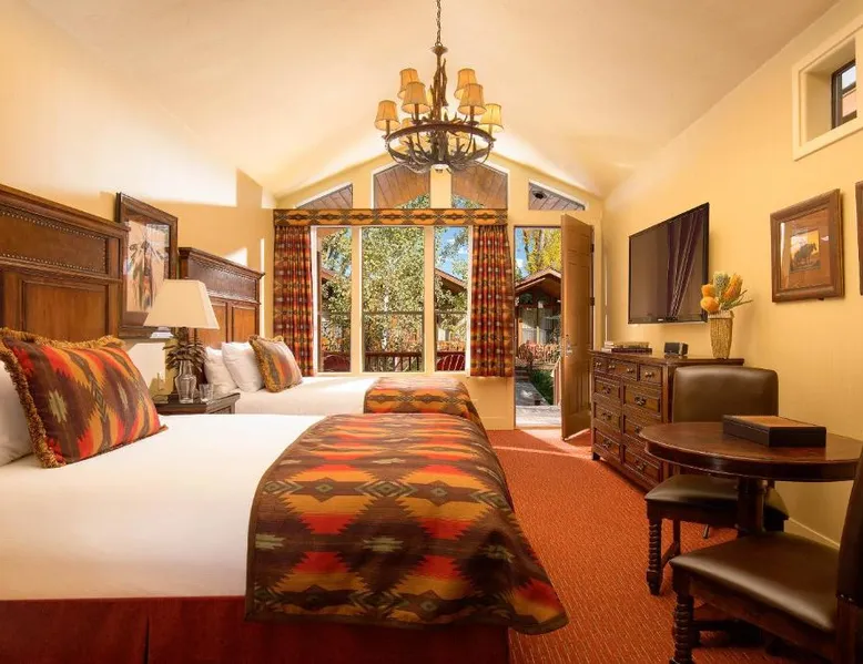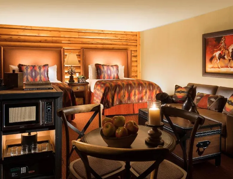 Live in the lap of luxury at the Rustic Inn Creekside Resort and Spa at Jackson Hole. This palatial resort features exclusive amenities, outdoor pool and Jacuzzi, daily breakfast buffet, fitness center, and a 2,300 square foot spa. Accommodations choices include spacious guest rooms, private cabins and luxury spa suites. The onsite restaurant offers locally-sourced, seasonal menus, and an extensive wine list. For adventure seekers, the resort is just a short drive from the south entrance of the nation's first National Park, and guests can also purchase ski passes, rentals for ski equipment, storage, and bikes on site. This room features flat-screen satellite TV, a small refrigerator and a coffee maker. A private bathroom with a rain shower is also included.