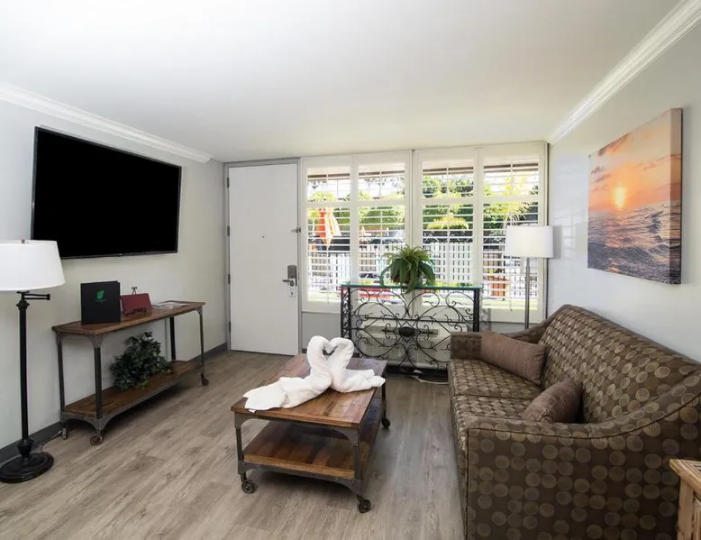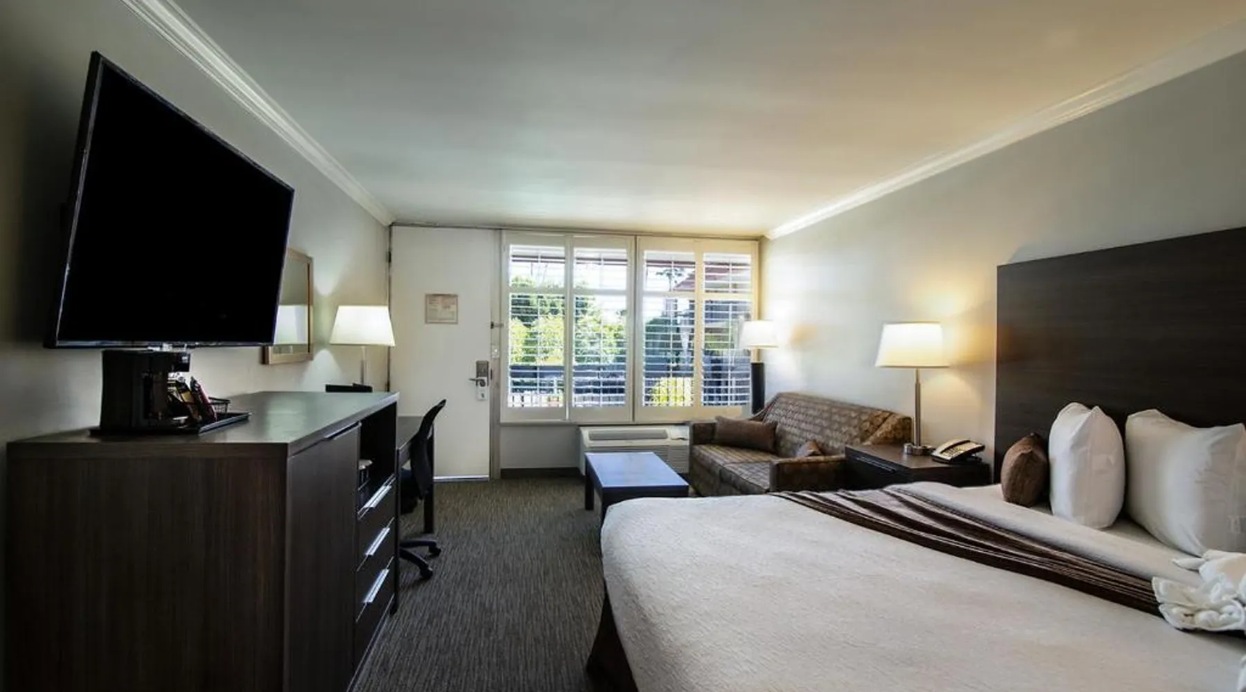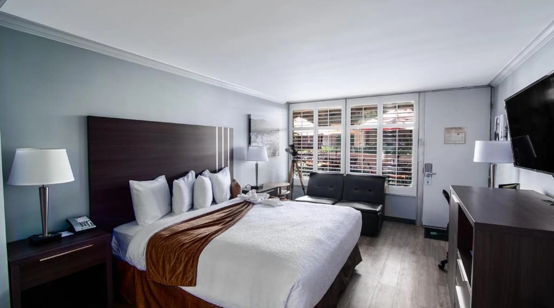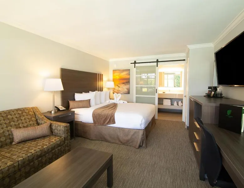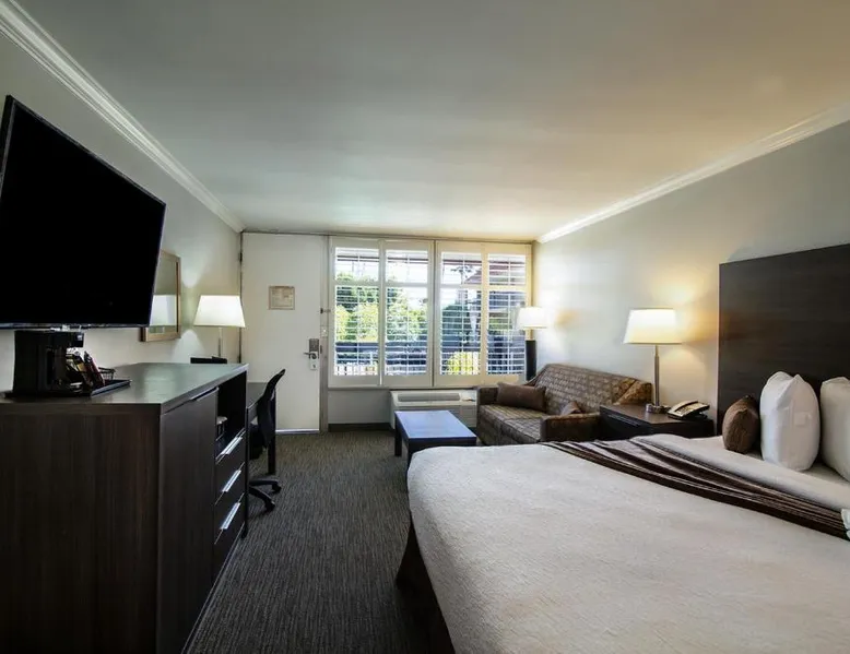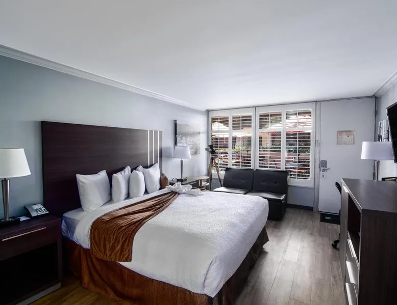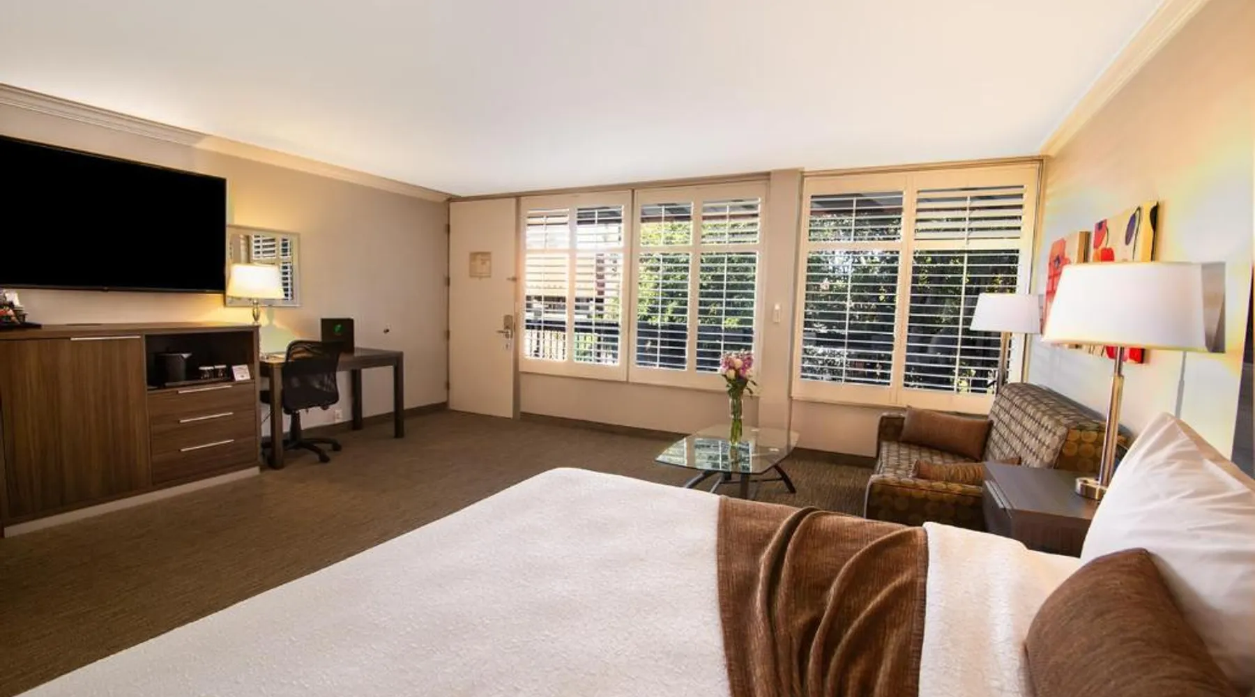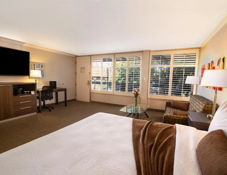 Located just 1.5 miles away from Amgen, this Thousand Oaks hotel includes free Wi-Fi. A hot continental breakfast buffet. A 42-inch HD cable flat-screen TV is featured at Palm Garden Hotel. A microwave, small refrigerator and coffee-making facilities are provided for convenience. Upscale, subtle-couloured linens and neutral décor furnish each guest room. A fitness center and business center are located on site. Enjoy an elevate dining experience at our on-site restaurant, Selvin’s Restaurant + Lounge. The Stagecoach Inn Museum is less than 1 mile away. The Ronald Reagan Library is 11 miles away. Bob Hope International Airport is 45 minutes’ drive away. Free Wi-Fi, a 55-inch HD cable flat-screen TV, microwave, small refrigerator and coffee-making facilities are included in this room.