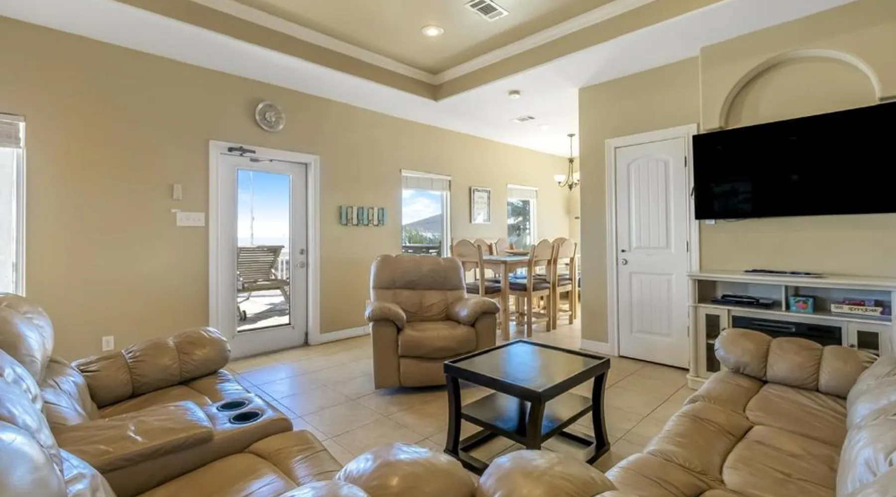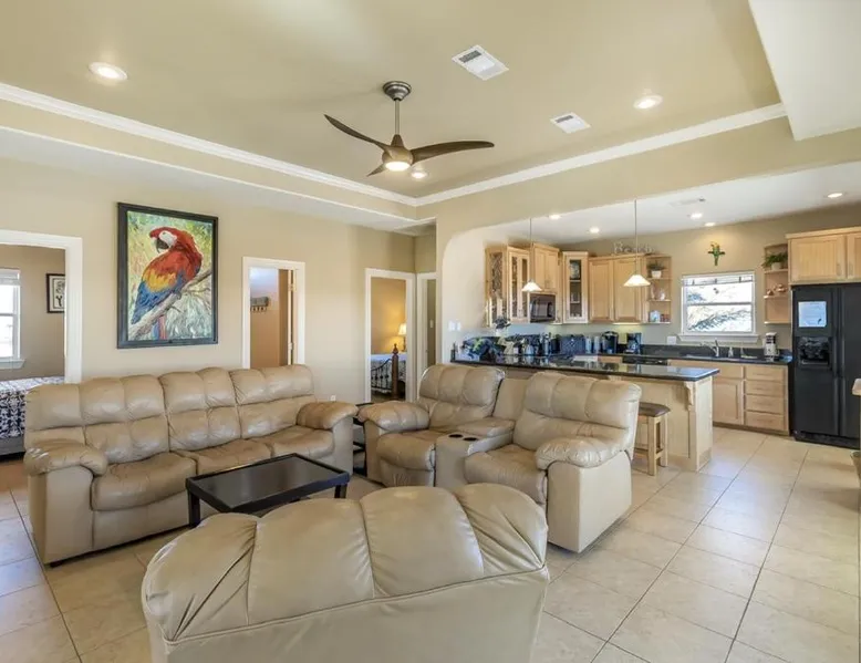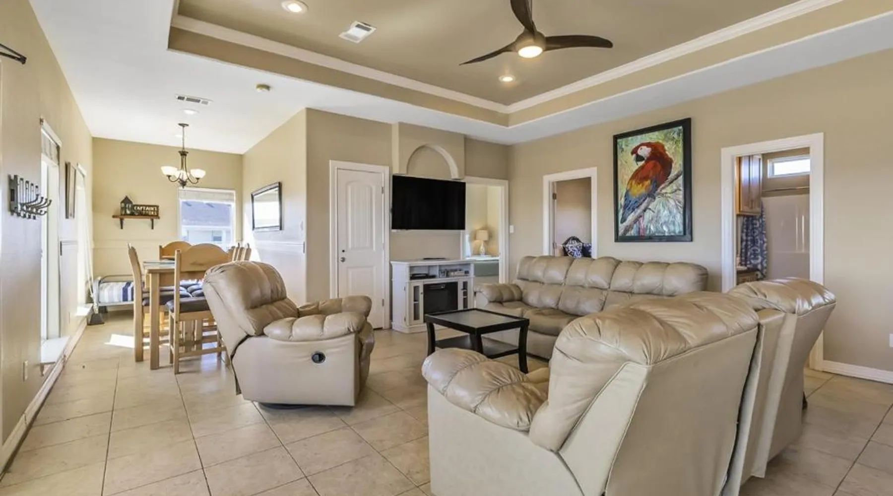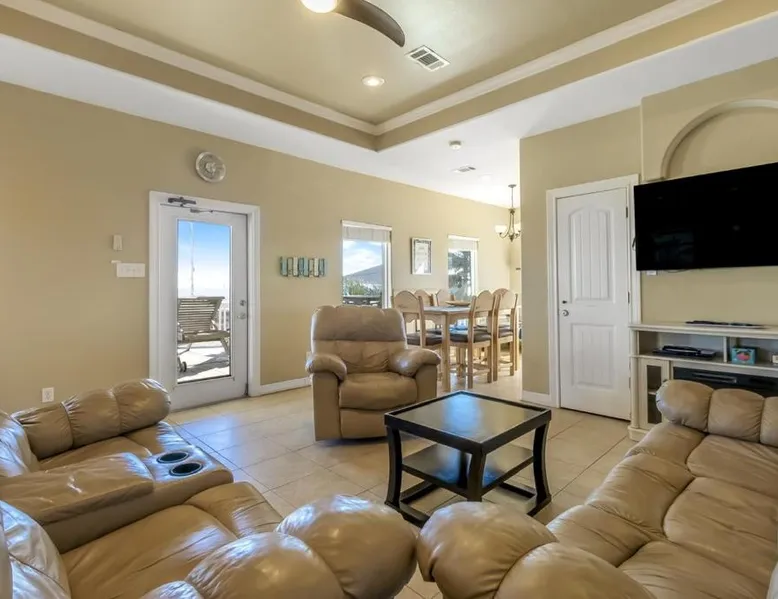 Beachfront Location: Parrot Head Home in Crystal Beach offers direct beachfront access and stunning sea views. Guests can relax on the sandy shores and enjoy the salty air. Modern Amenities: The holiday home features free WiFi, air-conditioning, and a fitness room. Additional amenities include a washing machine, fully equipped kitchen, barbecue, and streaming services. Comfortable Accommodations: With three bedrooms and two bathrooms, the property provides ample space for a comfortable stay. The kitchen is equipped with a refrigerator, microwave, dishwasher, toaster, and tea and coffee maker. Convenient Location: Located 57 mi from William P. Hobby Airport, Parrot Head Home is a few steps from Crystal Beach. Nearby attractions include Galveston Island and the Strand. The air-conditioned holiday home features 3 bedrooms, 2 bathrooms with a shower and a kitchen. The well-fitted kitchen has a refrigerator, a dishwasher, kitchenware and a microwave. The holiday home offers a TV with streaming services, a washing machine, a tea and coffee maker, a barbecue as well as sea views. The unit offers 5 beds.