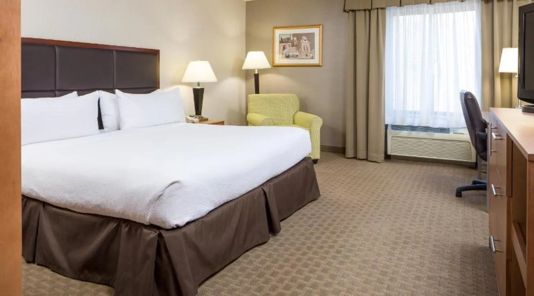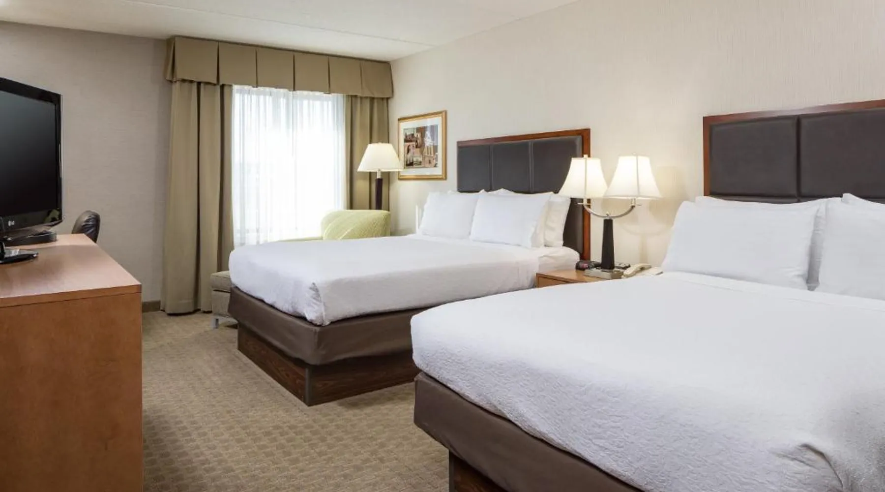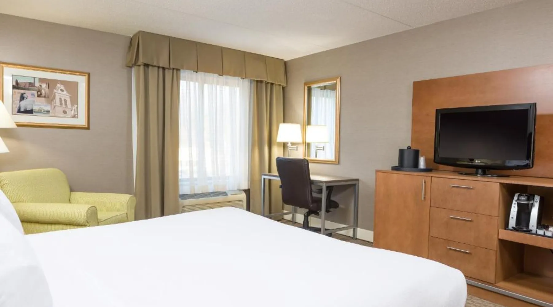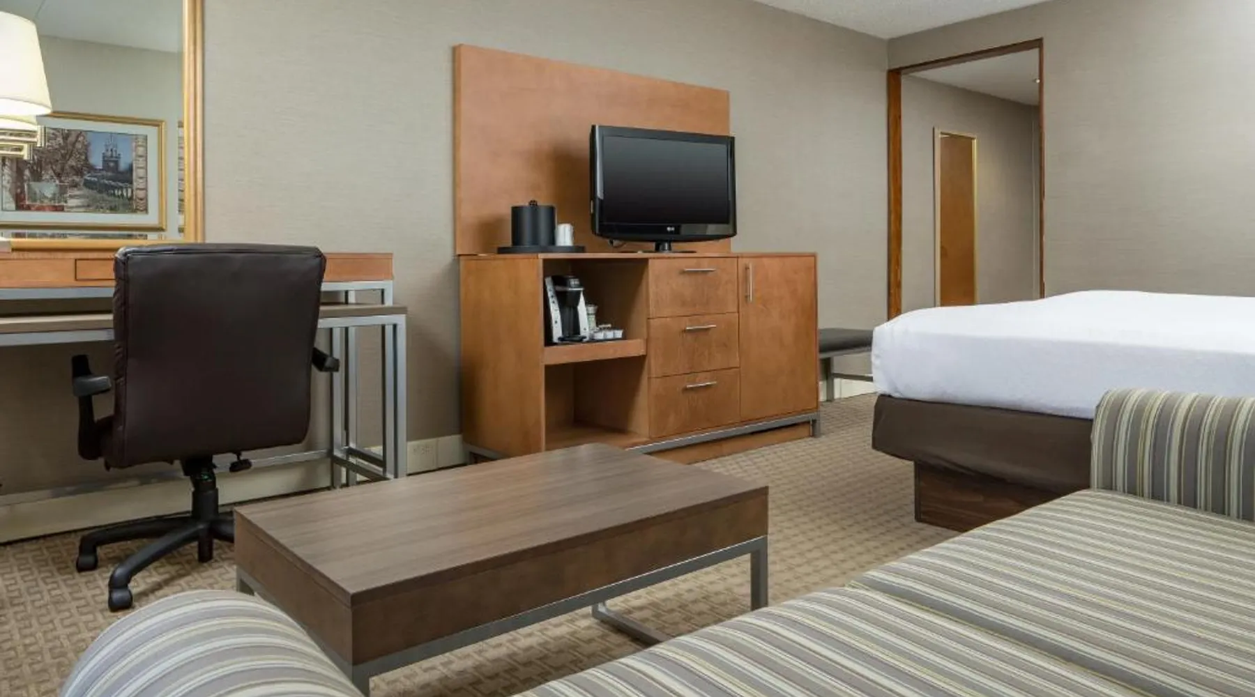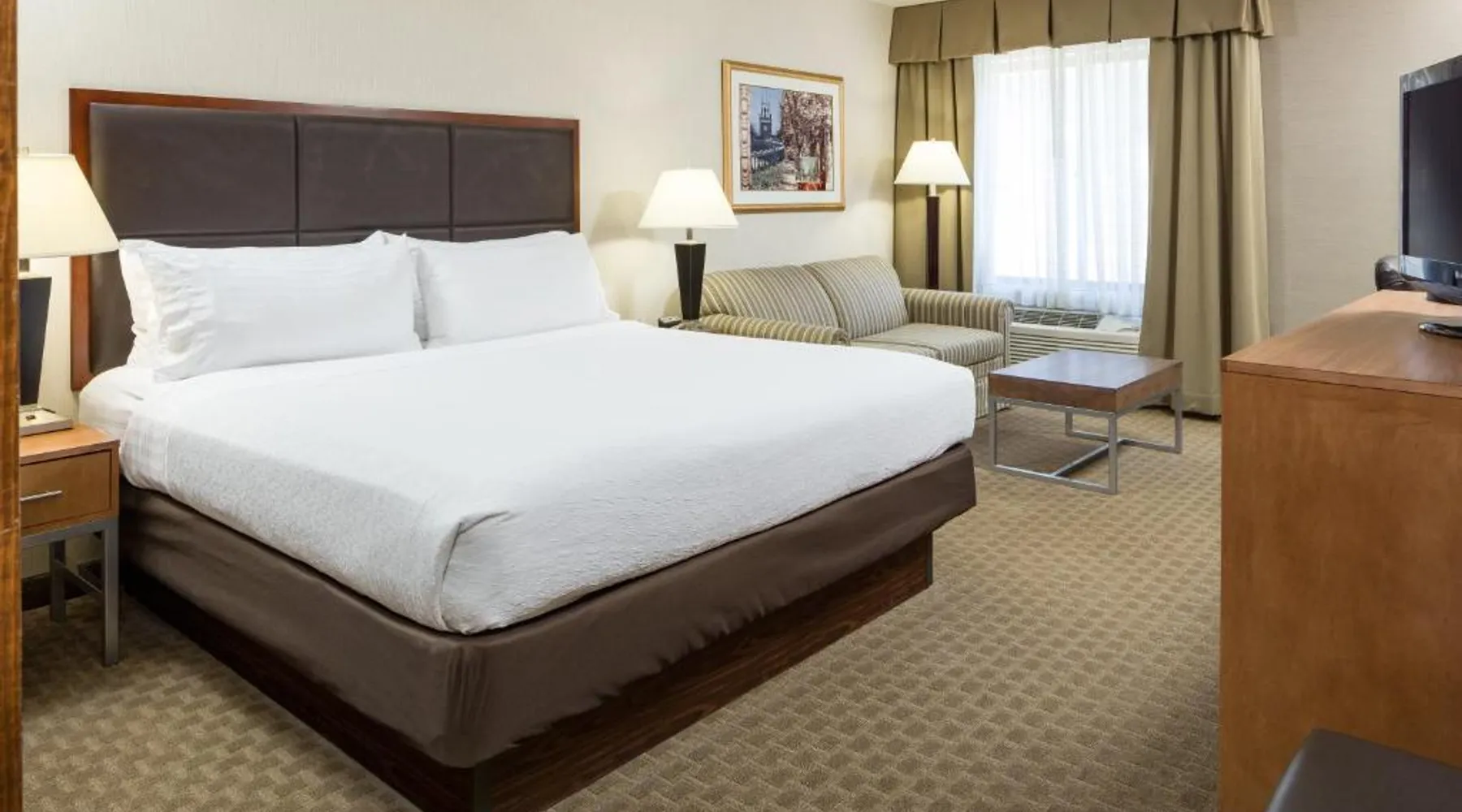 Comfortable Accommodations: Holiday Inn Manchester Airport by IHG in Manchester offers air-conditioned rooms with private bathrooms, free WiFi, and modern amenities. Each room includes a work desk, TV, and complimentary toiletries. Dining and Leisure: Guests can enjoy an American restaurant serving lunch and dinner with vegetarian, vegan, gluten-free, and dairy-free options. The on-site fitness center, indoor swimming pool, and hot tub provide leisure activities. Convenient Location: Located 3.1 mi from Manchester Boston Regional Airport, the hotel is near attractions such as Mall Of New Hampshire (2.5 mi) and State Park (5.6 mi). Free airport shuttle service and paid on-site private parking are available. Room includes sofa bed.