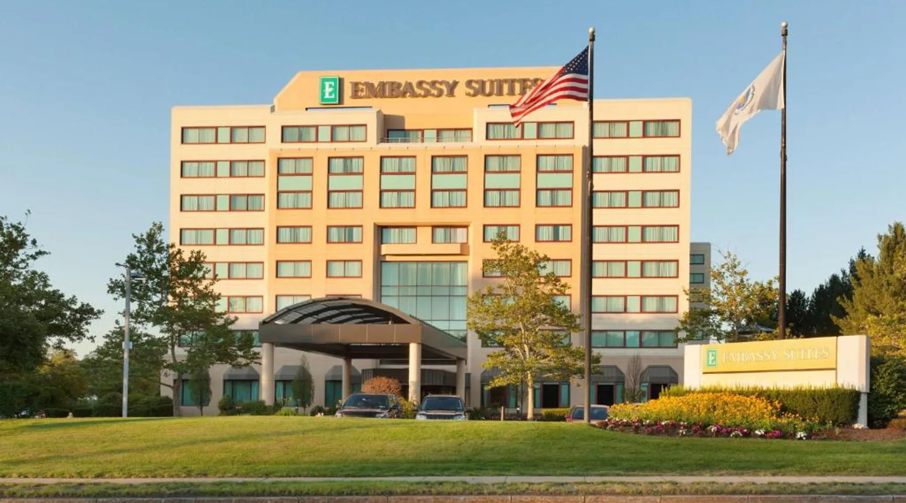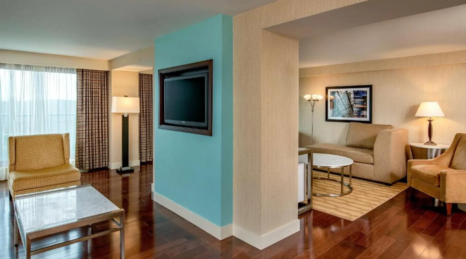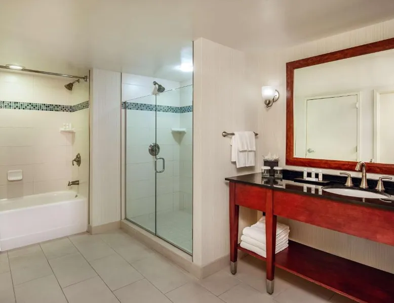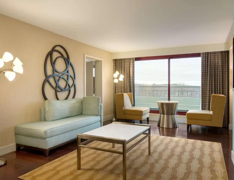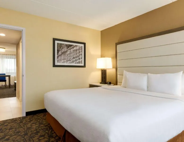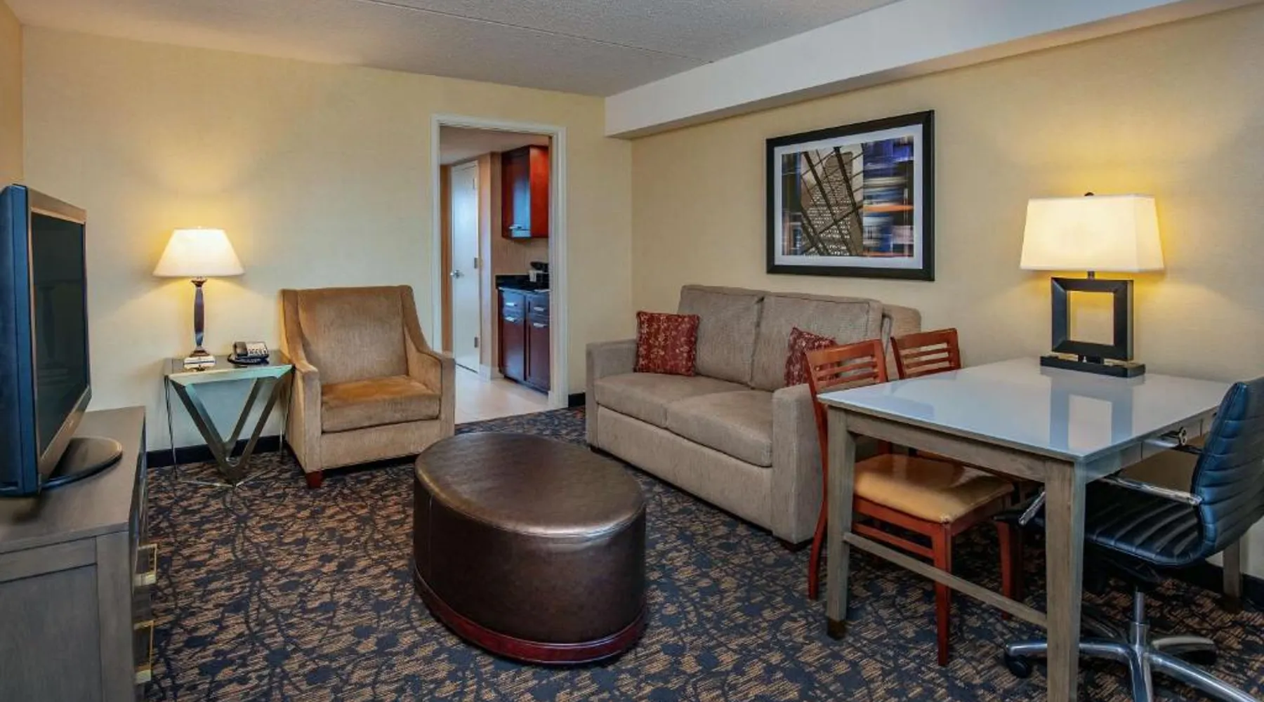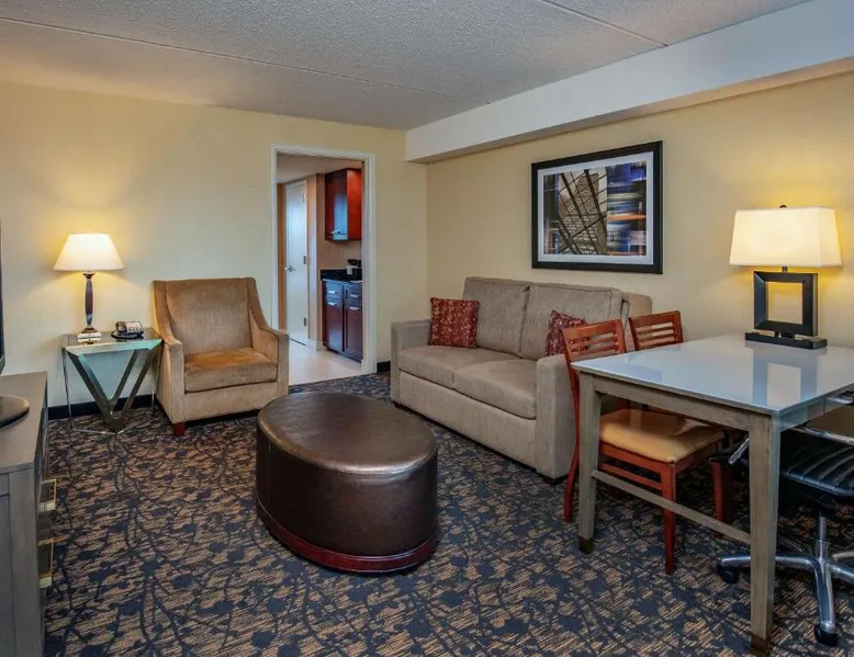 Located off Interstate 95 in Waltham, Massachusetts, this hotel is within a 20-minute drive from Brandeis University and Bentley University. It features on-site dining and a heated indoor pool. Each suite at this Waltham Embassy Suites is decorated in Americana colors and includes a seating area with a sofa bed and 40 inch Smart TVs with Hilton Connect, which allows you to log into your Netflix or Showtime Accounts. A large work desk is provided as well as a microwave and refrigerator. The on-site gym features a variety of cardio equipment and free weights. A 24-hour convenience store and a business center are located off of the lobby. The Grille at Hobbs Brook, also part of this Waltham hotel, serves contemporary American dishes. Its breakfast buffet includes eggs, pancakes, and fresh fruit. The Atrium Lounge is located on the eight floor and offers drinks in a casual atmosphere. Hanscom Air Force Base is 6.3 mi from Embassy Suites Boston Waltham. Downtown Boston is 14 mi away. This one-bedroom suite features a refrigerator and a microwave. It has a separate living area with a sofa bed, and a 40-inch Smart TV with Hilton Connect (Netflix or Showtime capabilities).