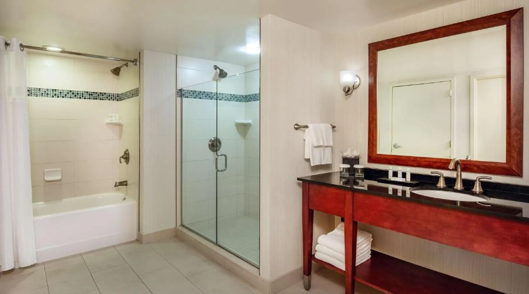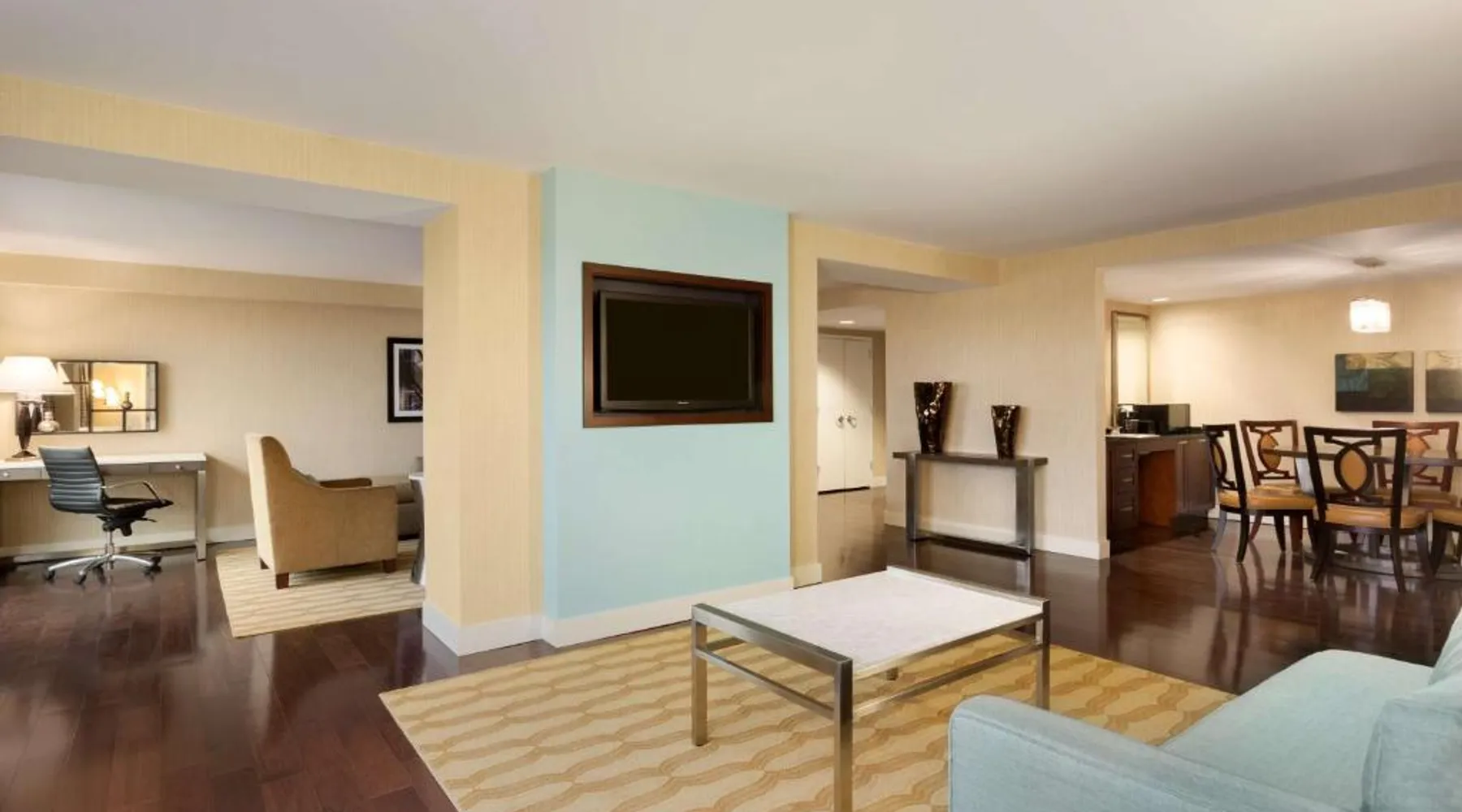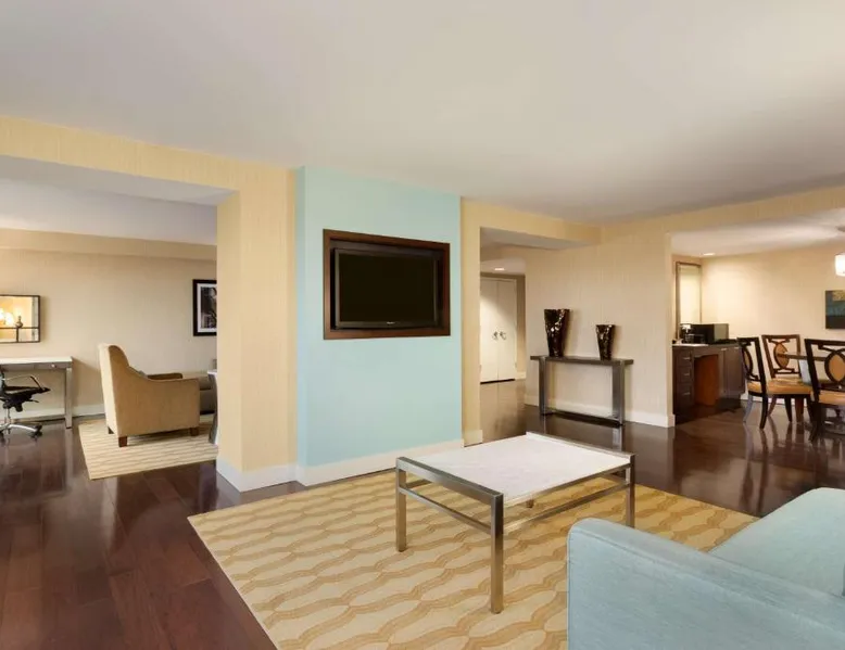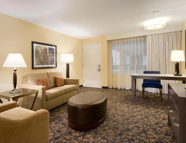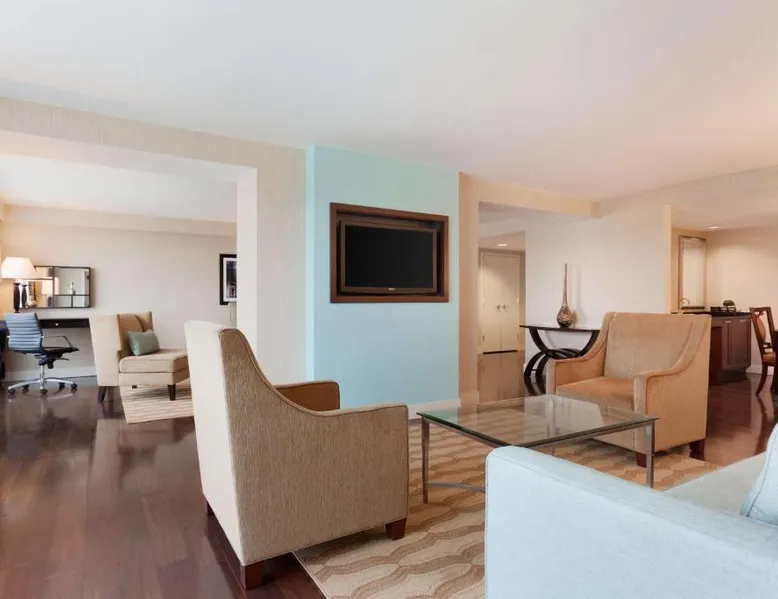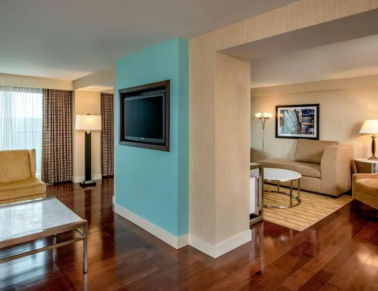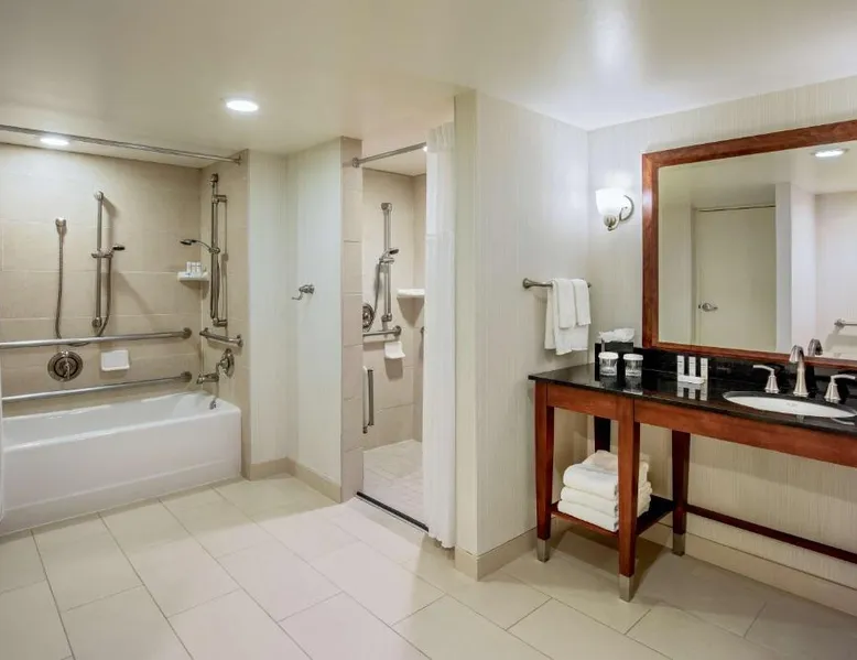 Located off Interstate 95 in Waltham, Massachusetts, this hotel is within a 20-minute drive from Brandeis University and Bentley University. It features on-site dining and a heated indoor pool. Each suite at this Waltham Embassy Suites is decorated in Americana colors and includes a seating area with a sofa bed and 40 inch Smart TVs with Hilton Connect, which allows you to log into your Netflix or Showtime Accounts. A large work desk is provided as well as a microwave and refrigerator. The on-site gym features a variety of cardio equipment and free weights. A 24-hour convenience store and a business center are located off of the lobby. The Grille at Hobbs Brook, also part of this Waltham hotel, serves contemporary American dishes. Its breakfast buffet includes eggs, pancakes, and fresh fruit. The Atrium Lounge is located on the eight floor and offers drinks in a casual atmosphere. Hanscom Air Force Base is 6.3 mi from Embassy Suites Boston Waltham. Downtown Boston is 14 mi away. This one-bedroom suite features a refrigerator and a microwave. It has a separate living area with a sofa bed, and a 40-inch Smart TV with Hilton Connect (Netflix or Showtime capabilities).