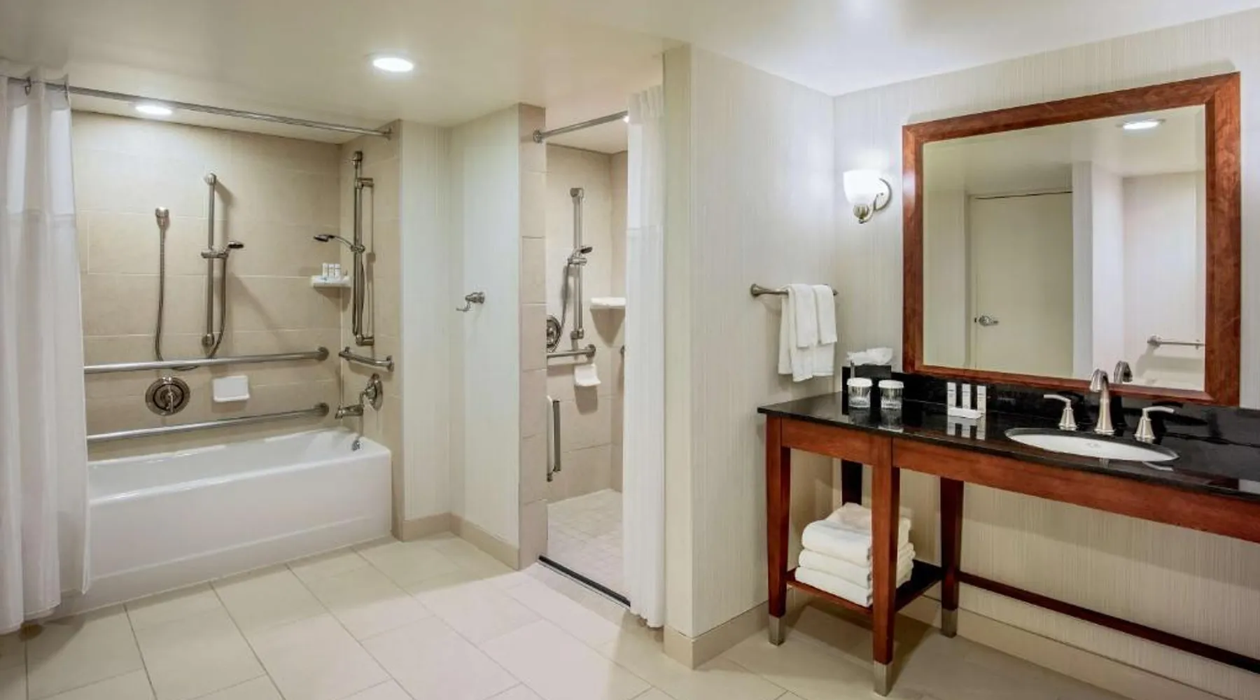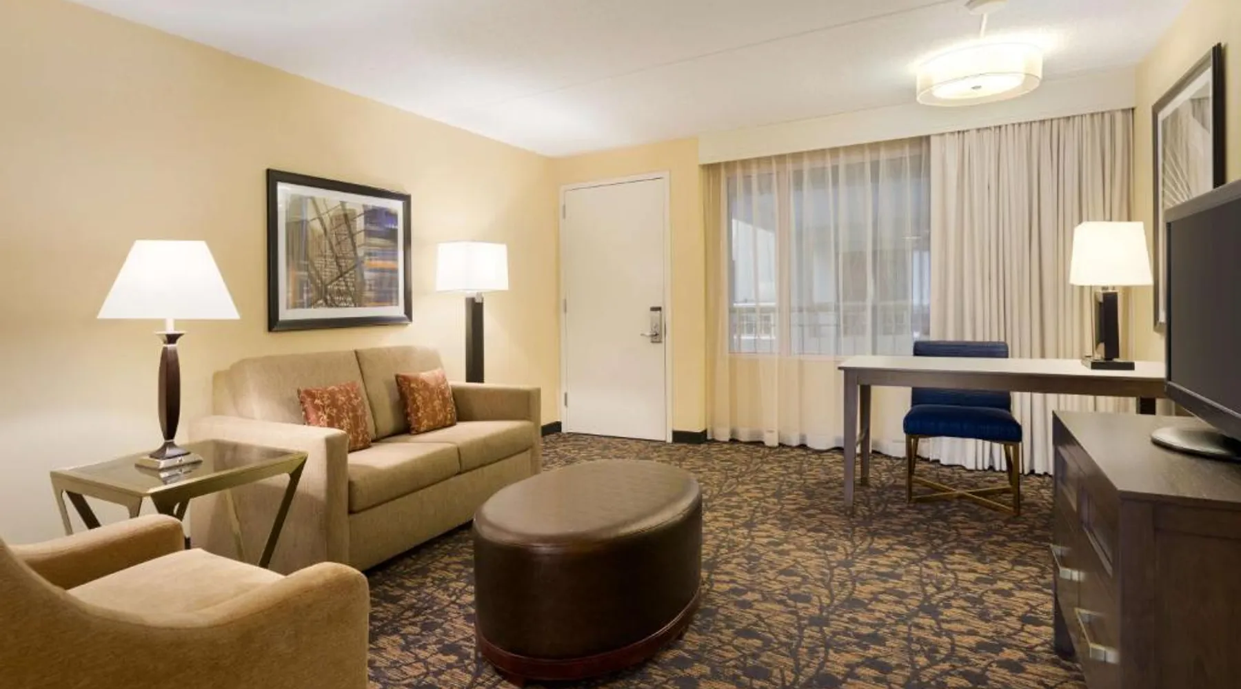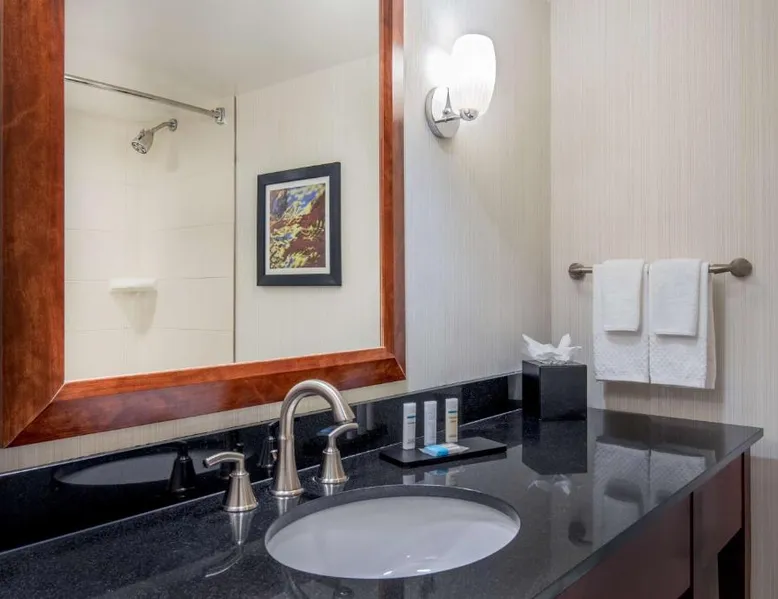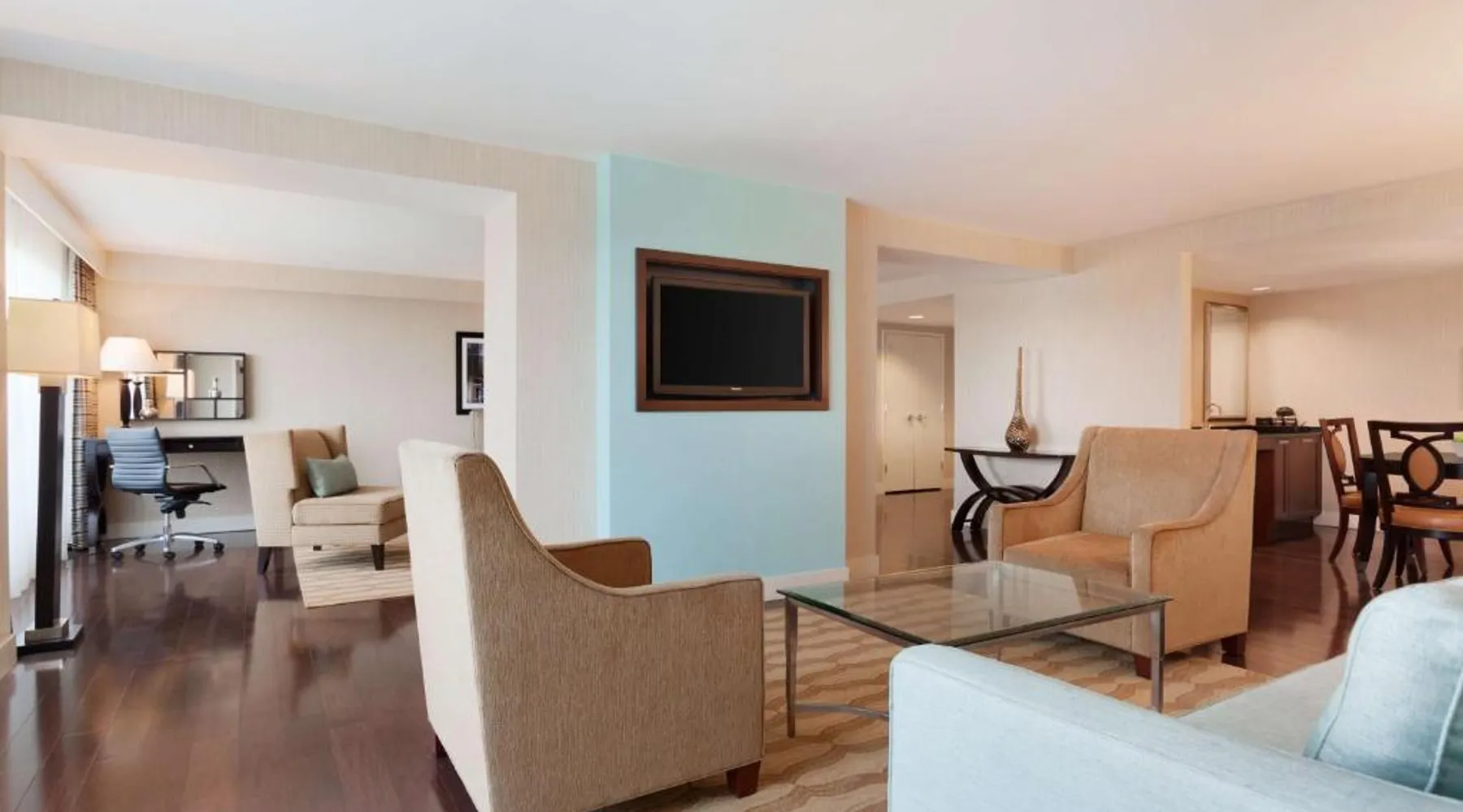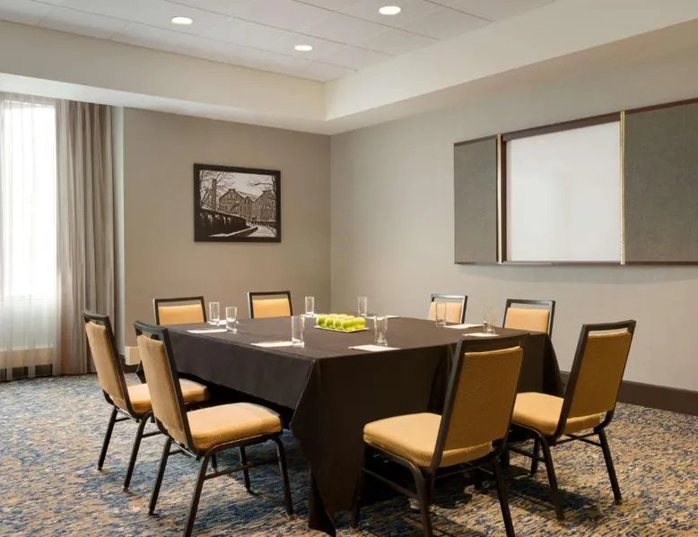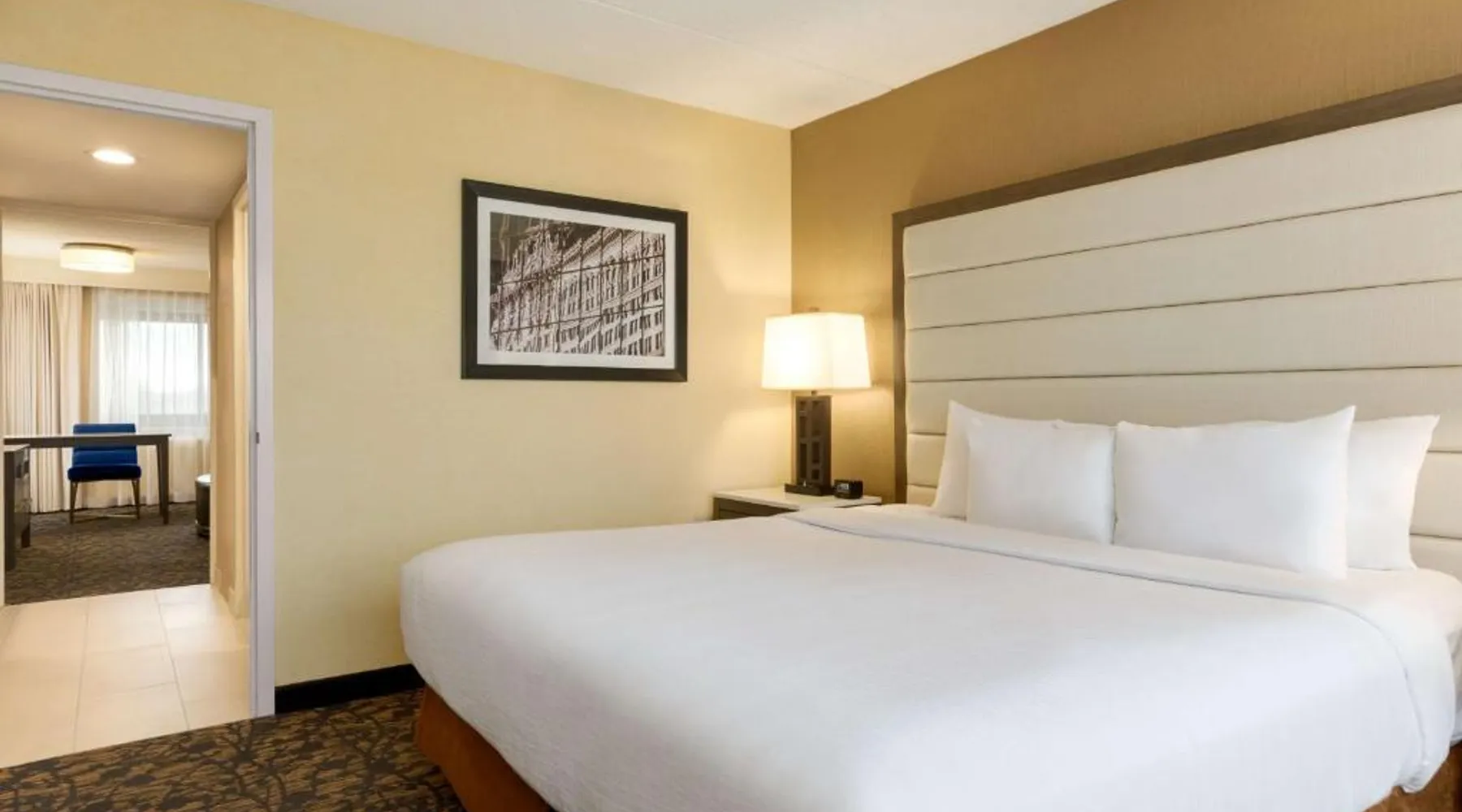 Located off Interstate 95 in Waltham, Massachusetts, this hotel is within a 20-minute drive from Brandeis University and Bentley University. It features on-site dining and a heated indoor pool. Each suite at this Waltham Embassy Suites is decorated in Americana colors and includes a seating area with a sofa bed and 40 inch Smart TVs with Hilton Connect, which allows you to log into your Netflix or Showtime Accounts. A large work desk is provided as well as a microwave and refrigerator. The on-site gym features a variety of cardio equipment and free weights. A 24-hour convenience store and a business center are located off of the lobby. The Grille at Hobbs Brook, also part of this Waltham hotel, serves contemporary American dishes. Its breakfast buffet includes eggs, pancakes, and fresh fruit. The Atrium Lounge is located on the eight floor and offers drinks in a casual atmosphere. Hanscom Air Force Base is 6.3 mi from Embassy Suites Boston Waltham. Downtown Boston is 14 mi away. This one-bedroom suite features a refrigerator and a microwave. It has a separate living area with a sofa bed, and a 40-inch Smart TV with Hilton Connect (Netflix or Showtime capabilities).