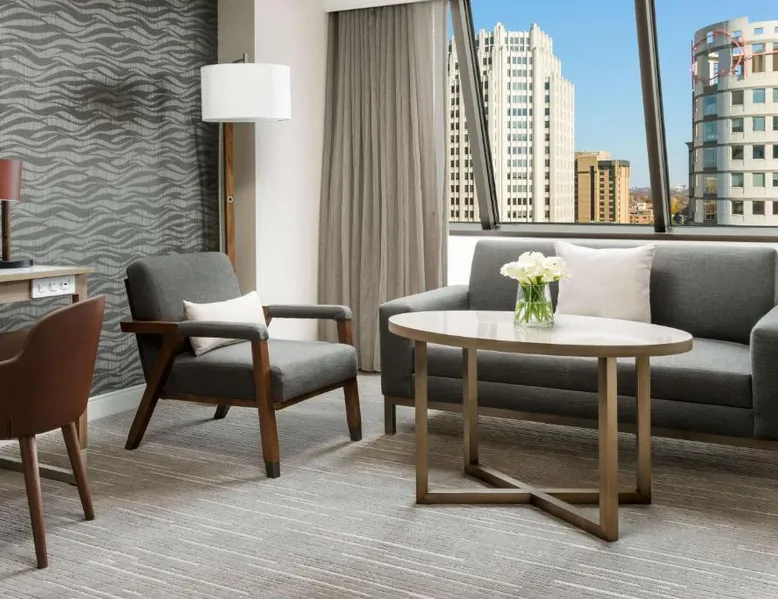 This 12-story atrium hotel is located directly above the Bethesda metro station and the Washington, D.C. city center is 7 miles away. The hotel provides free Wi-Fi and a 24-hour fitness center. A 55-inch HD flat-screen TV, Hyatt Grand Bed, and work desk are included in every contemporary guest room at the Hyatt Regency Bethesda near Washington D.C. They are decorated in light neutral tones. Each room also comes with a refrigerator and a safe. Guests can also enjoy the convenience of a concierge service at the Hyatt Regency Bethesda near Washington D.C. Morton’s the Steakhouse serves dinner, while the Daily Grill offers breakfast, brunch, lunch and dinner. A Starbucks® is featured in the lobby of the property. The National Institutes of Health are 1 mile away. The National Zoo is 13 minutes’ train ride from the hotel. This room features a work desk, a coffee machine, and a flat-screen cable TV.