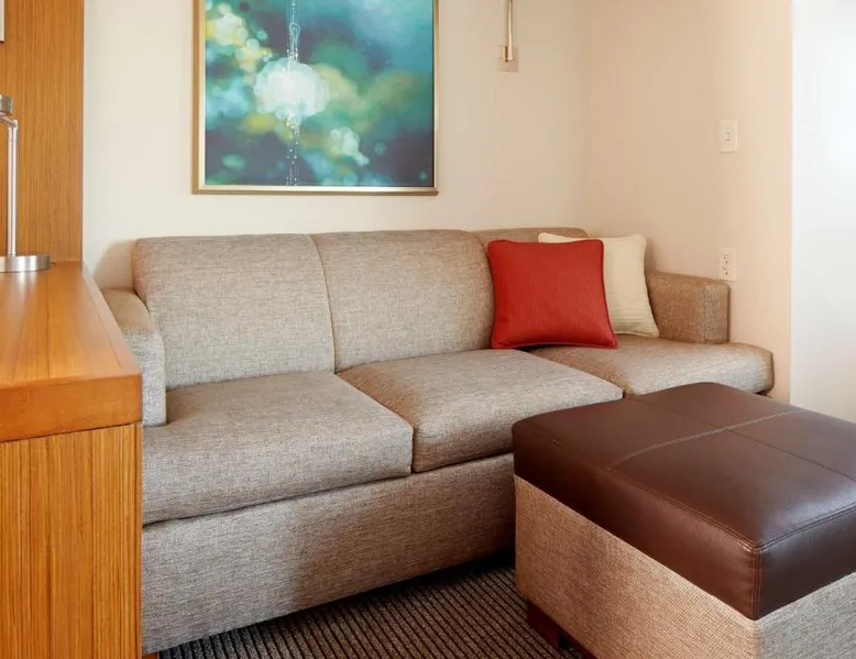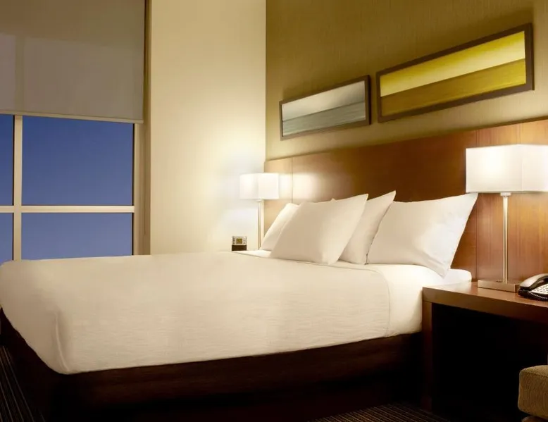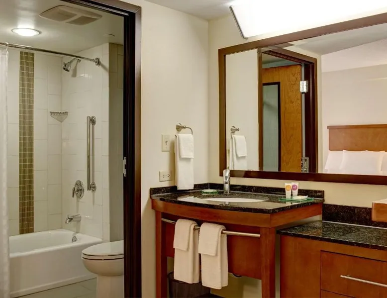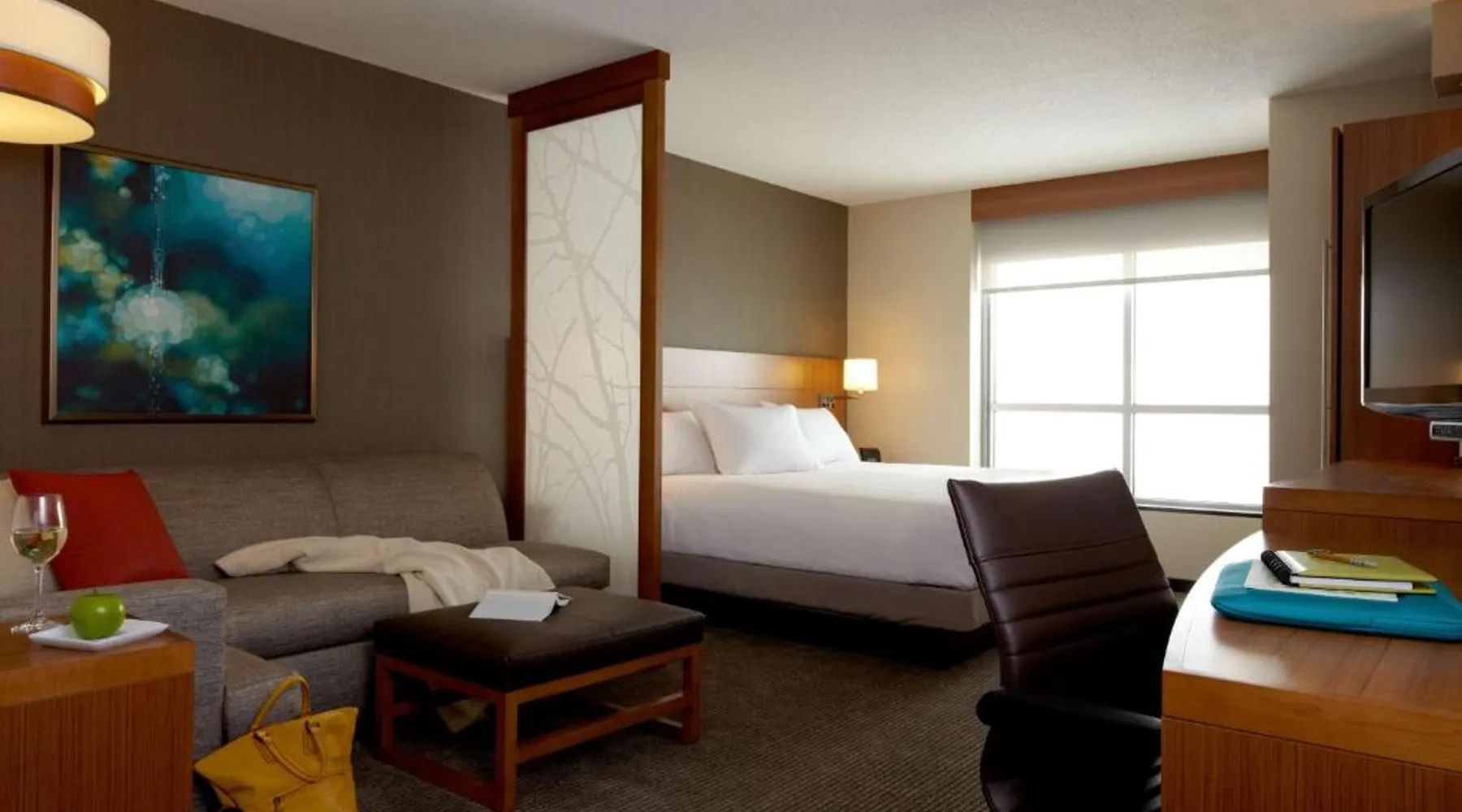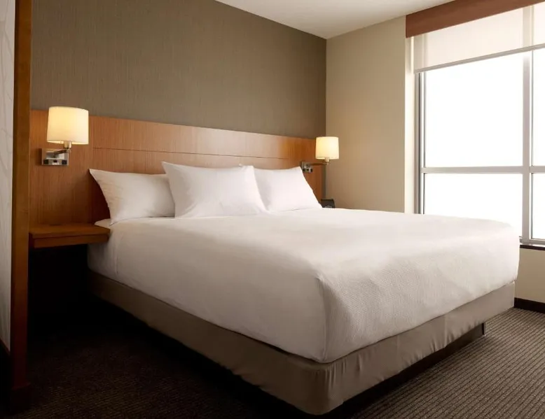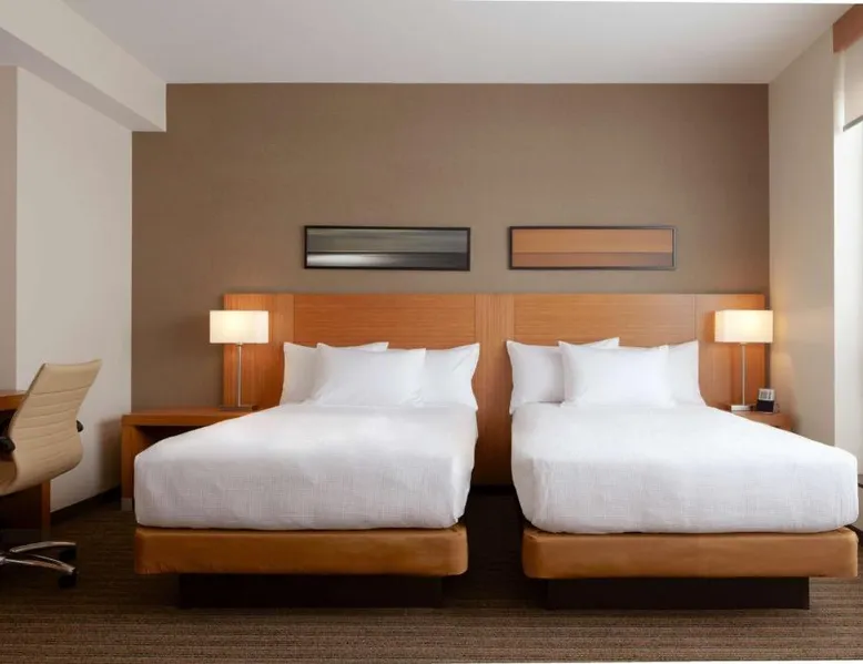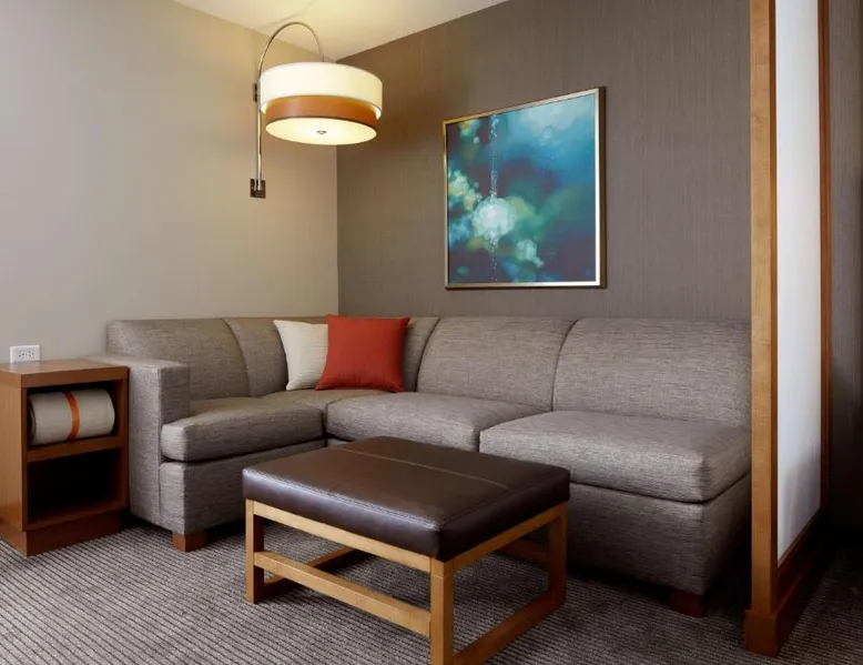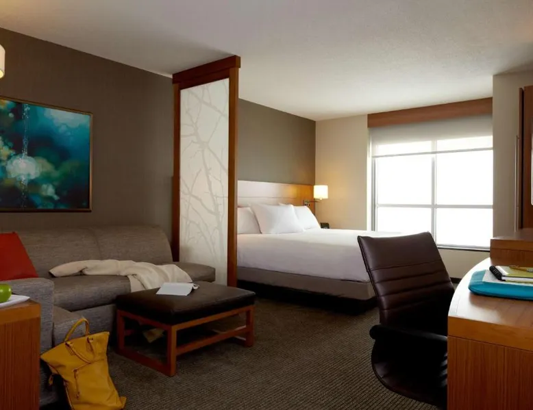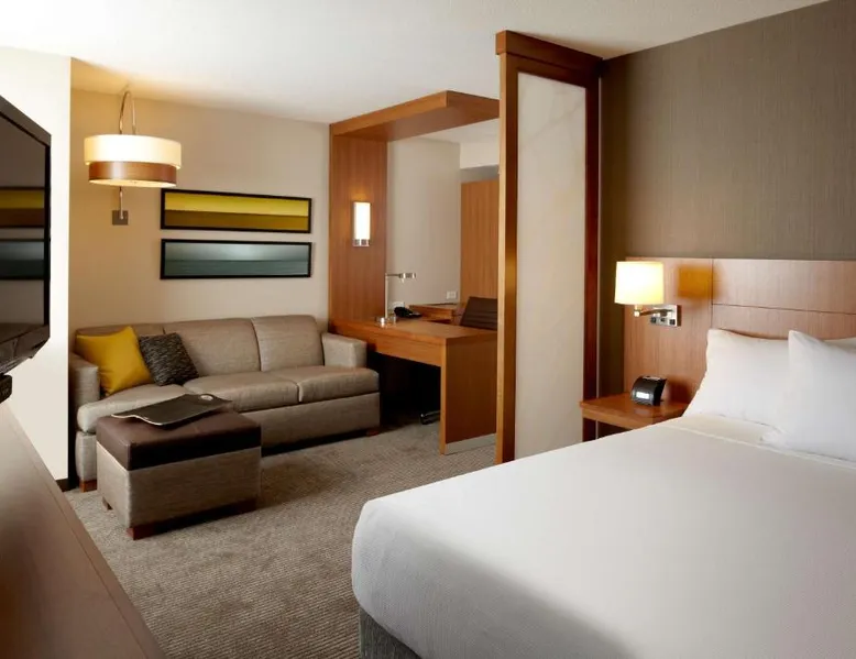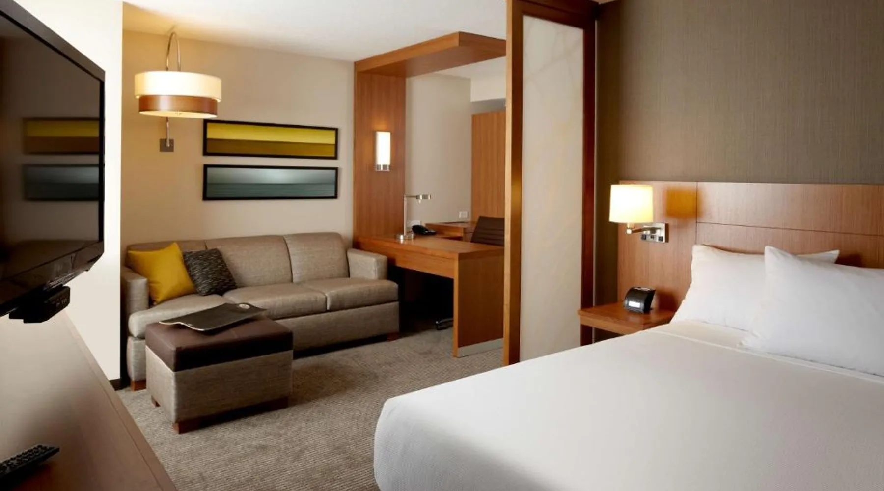Comfortable Accommodations: Hyatt Place Indianapolis Fishers in Fishers offers family rooms with air-conditioning, private bathrooms, and modern amenities. Each room includes a work desk, sofa bed, and free WiFi. Dining and Leisure: Guests can enjoy an American buffet breakfast with fresh pastries, pancakes, fruits, and juice. The on-site restaurant serves dinner, while the bar provides a relaxing atmosphere. Additional facilities include a fitness center, indoor swimming pool, and outdoor fireplace. Convenient Location: Located 18 mi from Lucas Oil Stadium and 20 mi from Indianapolis Motor Speedway, the hotel is near attractions such as the Children's Museum of Indianapolis and Indianapolis Museum of Art. Free on-site parking is available. Guest Satisfaction: Highly rated for room cleanliness, convenient location, and excellent restaurant, Hyatt Place Indianapolis Fishers ensures a pleasant stay for all visitors. The family room offers air conditioning, a tea and coffee maker, as well as a private bathroom boasting a bath and a hairdryer. The family room provides a wardrobe, a sofa, a carpeted floor, heating and a flat-screen TV with cable channels. The unit has 3 beds.
