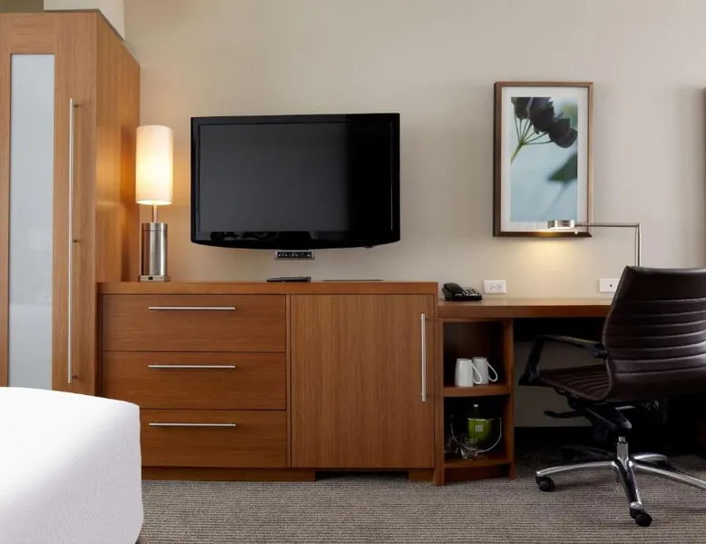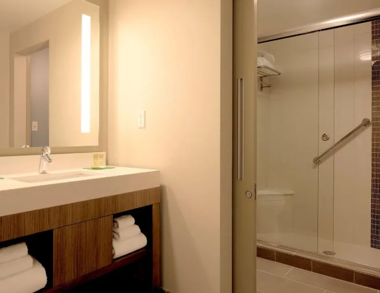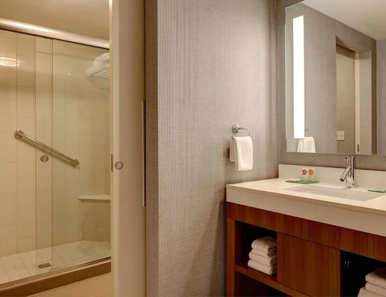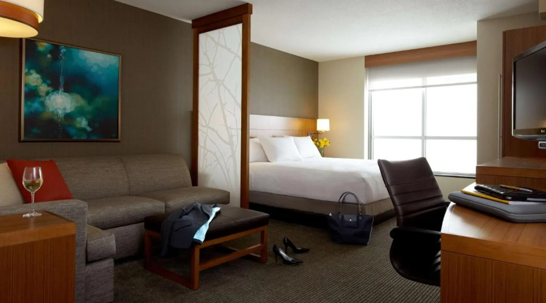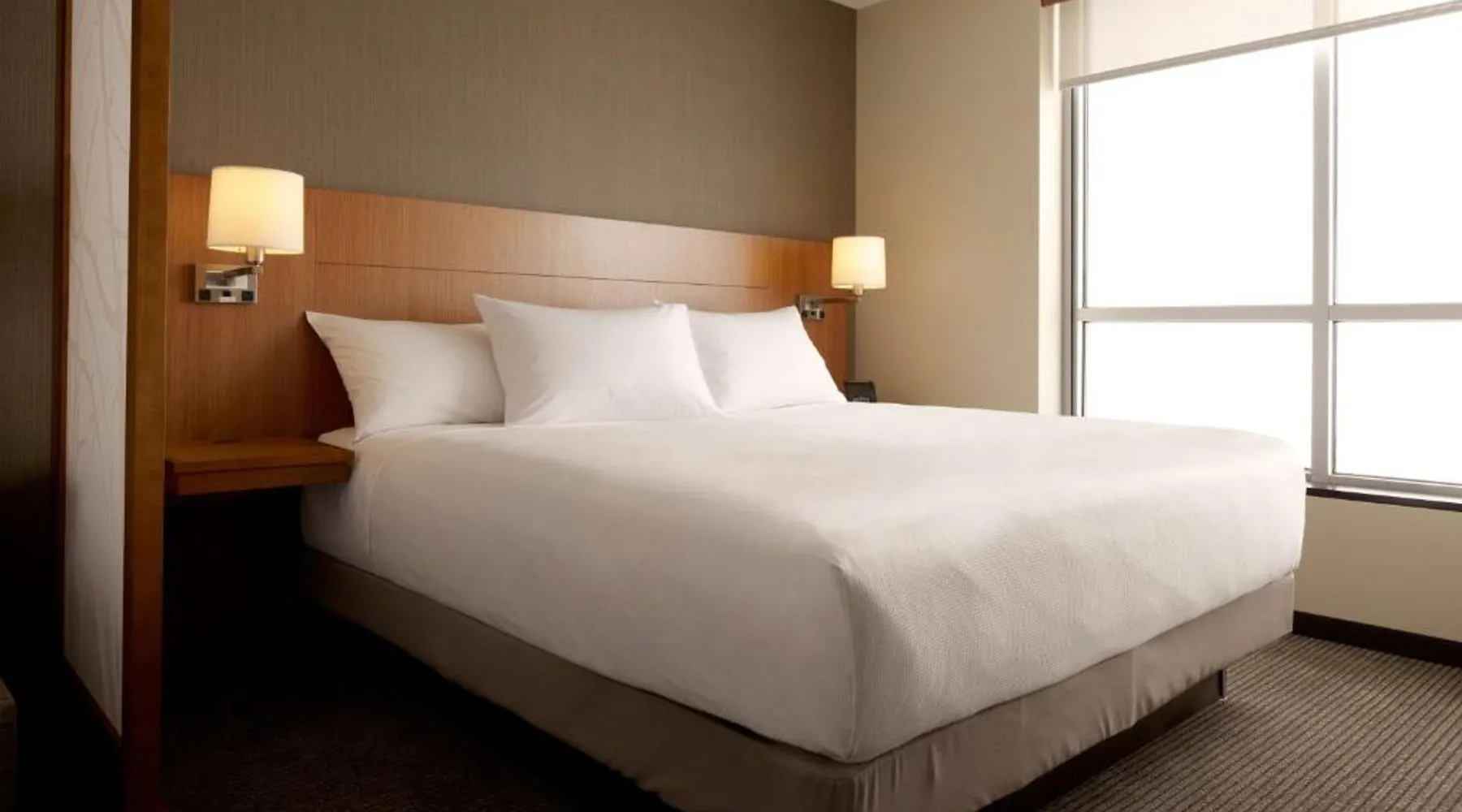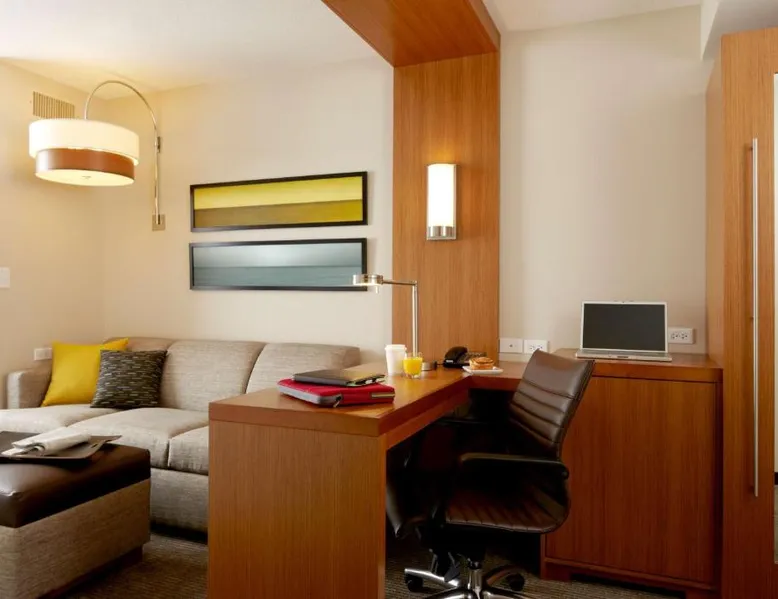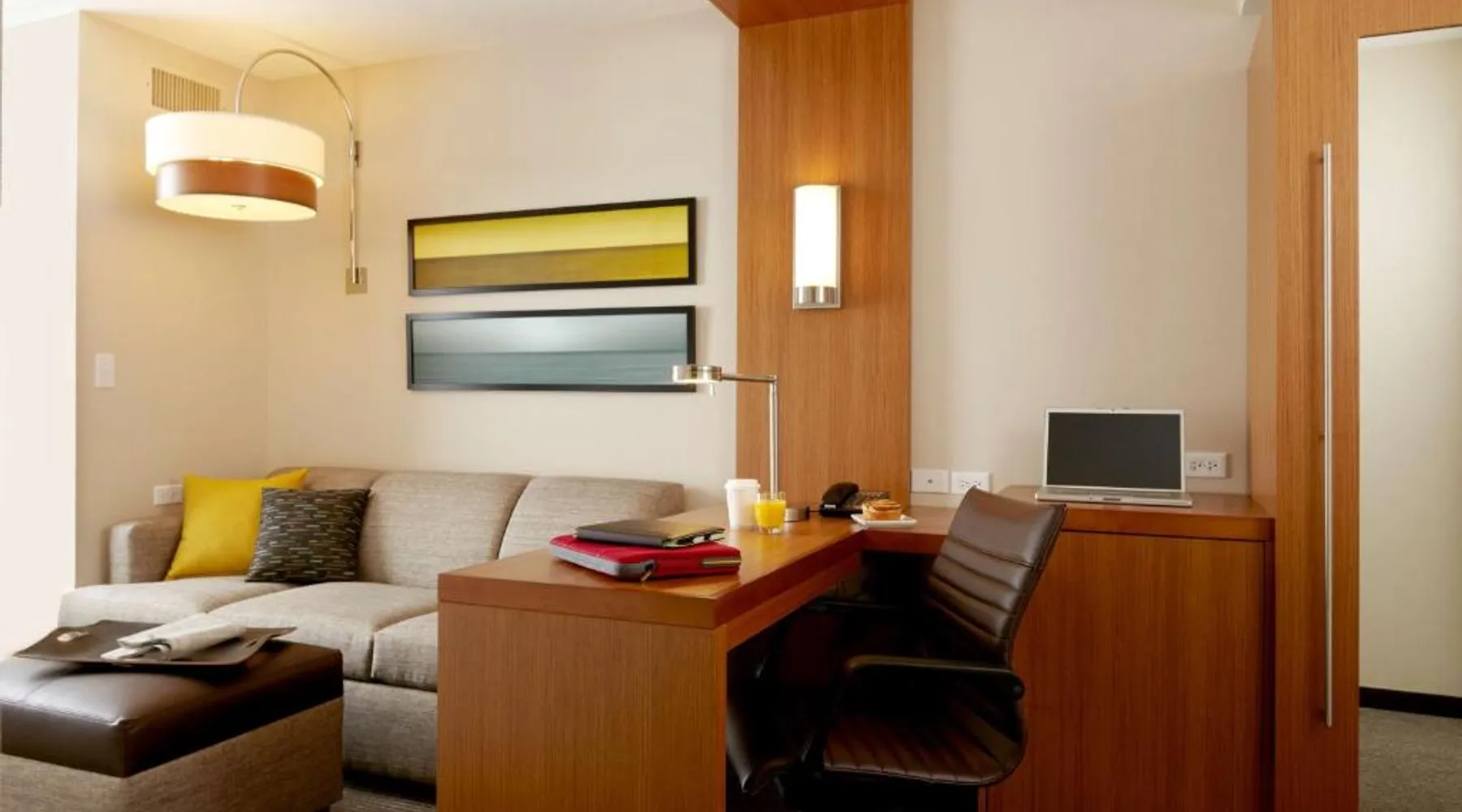 Comfortable Accommodations: Hyatt Place Indianapolis Fishers in Fishers offers family rooms with air-conditioning, private bathrooms, and modern amenities. Each room includes a work desk, sofa bed, and free WiFi. Dining and Leisure: Guests can enjoy an American buffet breakfast with fresh pastries, pancakes, fruits, and juice. The on-site restaurant serves dinner, while the bar provides a relaxing atmosphere. Additional facilities include a fitness center, indoor swimming pool, and outdoor fireplace. Convenient Location: Located 18 mi from Lucas Oil Stadium and 20 mi from Indianapolis Motor Speedway, the hotel is near attractions such as the Children's Museum of Indianapolis and Indianapolis Museum of Art. Free on-site parking is available. Guest Satisfaction: Highly rated for room cleanliness, convenient location, and excellent restaurant, Hyatt Place Indianapolis Fishers ensures a pleasant stay for all visitors. The family room offers air conditioning, a tea and coffee maker, as well as a private bathroom boasting a bath and a hairdryer. The family room provides a wardrobe, a sofa, a carpeted floor, heating and a flat-screen TV with cable channels. The unit has 3 beds.
