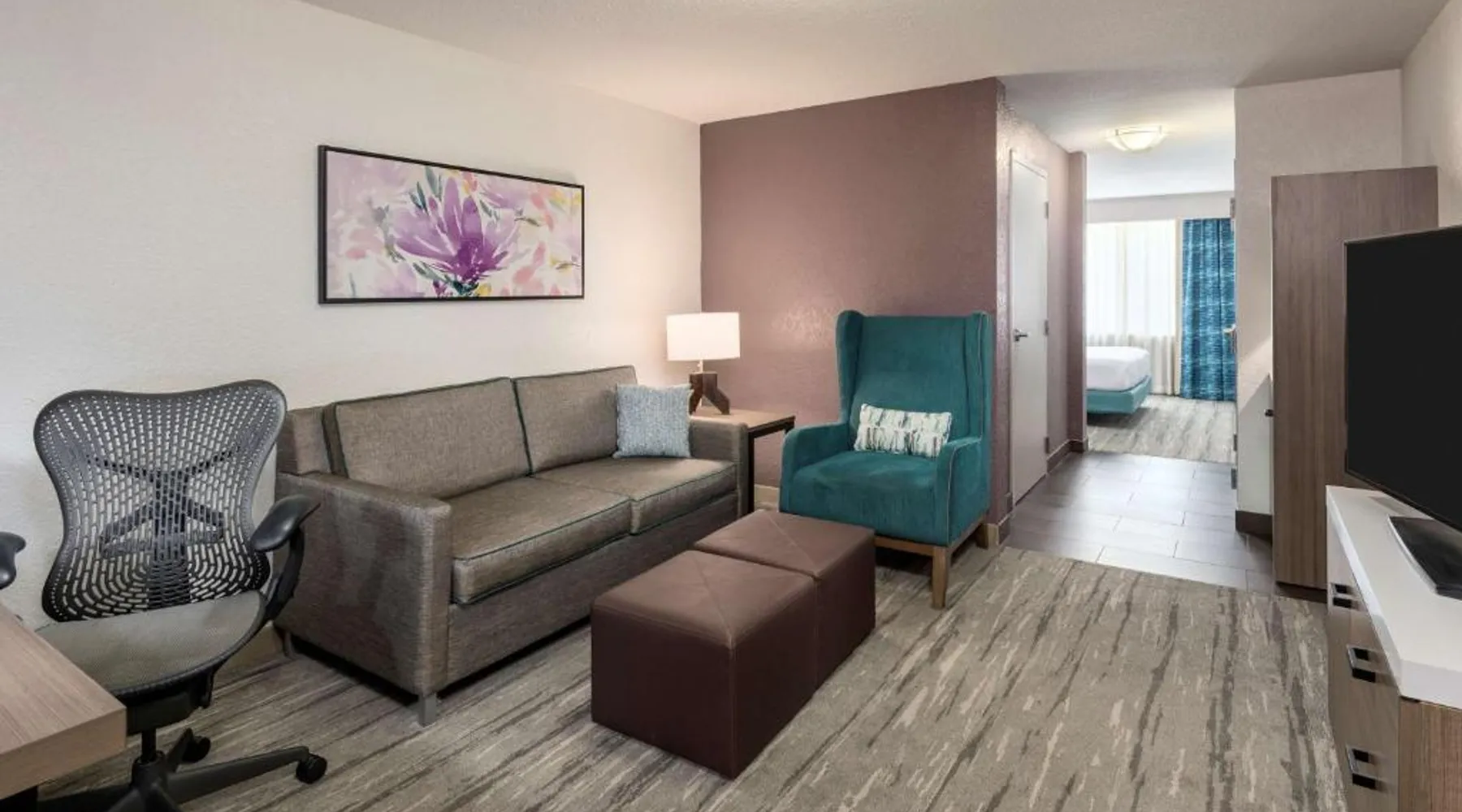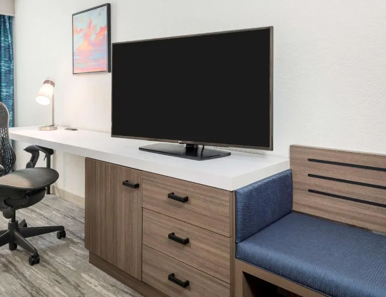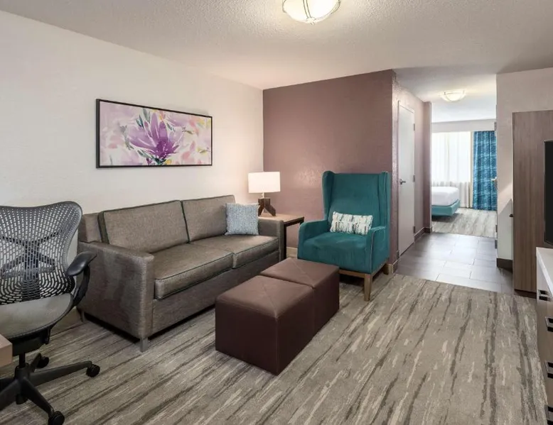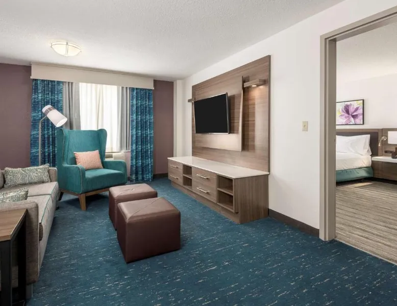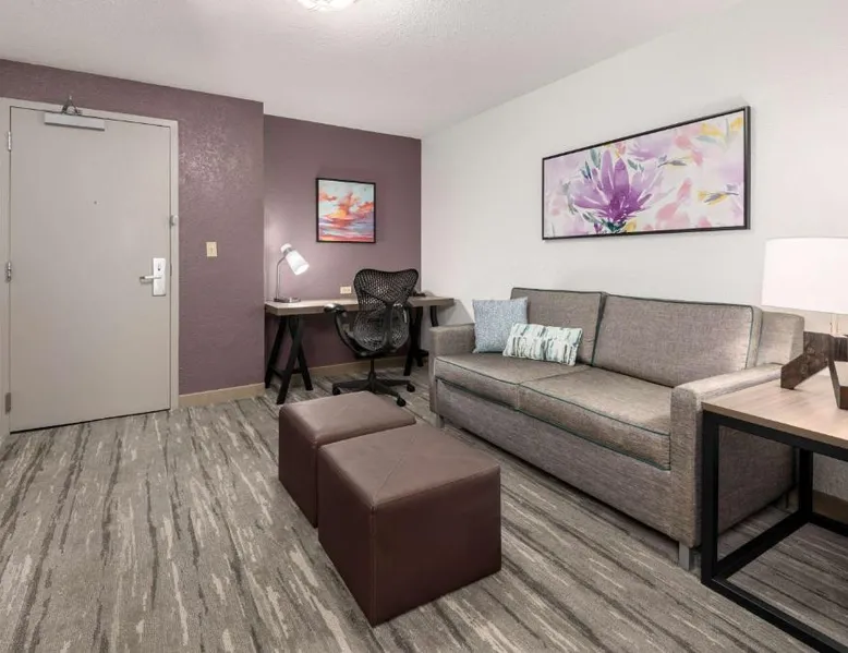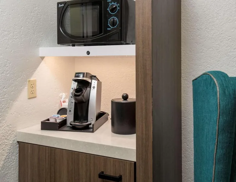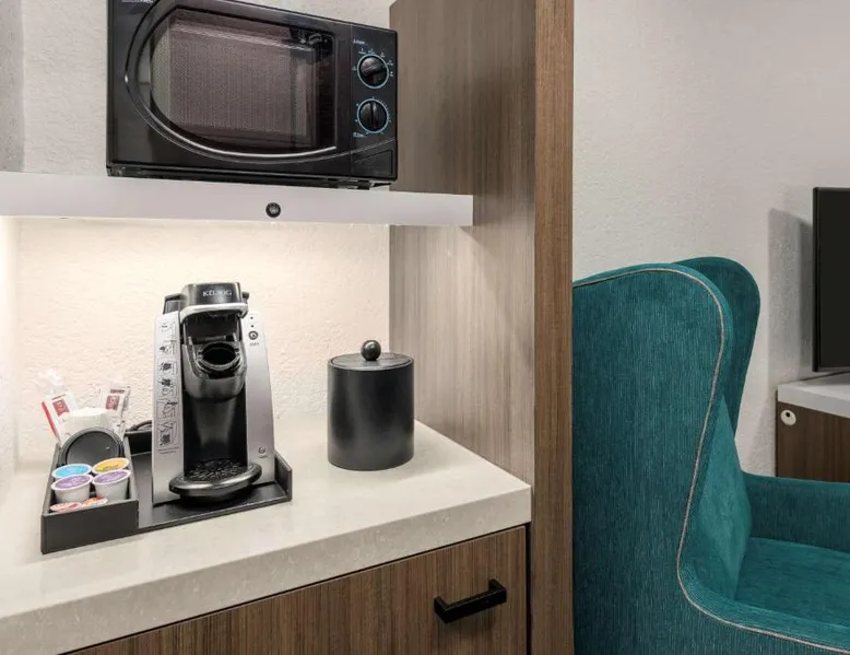 Comfortable Accommodations: Rooms feature air-conditioning, private bathrooms, tea and coffee makers, hairdryers, refrigerators, work desks, free toiletries, microwaves, and TVs. Additional amenities include baths, sofa beds, seating areas, and showers. Dining and Leisure: The family-friendly restaurant serves American cuisine for dinner. Guests can also enjoy a bar and free WiFi. The hotel offers a fitness center, sun terrace, and outdoor seating area. Convenient Location: Located in Lafayette, the hotel is 3.7 mi from the airport. Nearby attractions include Cajun Field Football Stadium (less than 0.6 mi), Cajundome Convention Center (1969 feet), and M.L. Tigue Moore Field (12-minute walk). Guests appreciate the location, staff, and service support. A seating area with a flat-screen TV is featured in this room. It also includes a microwave, fridge, and coffee maker.