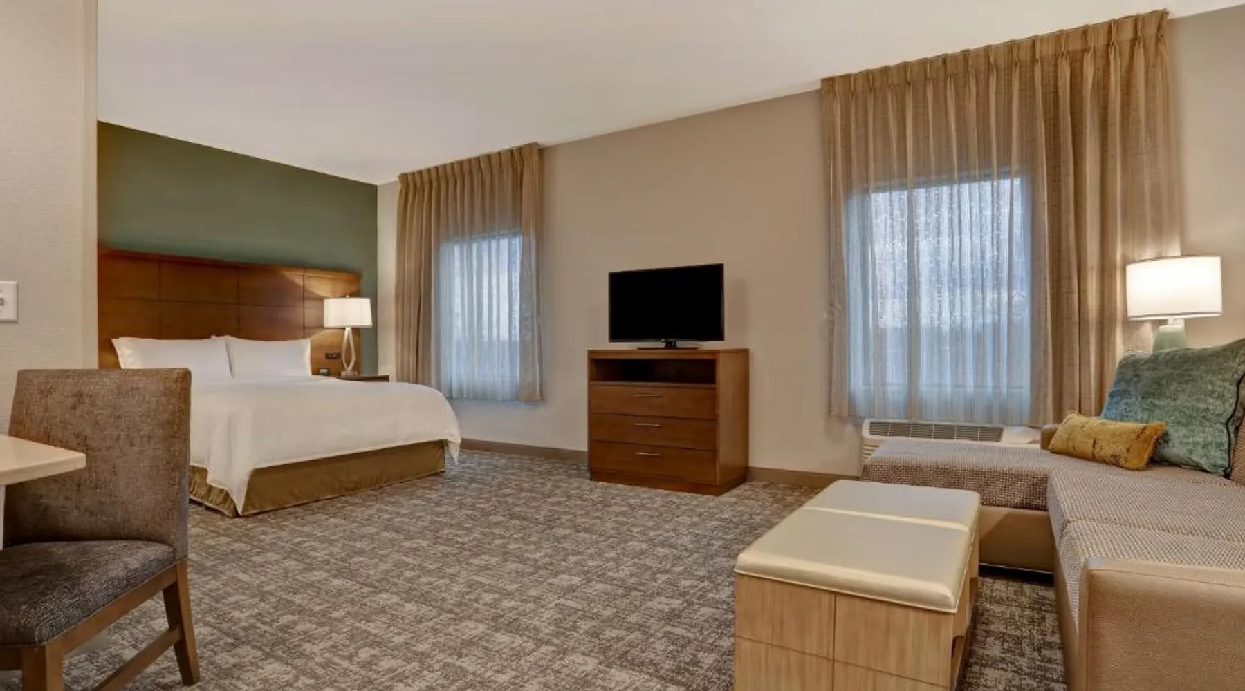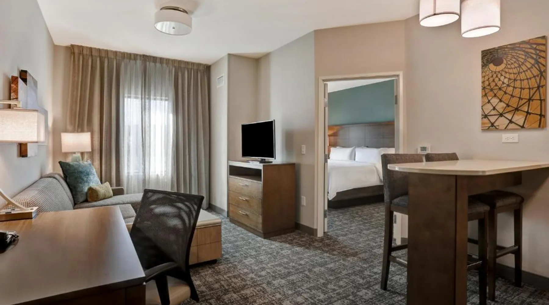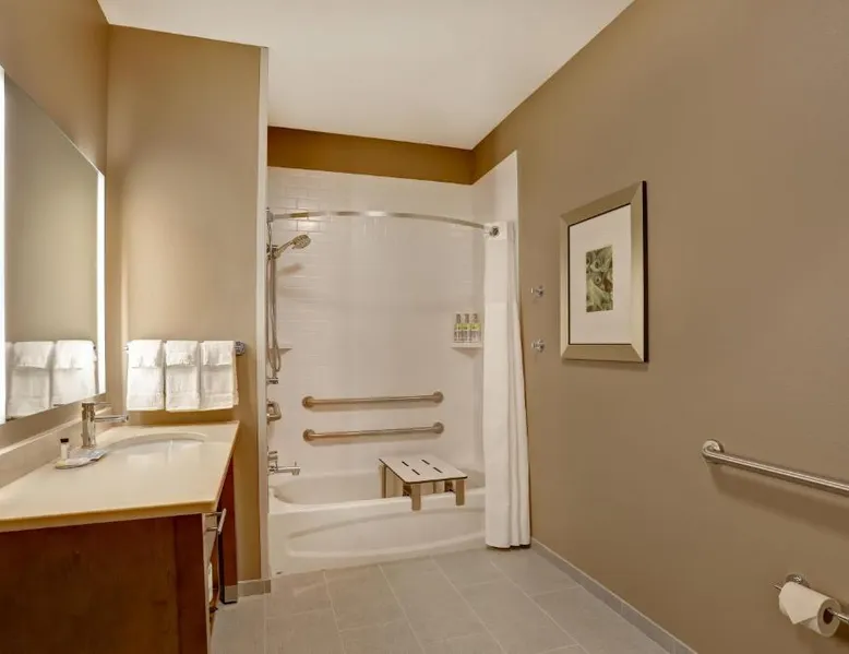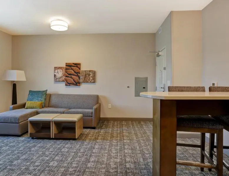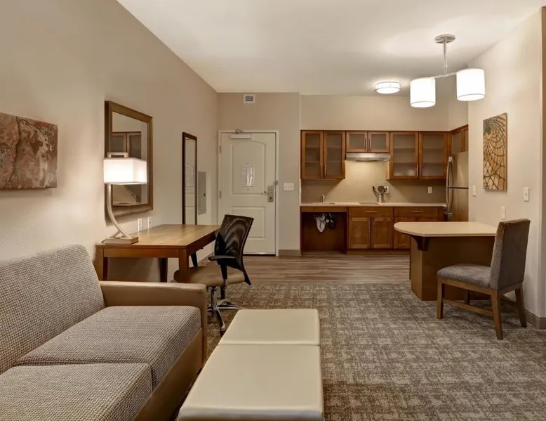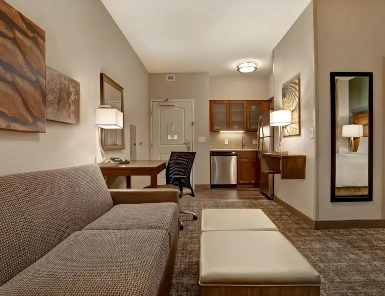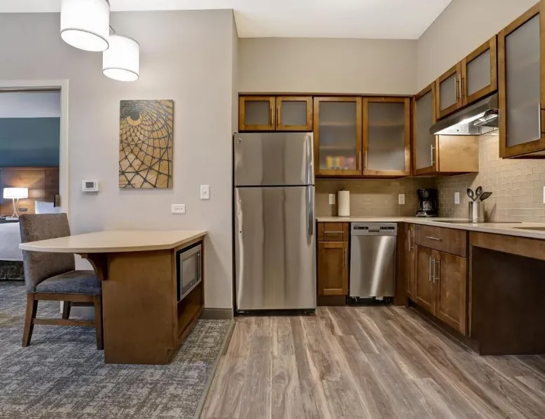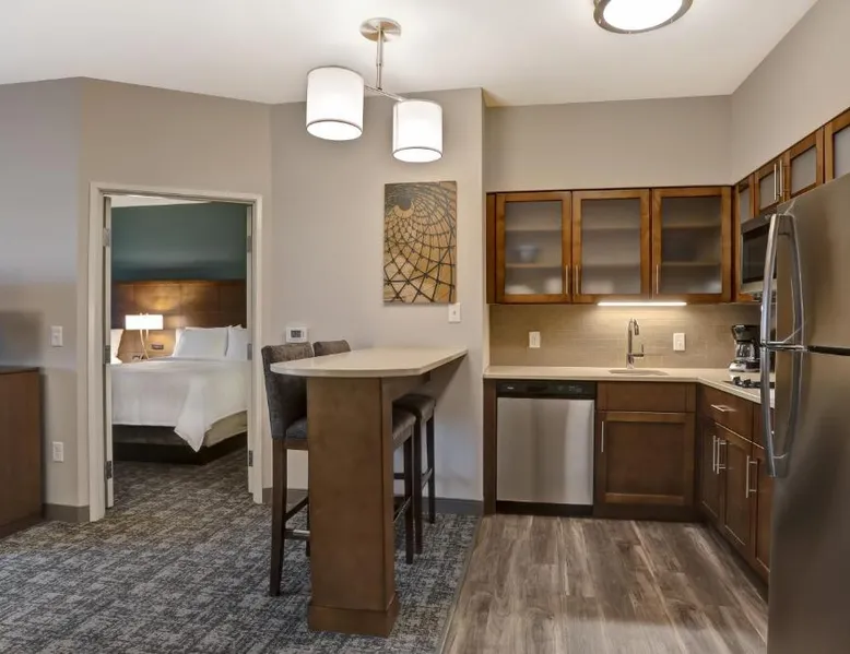 Comfortable Accommodations: Staybridge Suites - Overland Park - Kansas City S by IHG in Overland Park offers comfortable rooms with air-conditioning, private bathrooms, and free WiFi. Each room includes a sofa bed, work desk, and modern amenities. Facilities and Services: Guests can enjoy a fitness center, indoor swimming pool, and free private parking. The hotel provides free WiFi, a breakfast buffet, and a 24-hour reception with English and Spanish language support. Nearby Attractions: Located 31 mi from Kansas City International Airport, the property is close to attractions such as the National World War I Museum at Liberty Memorial (17 mi) and Overland Park Golf Course- Main (4.3 mi). Guest Satisfaction: Highly rated for its breakfast, room cleanliness, and attentive staff, the hotel ensures a pleasant stay for all visitors. This suite features a separate living room with a sofa bed, a work desk, an HDTV and a fully-equipped kitchen with microwave, stove top, refrigerator, dishwasher and coffeemaker.