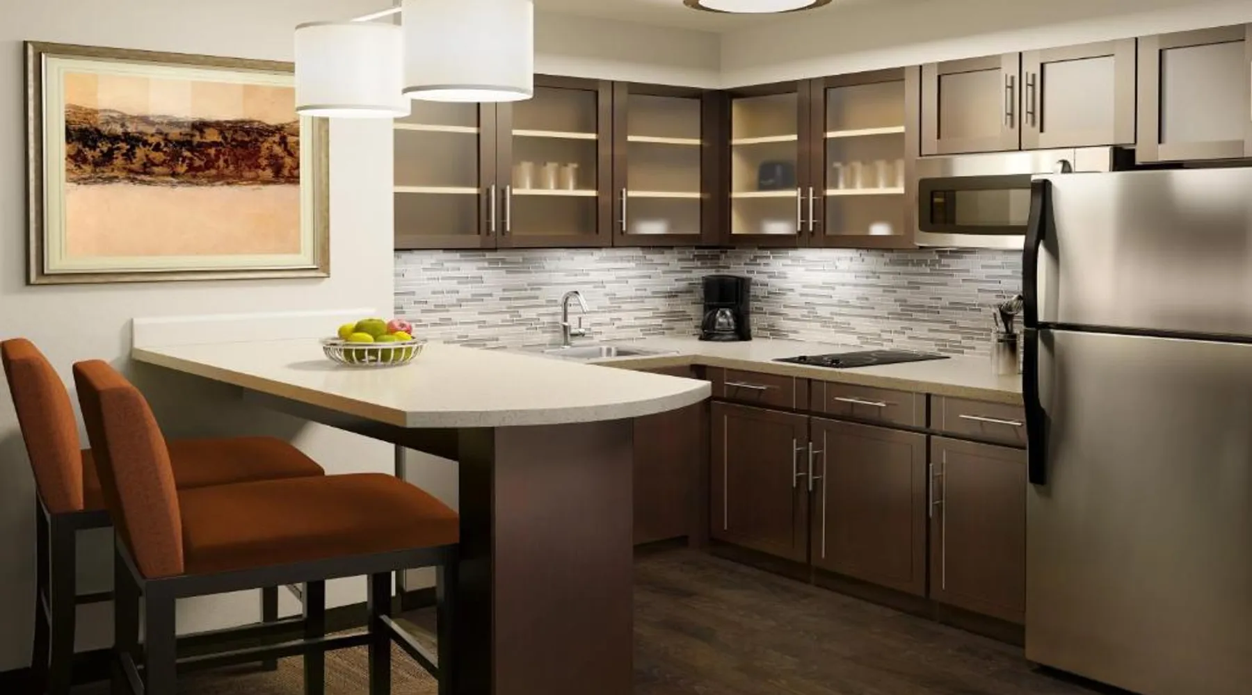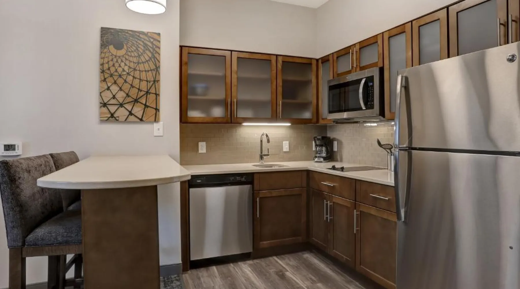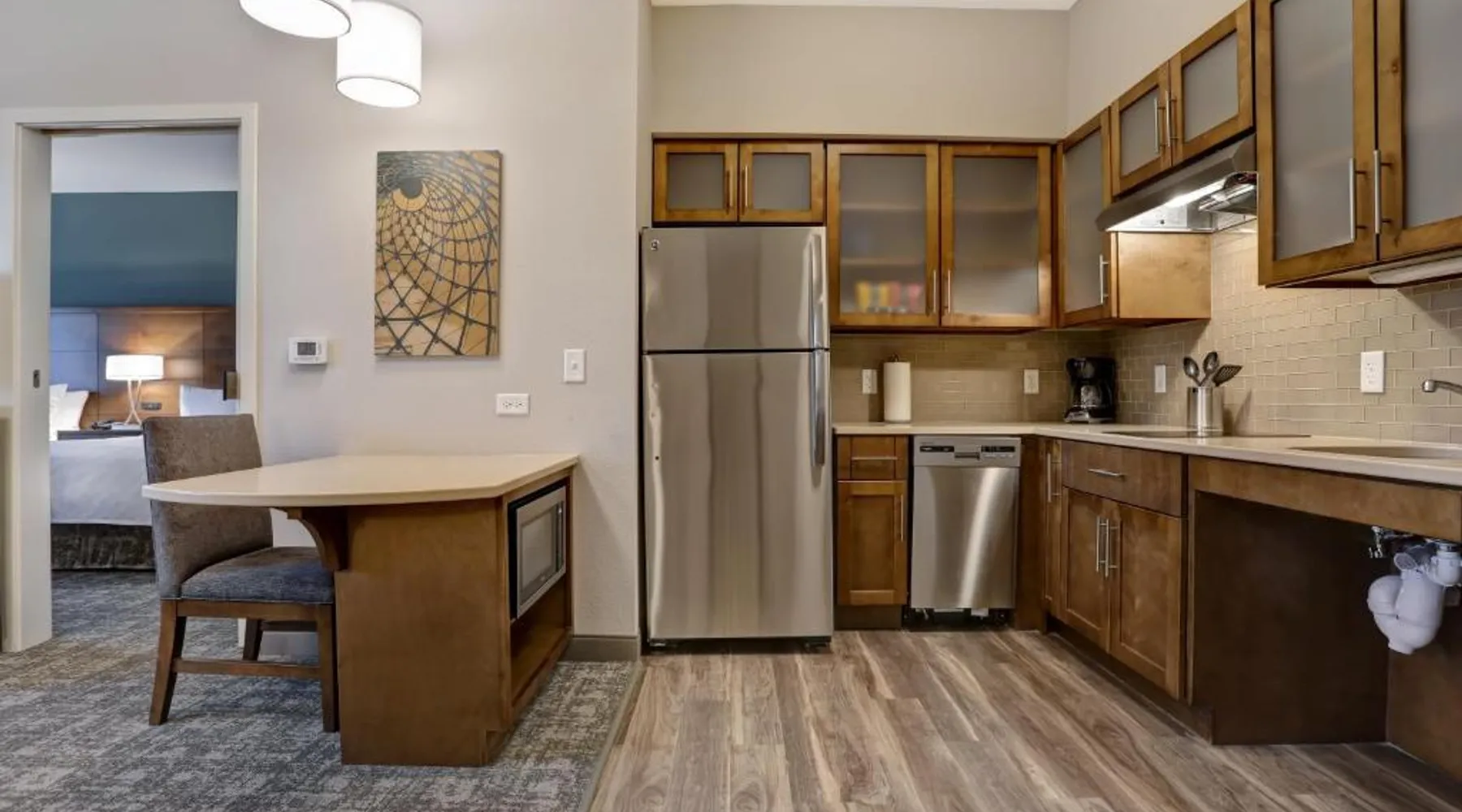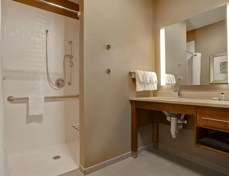 Comfortable Accommodations: Staybridge Suites - Overland Park - Kansas City S by IHG in Overland Park offers comfortable rooms with air-conditioning, private bathrooms, and free WiFi. Each room includes a sofa bed, work desk, and modern amenities. Facilities and Services: Guests can enjoy a fitness center, indoor swimming pool, and free private parking. The hotel provides free WiFi, a breakfast buffet, and a 24-hour reception with English and Spanish language support. Nearby Attractions: Located 31 mi from Kansas City International Airport, the property is close to attractions such as the National World War I Museum at Liberty Memorial (17 mi) and Overland Park Golf Course- Main (4.3 mi). Guest Satisfaction: Highly rated for its breakfast, room cleanliness, and attentive staff, the hotel ensures a pleasant stay for all visitors. This suite features a separate living room with a sofa bed, a work desk, an HDTV and a fully-equipped kitchen with microwave, stove top, refrigerator, dishwasher and coffeemaker.
