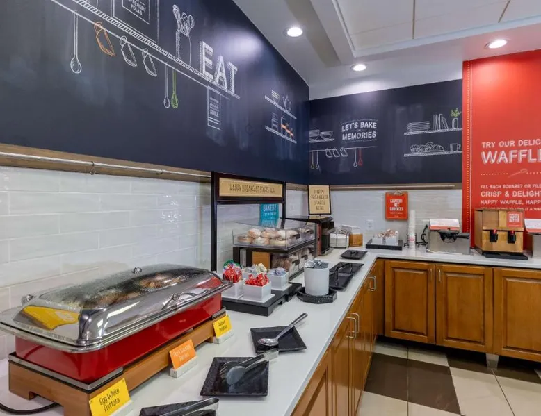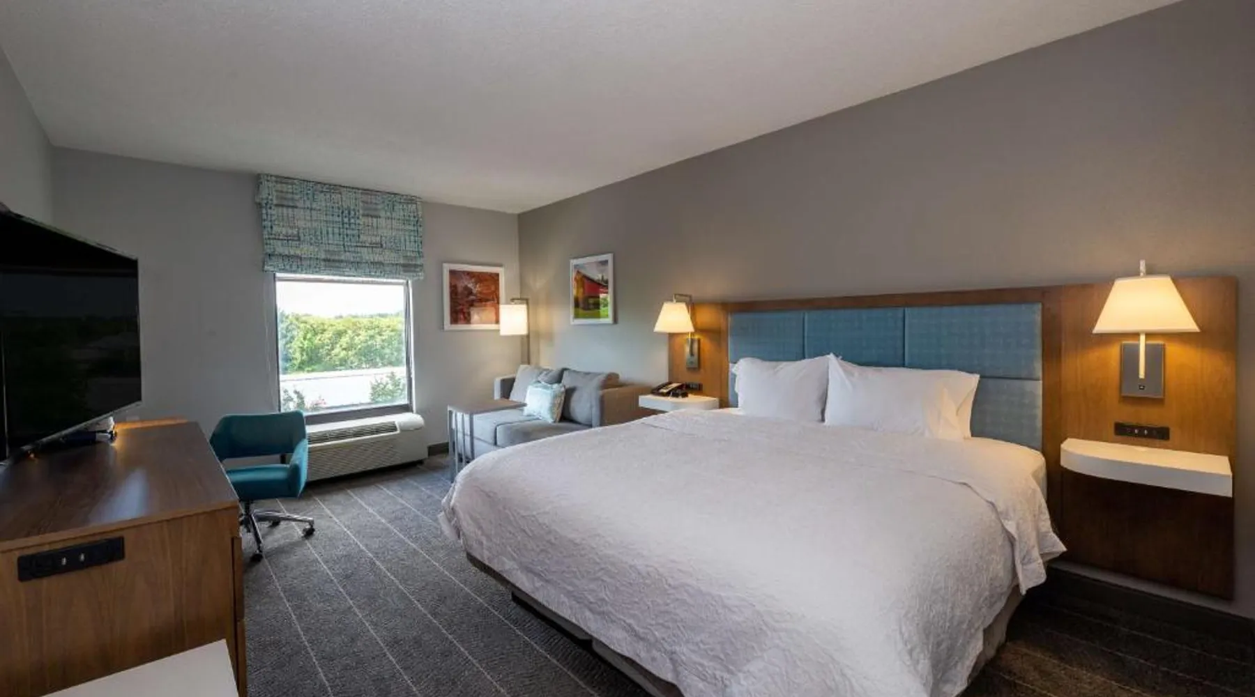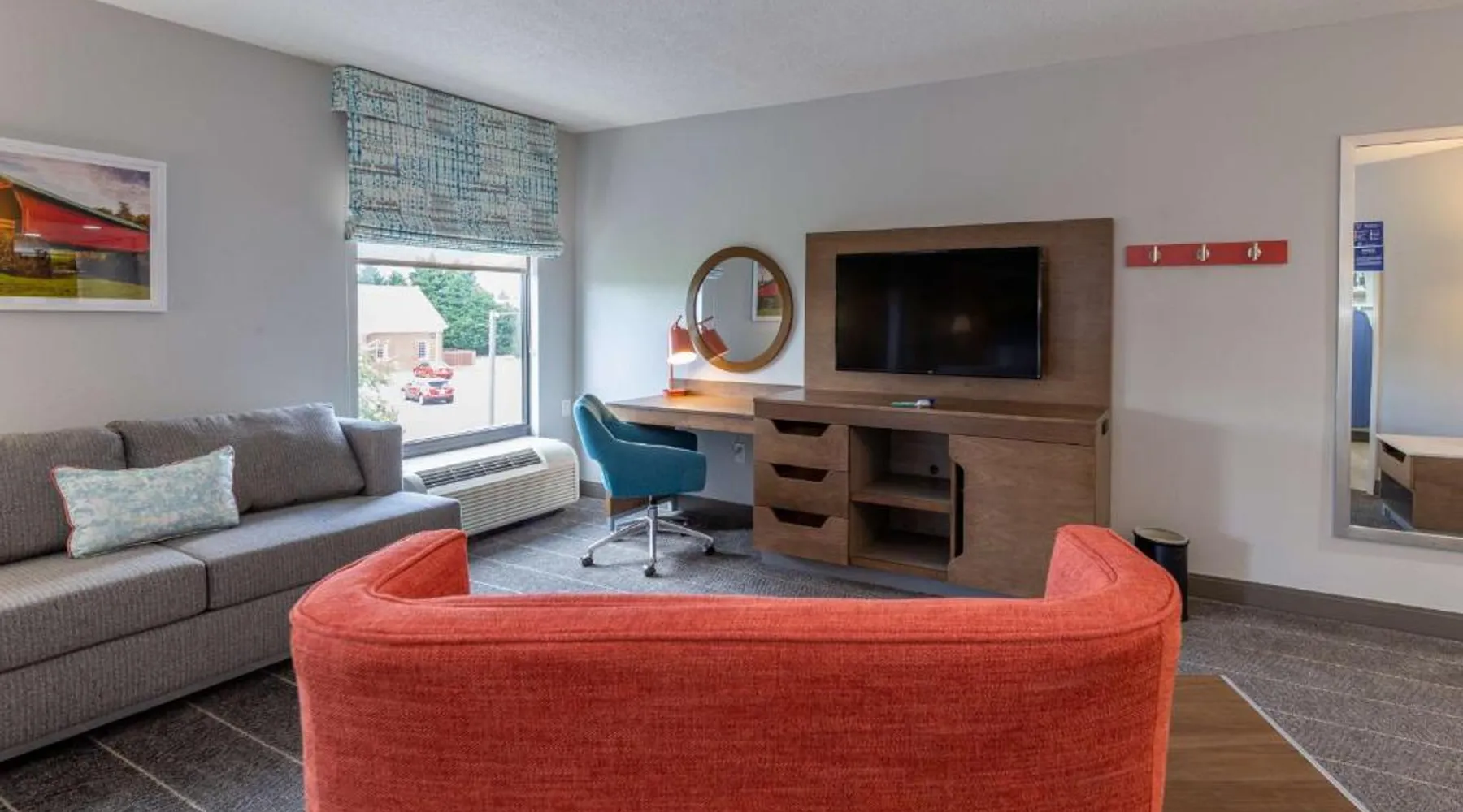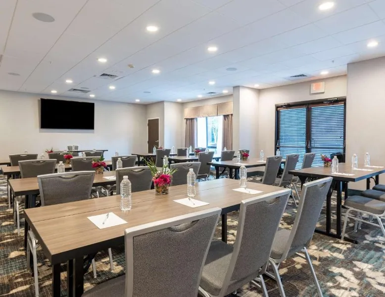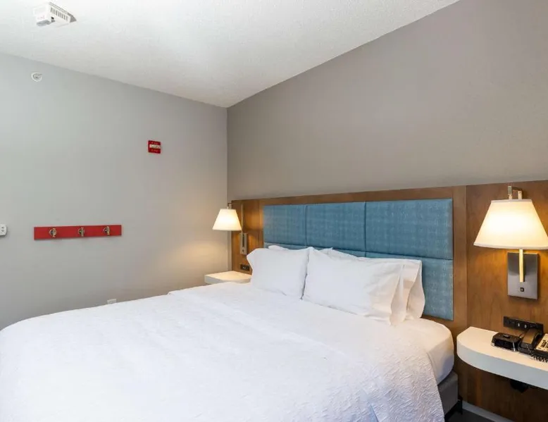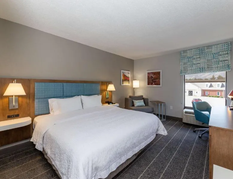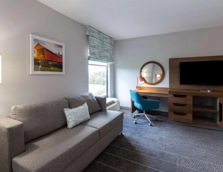 Comfortable Accommodations: Hampton Inn Christiansburg/Blacksburg in Christiansburg offers family rooms with private bathrooms, work desks, and free WiFi. Each room includes a tea and coffee maker, hairdryer, refrigerator, microwave, shower, and TV. Leisure Facilities: Guests can enjoy a fitness center, sun terrace, and seasonal outdoor swimming pool. Additional amenities include an outdoor fireplace, fitness room, elevator, 24-hour front desk, minimarket, and sofa bed. Dining Experience: A buffet breakfast is served daily, featuring warm dishes, fresh pastries, and juice. Private check-in and check-out services ensure a smooth arrival and departure. Location and Attractions: Located 33 mi from Roanoke Airport, the hotel is near Lane Stadium (5.6 mi), English Field (6.2 mi), and Virginia Tech (6.8 mi). Other attractions include Radford University (11 mi) and Women’s Softball Field (5.6 mi). This room features a flat-screen TV, work desk, and seating area.