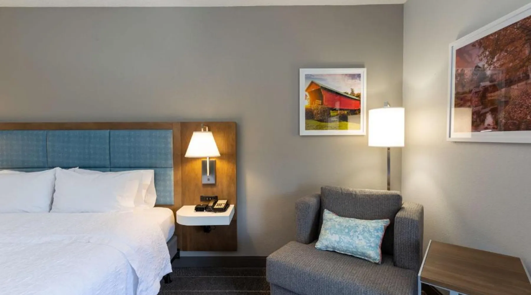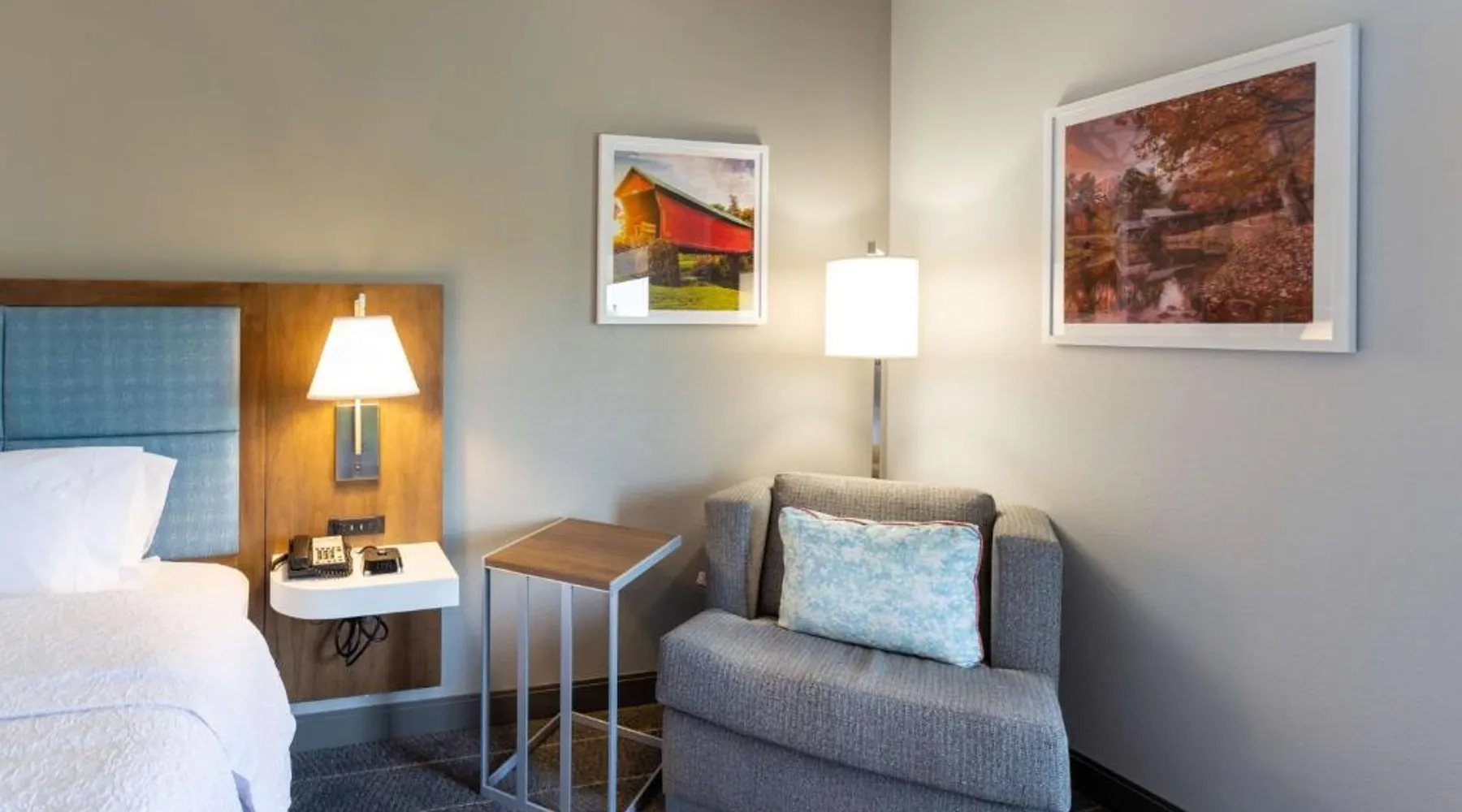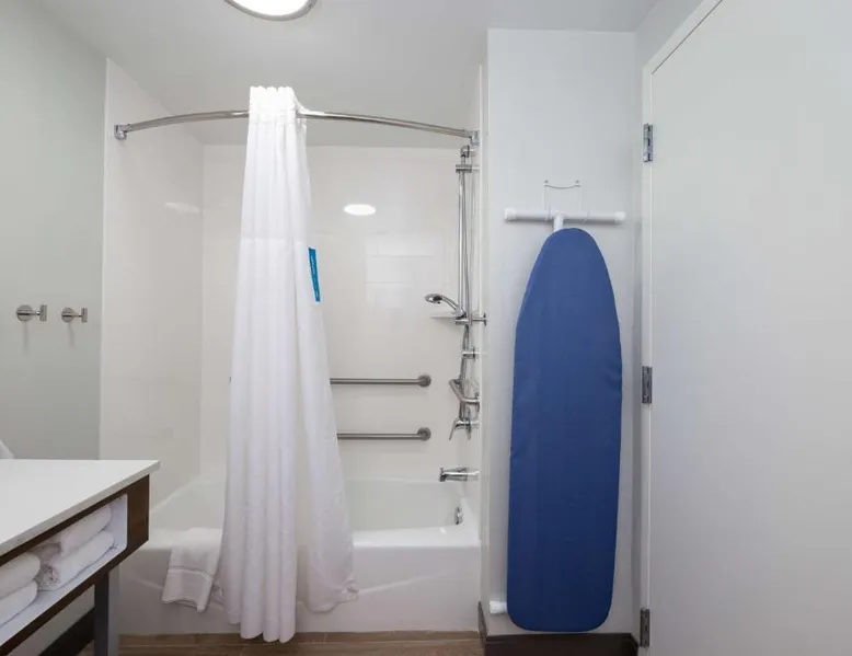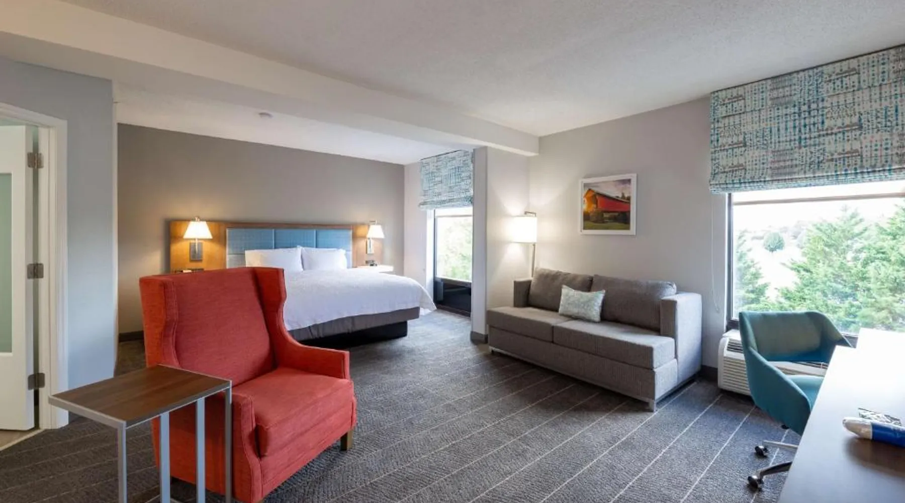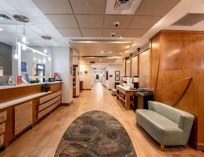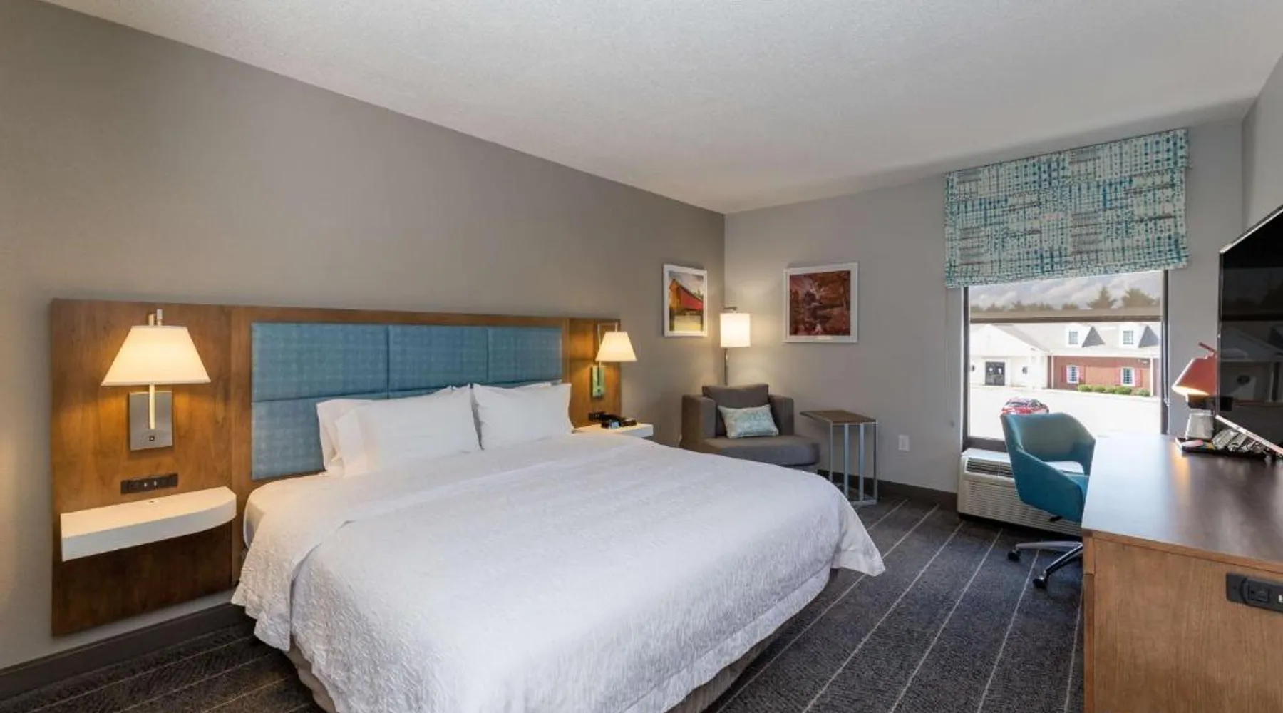 Comfortable Accommodations: Hampton Inn Christiansburg/Blacksburg in Christiansburg offers family rooms with private bathrooms, work desks, and free WiFi. Each room includes a tea and coffee maker, hairdryer, refrigerator, microwave, shower, and TV. Leisure Facilities: Guests can enjoy a fitness center, sun terrace, and seasonal outdoor swimming pool. Additional amenities include an outdoor fireplace, fitness room, elevator, 24-hour front desk, minimarket, and sofa bed. Dining Experience: A buffet breakfast is served daily, featuring warm dishes, fresh pastries, and juice. Private check-in and check-out services ensure a smooth arrival and departure. Location and Attractions: Located 33 mi from Roanoke Airport, the hotel is near Lane Stadium (5.6 mi), English Field (6.2 mi), and Virginia Tech (6.8 mi). Other attractions include Radford University (11 mi) and Women’s Softball Field (5.6 mi). This room features a flat-screen TV, work desk, and seating area.