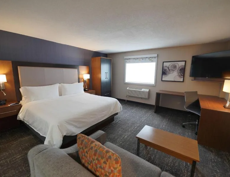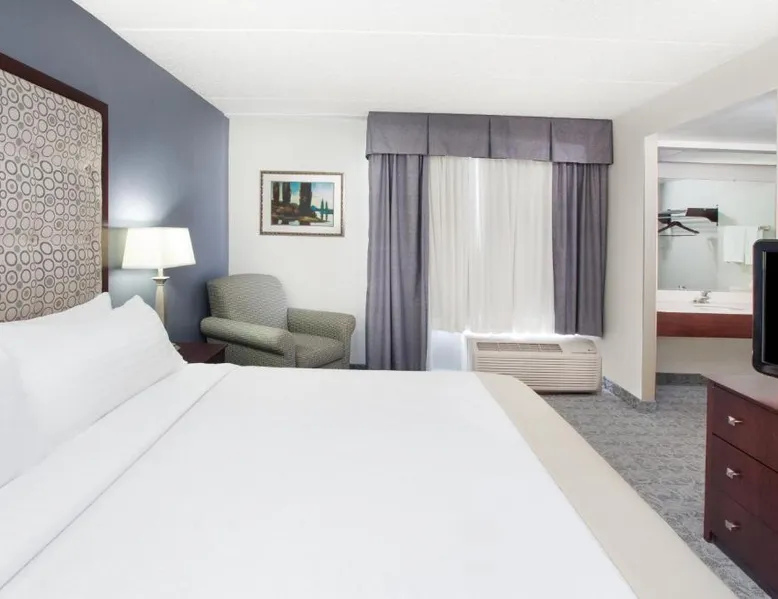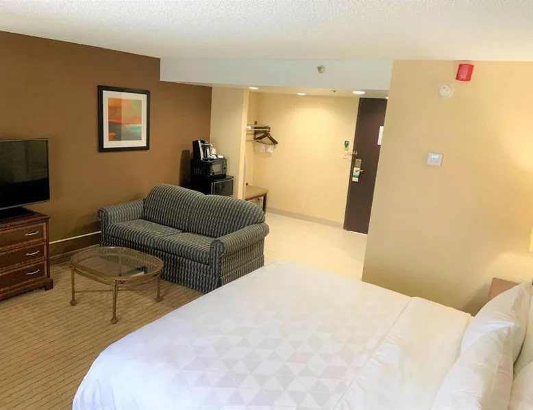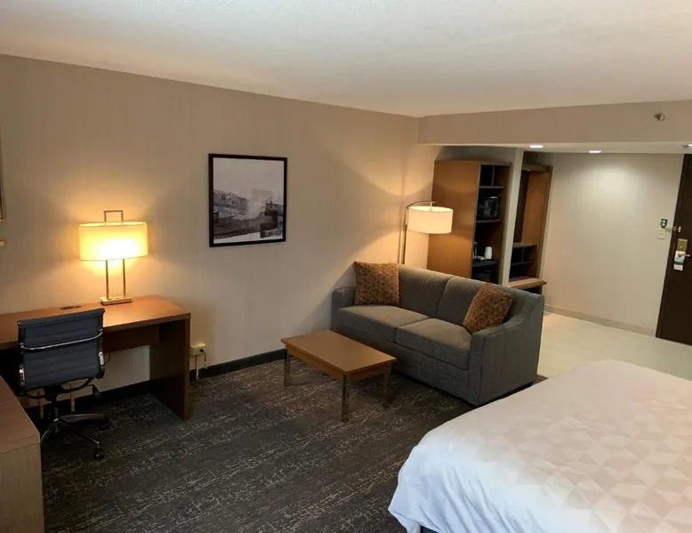 Comfortable Accommodations: Holiday Inn & Suites Chicago-Carol Stream Wheaton by IHG in Carol Stream offers comfortable rooms with air-conditioning, private bathrooms, and modern amenities. Each room includes a work desk, free WiFi, and a flat-screen TV. Dining and Leisure: The modern, family-friendly restaurant serves American cuisine for dinner. Guests can also enjoy a bar and an indoor swimming pool. Additional facilities include a fitness center, hot tub, and outdoor seating area. Convenient Location: Located 14 mi from Chicago O'Hare International Airport, the hotel is near attractions such as Cosley Zoo (1.7 mi) and Dupage County Historical Museum (3.1 mi). Free on-site parking is available. Guest Satisfaction: Highly rated for its convenient location, room cleanliness, and attentive staff, the hotel ensures a pleasant stay for all visitors. Offering a separate living area with a sofa bed and a kitchen with a refrigerator and a microwave, this suite includes a 42-inch flat-screen TV and free Wi-Fi. A 37-inch flat-screen TV is also included in the bedroom.