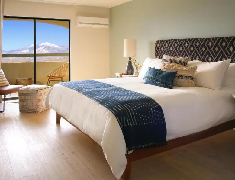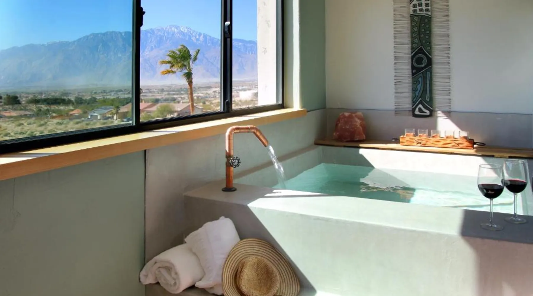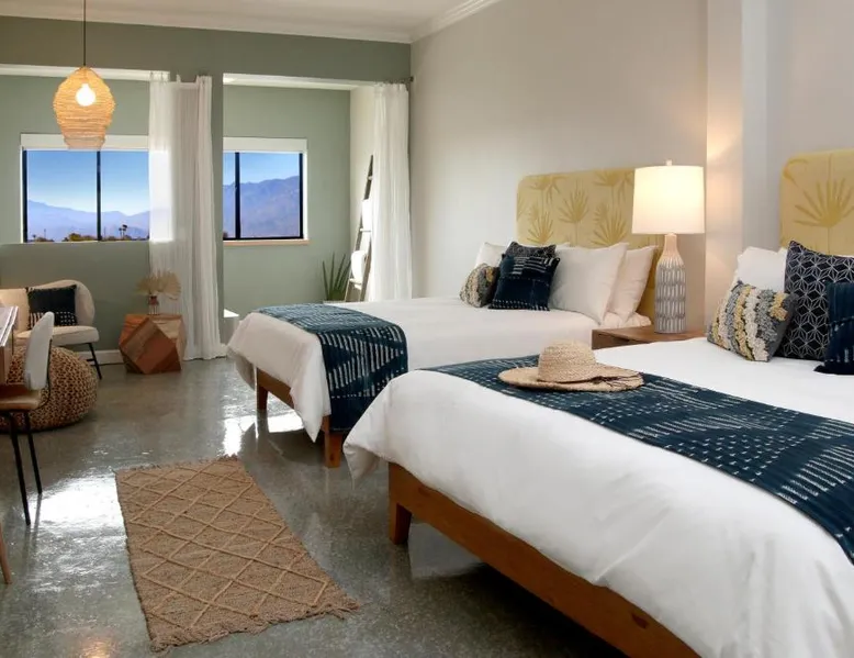 Exceptional Facilities: Azure Palm Hot Springs in Desert Hot Springs offers a hot spring bath, spa facilities, swimming pool with a view, sauna, and a beautifully maintained garden. Guests can also enjoy yoga classes and hiking. Comfortable Accommodations: Rooms feature air-conditioning, private bathrooms, tea and coffee makers, mountain views, hairdryers, refrigerators, work desks, showers, slippers, and wardrobes. Additional amenities include balconies, spa baths, dining tables, and seating areas. Dining Experience: The resort serves American cuisine for lunch and dinner at its on-site restaurant. Free WiFi is available throughout the property. Prime Location: Located 9.3 mi from Palm Springs International Airport, the resort is near attractions such as Family Bible Church (19-minute walk) and Palm Springs Visitor Center (11 mi). Highly rated for its spa, sauna, and attentive staff. This double room features a hot tub and a spa bath. The spacious double room features air conditioning, a tea and coffee maker, as well as a private bathroom boasting a shower and a hairdryer. The double room provides a wardrobe, a safe deposit box and mountain views. The unit has 2 beds.