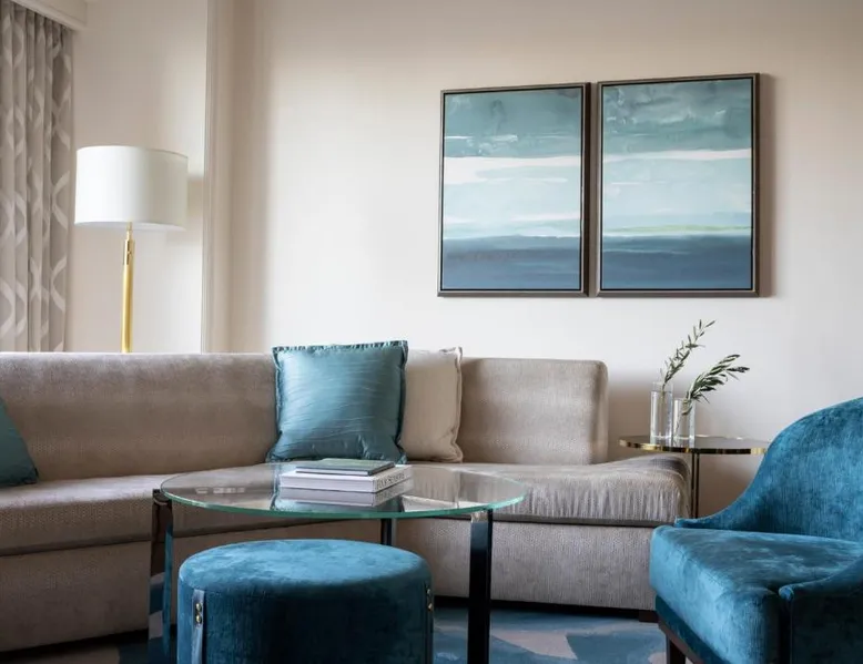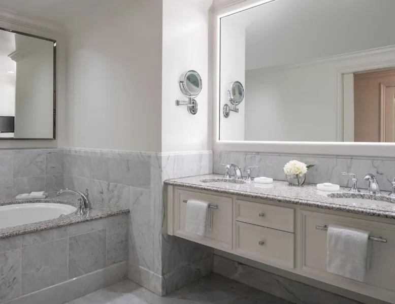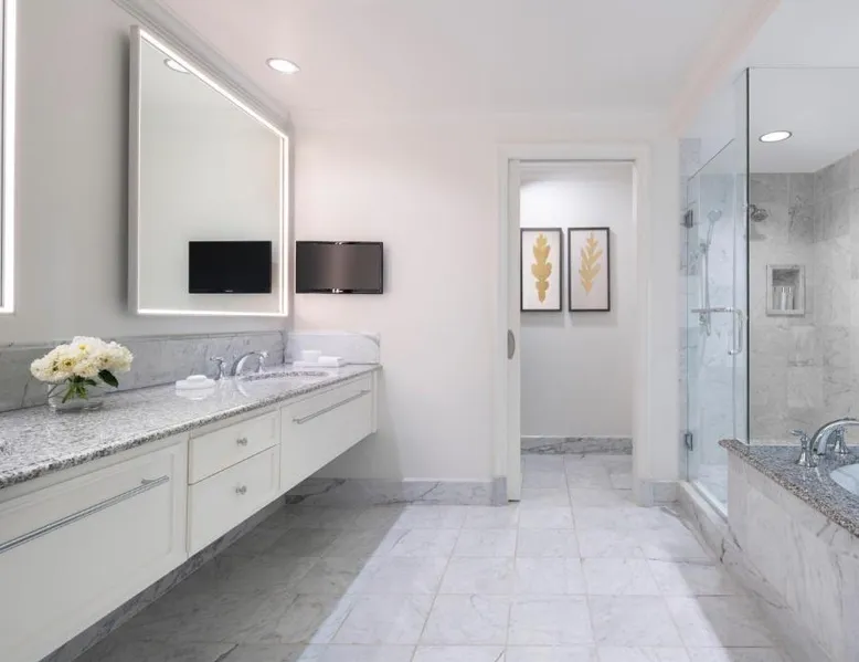 Featuring an outdoor pool with poolside dinning, this luxury resort is 15 mi from Zuma Beach and the ocean views of Pacific Coast Highway. Two fine dining options and full service spa is provided on-site. Select suites feature views of waterfalls at Four Seasons Hotel Westlake Village. Styled in refined furnishings, each elegant room provides terry cloth bathrobes, slippers and free spa toiletries. Free Wi-Fi for one device, a flat-screen TV and an iPod docking station are also included. Locally sourced, ONYX Japanese Restaurant features fresh sushi rolls and specialty cocktails in the Lobby Lounge. Pollo al forno, malanzane ala pergamina and other traditional Italian dished are featured at Mercato Italiano at Westlake Village Four Seasons Hotel. Valet parking and an indoor swimming pool are offered as well. In-room dining, concierge services, dry cleaning services and a fitness center are available to ensure guests have a comfortable stay at Four Seasons Hotel Westlake Village. Pepperdine University Malibu Campus and The Ronald Reagan Presidential Library and Museum are 15 mi away. Getty Villa is 25 mi away. Los Angeles International Airport is 45 minutes’ drive away from Four Seasons Hotel Westlake Village. Featuring wood floors and crystal chandeliers, this spacious suite offers a marble master bathroom and a guest bathroom near the entrance. Plush bathrobes are also included. A 42-inch flat-screen TV is provided in the bedroom and a 12-inch flat-screen TV is featured in the bathroom.