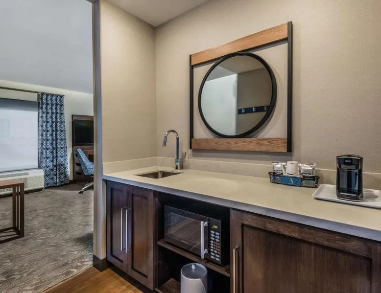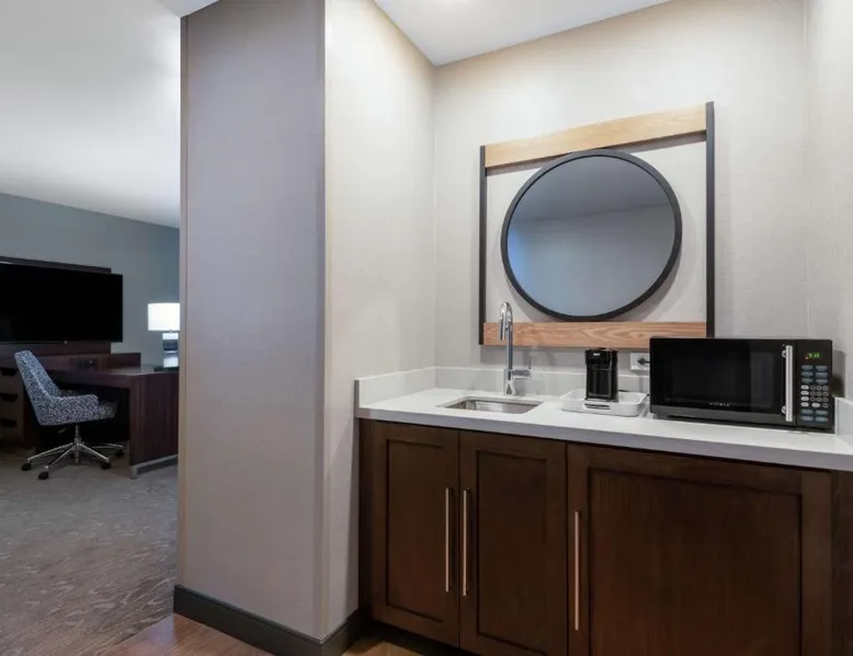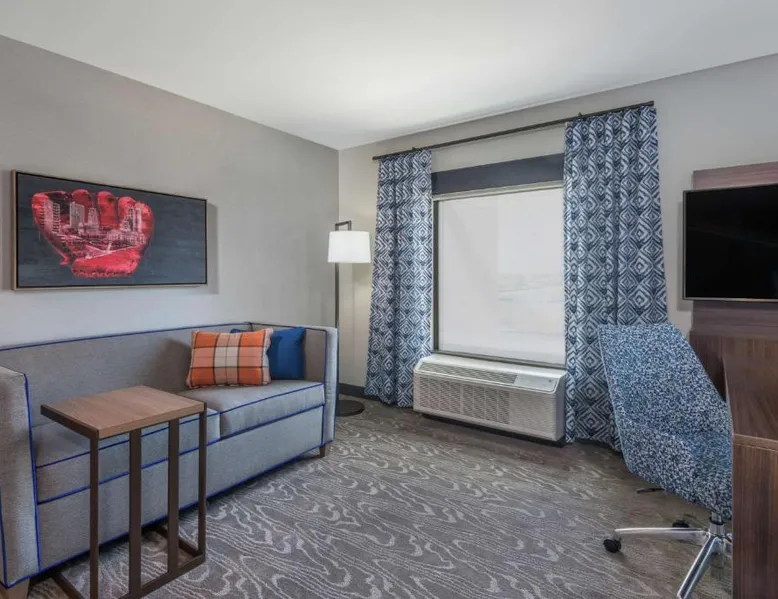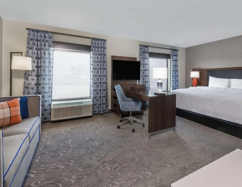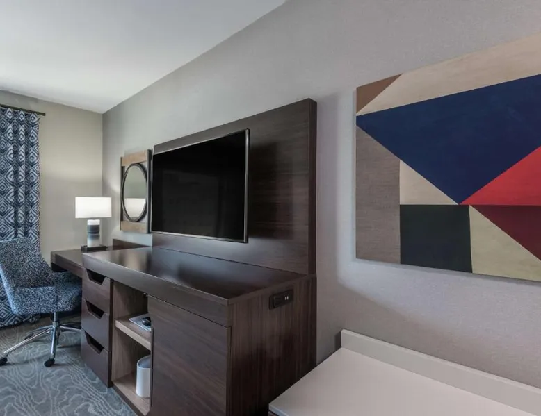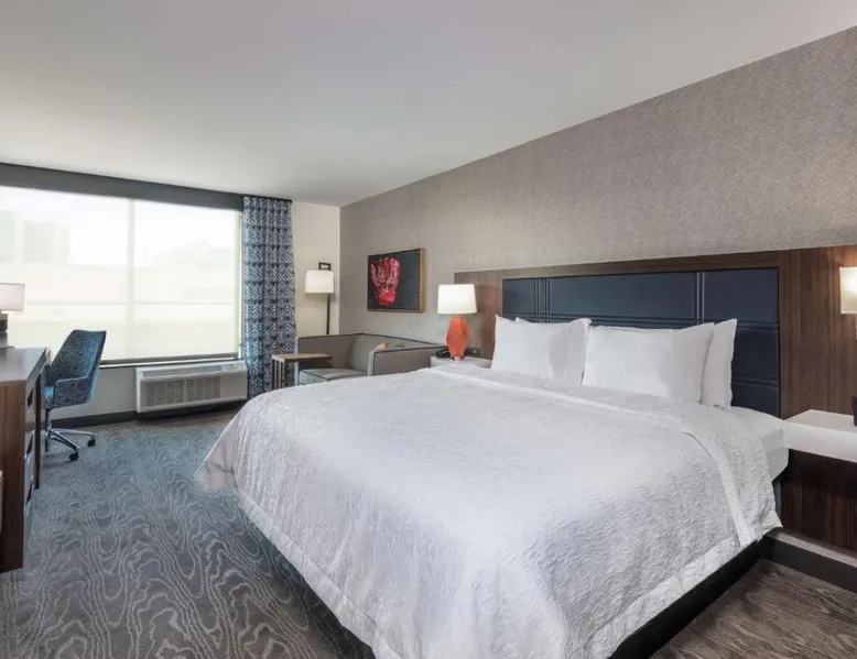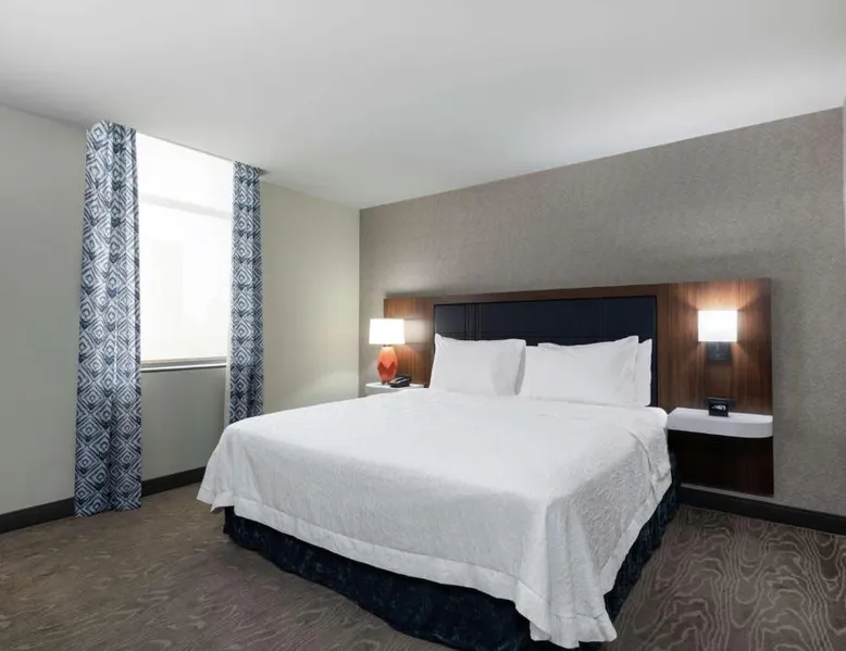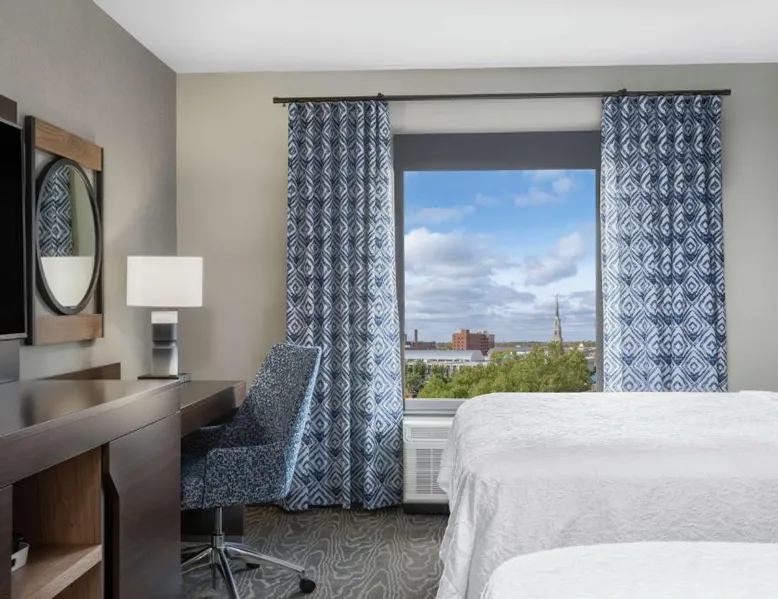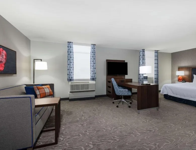 Comfortable Accommodations: Hampton Inn & Suites Fort Wayne Downtown in Fort Wayne offers rooms with air-conditioning, tea and coffee makers, hairdryers, refrigerators, and microwaves. Guests enjoy free WiFi, a fitness room, and a 24-hour front desk. Dining and Leisure: The hotel features a restaurant serving American cuisine for lunch and dinner, a bar offering cocktails, and a continental buffet breakfast with juice, fresh pastries, and fruits. A fitness room and elevator enhance the stay. Prime Location: Located 7.5 mi from Fort Wayne Airport, the hotel is a short walk from Embassy Theater and Foellinger-Freimann Botanical Conservatory. Nearby attractions include Parkview Field (1969 feet) and Fort Wayne Museum of Art (12-minute walk). Guests appreciate the convenient location, room cleanliness, and bar. The double room features air conditioning and a tea and coffee maker. The unit has 1 bed.
