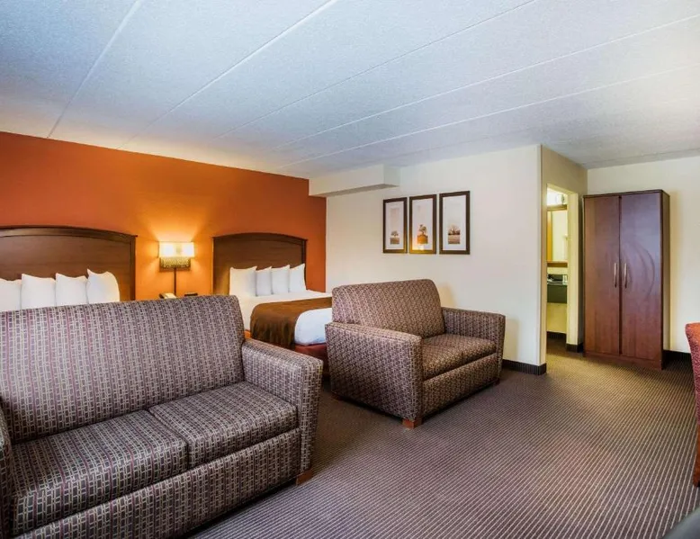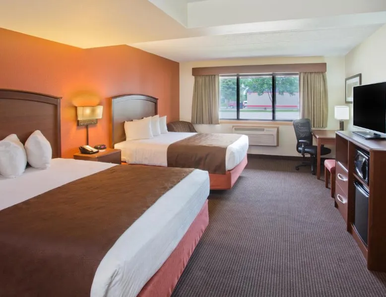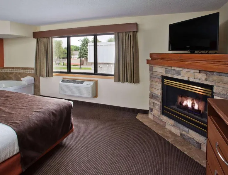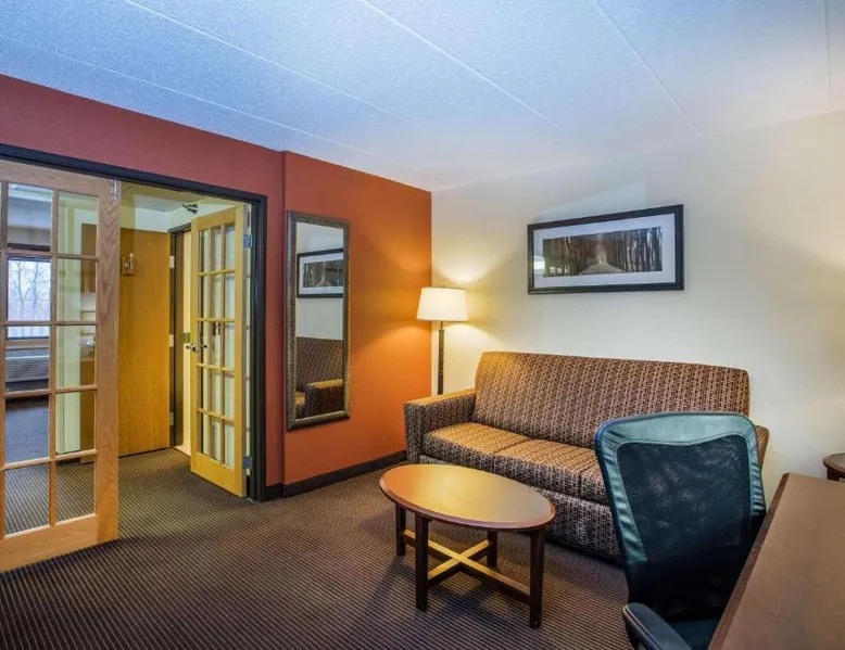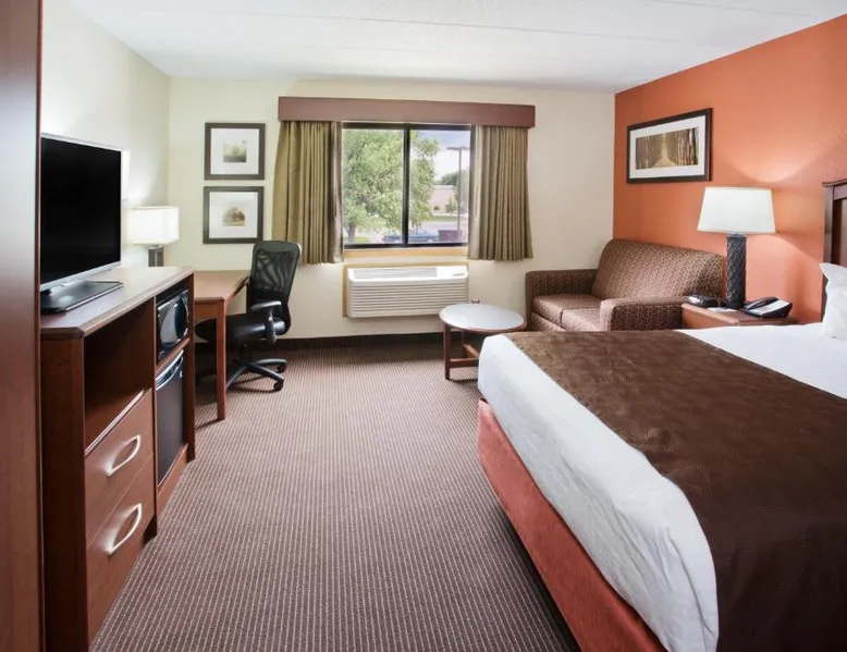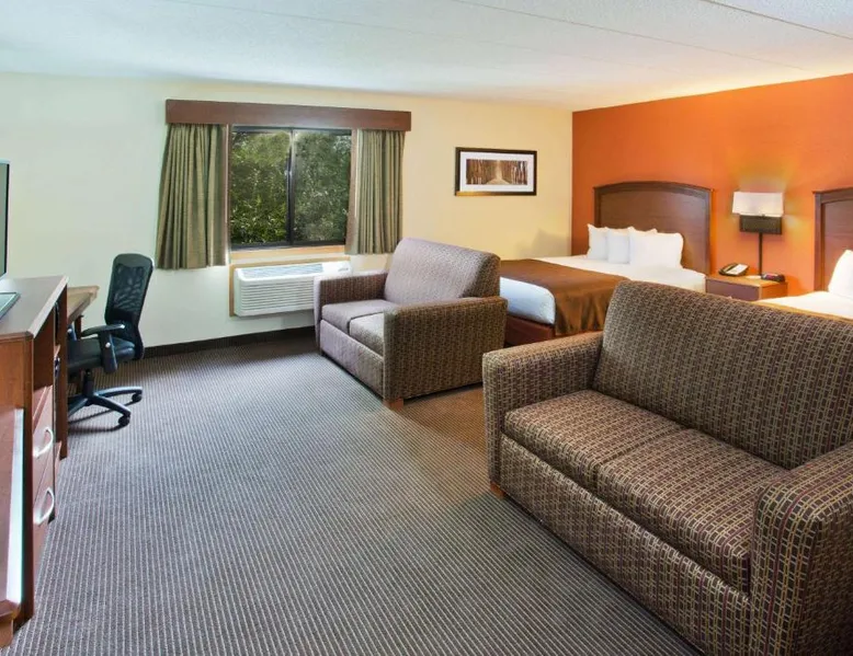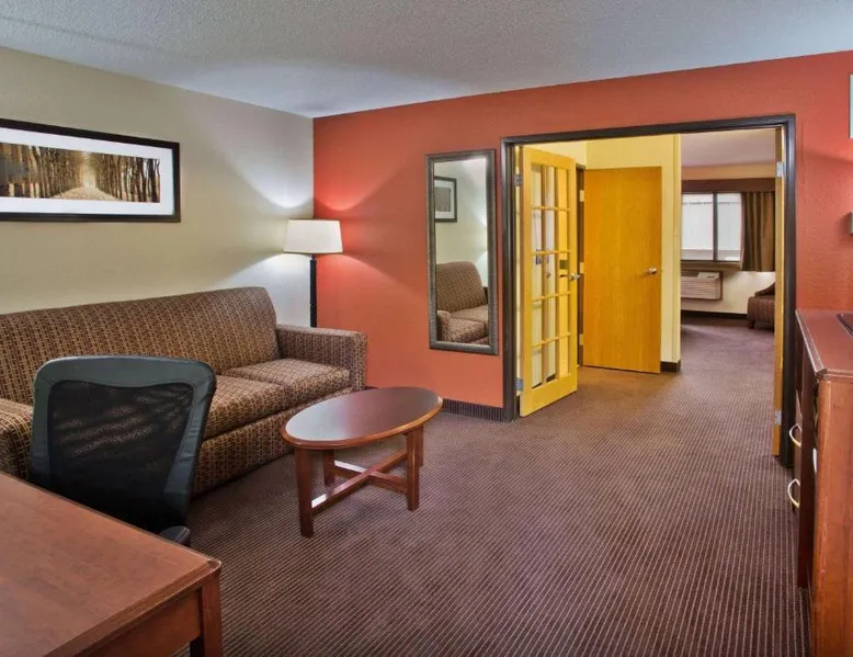 Comfortable Accommodations: AmericInn by Wyndham Grand Forks in Grand Forks offers family rooms with air-conditioning, private bathrooms, and free WiFi. Each room includes a tea and coffee maker, refrigerator, and TV. Leisure Facilities: Guests can enjoy a fitness center, indoor swimming pool, and hot tub. Additional amenities include a lounge, fitness room, and outdoor seating area. Dining Options: A variety of breakfast options are available, including continental, American, buffet, and à la carte. Breakfast includes warm dishes, fresh pastries, pancakes, and fruits. Location and Attractions: Located 6.2 mi from Grand Forks International Airport, the hotel is near attractions such as University of North Dakota (1.7 mi) and Polk County Museum (29 mi). Boating is available in the surroundings. This suite has a sofa, flat-screen cable TV, and a desk. A microwave and refrigerator are also included.