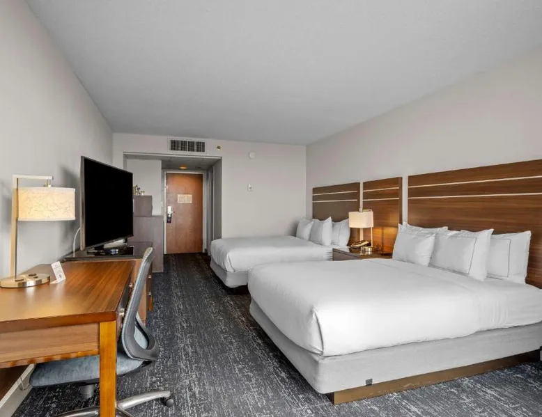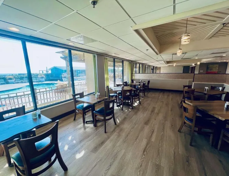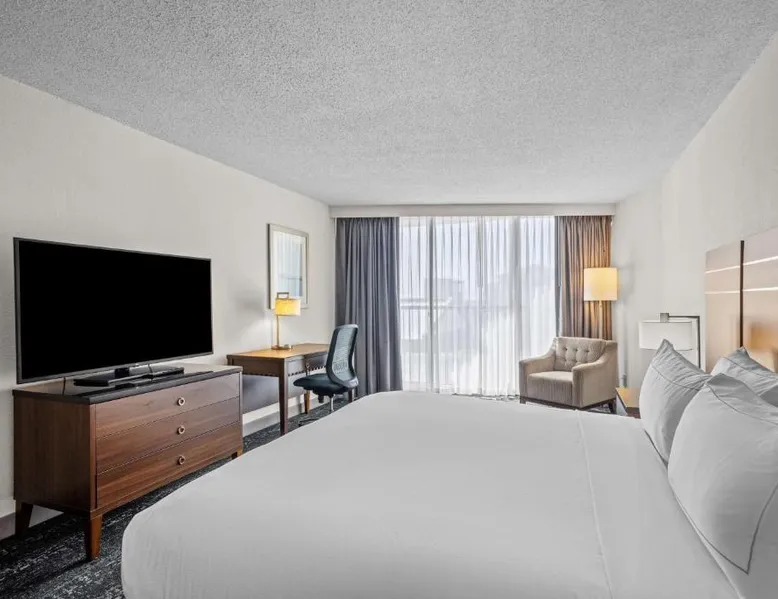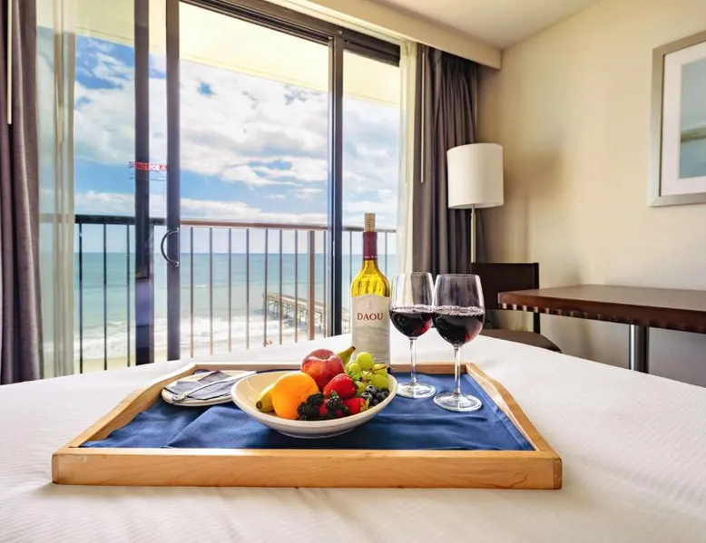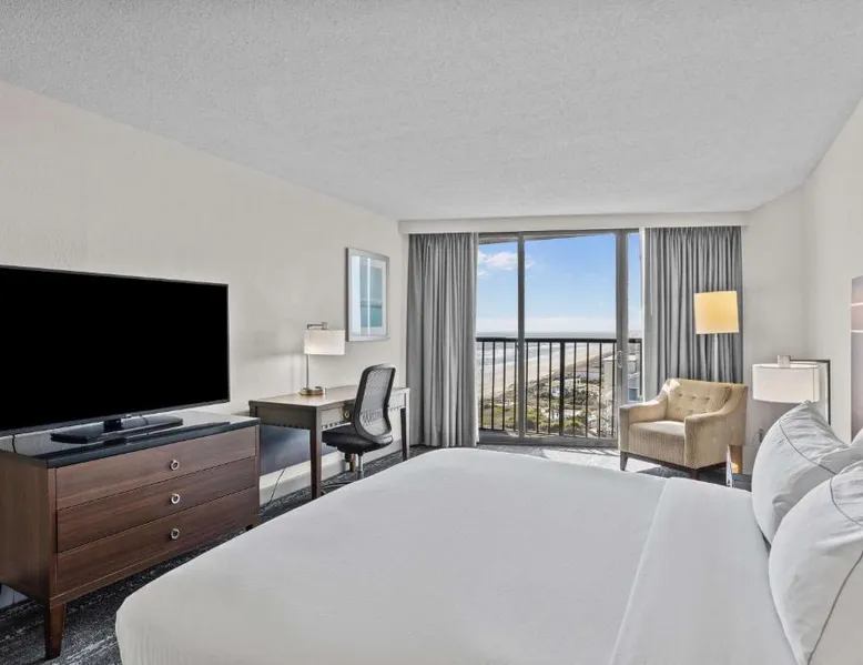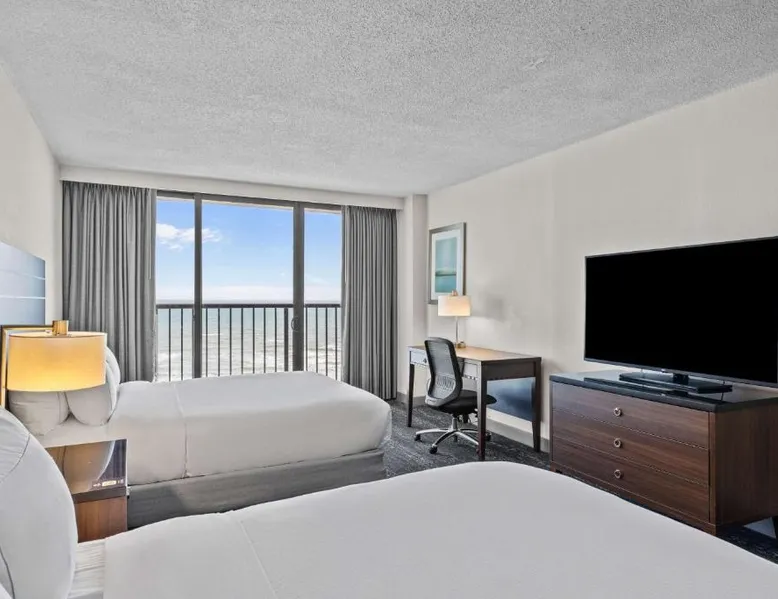 Beachfront Location: DoubleTree by Hilton Atlantic Beach Oceanfront in Atlantic Beach offers direct beachfront access, a sun terrace, and a seasonal outdoor swimming pool. Guests enjoy sea views and a fitness center for leisure activities. Comfortable Accommodations: Rooms feature air-conditioning, sea views, balconies, and modern amenities such as tea and coffee makers, refrigerators, and flat-screen TVs. Additional comforts include bathrobes, spa baths, and sofa beds. Dining and Leisure: The modern restaurant serves American cuisine for lunch and dinner, complemented by a bar. Free WiFi is available throughout the property. Guests can also enjoy a hot tub, fitness center, and outdoor seating area. Convenient Services: The hotel provides private check-in and check-out, a 24-hour front desk, concierge service, and free on-site parking. Additional amenities include a business area, child-friendly buffet, and bicycle parking. Nearby Attractions: Located a few steps from Atlantic Beach, the property is 37 mi from Coastal Carolina Regional Airport. Guests can enjoy hiking and explore nearby attractions such as Fort Macon State Park. This room features a flat-screen cable TV and coffee-making facilities.