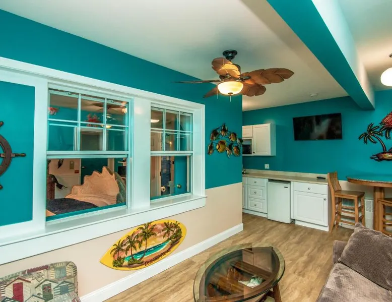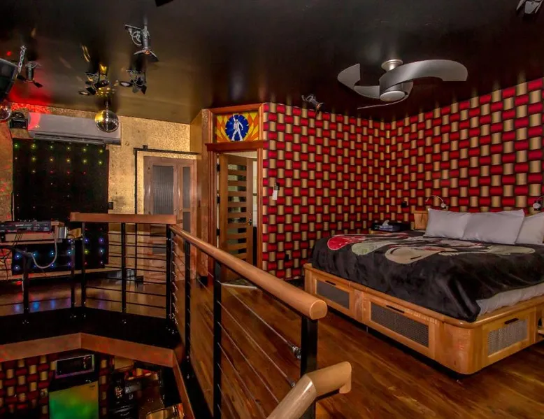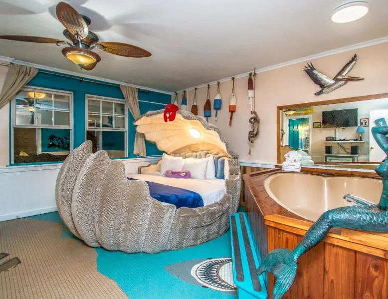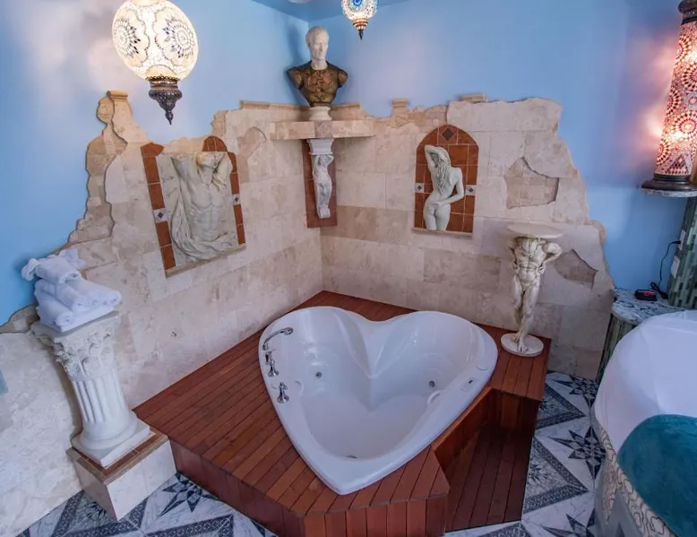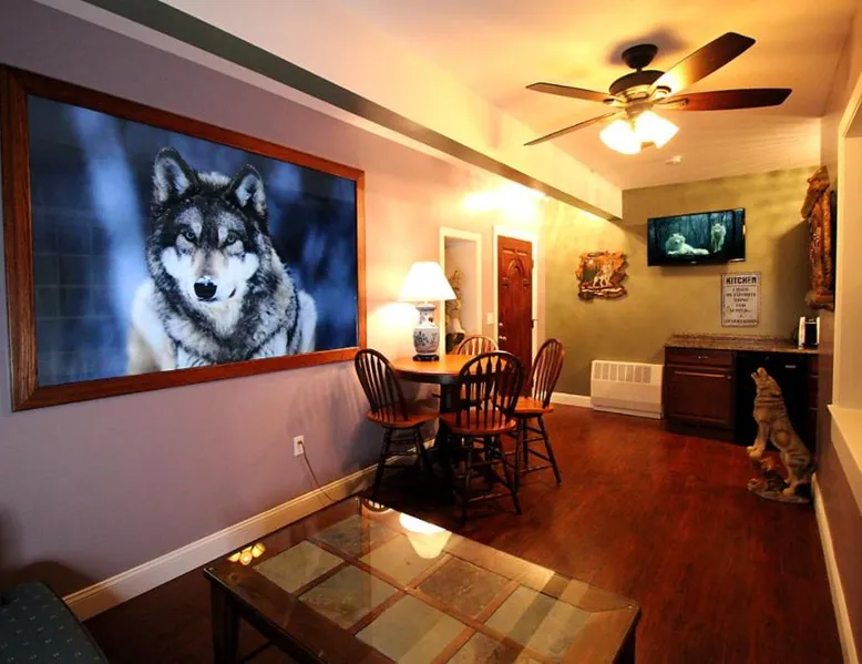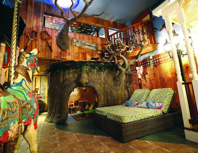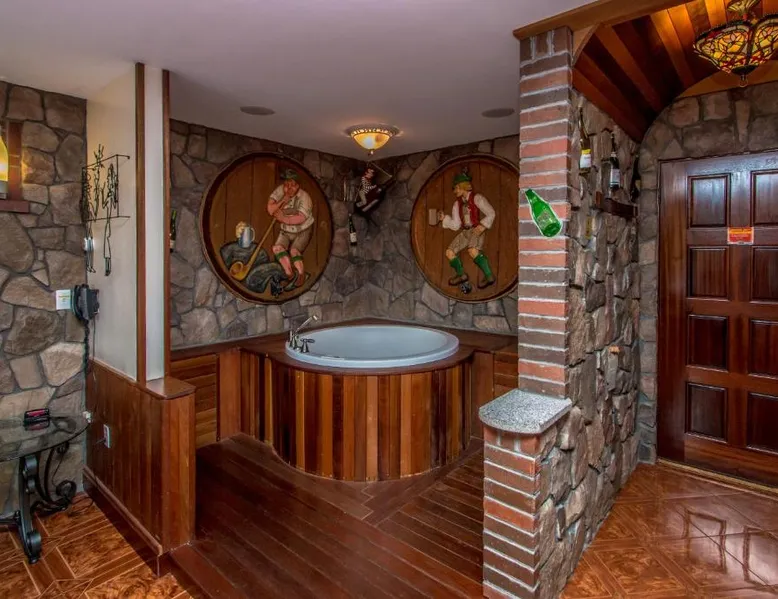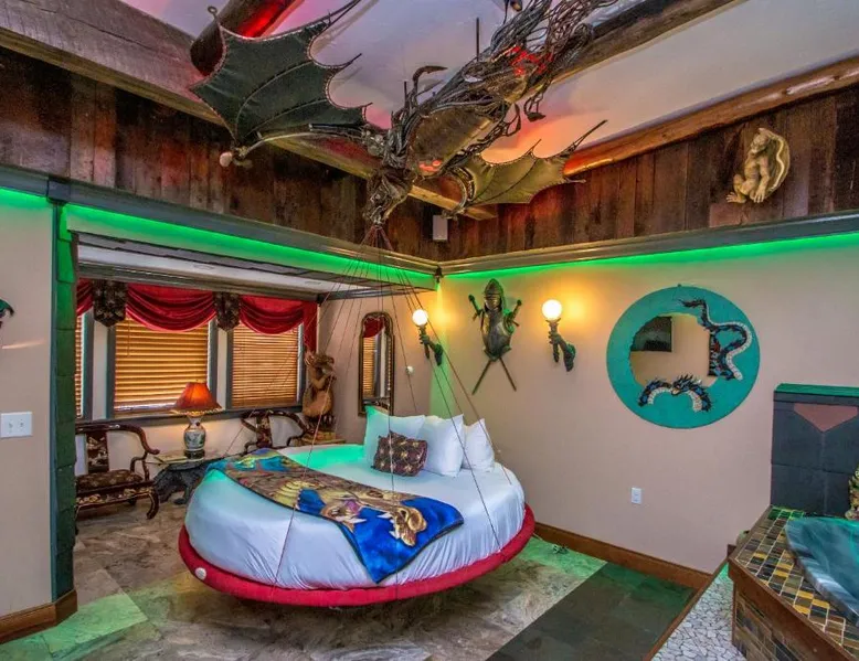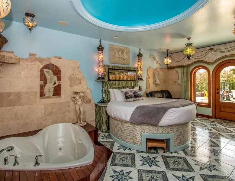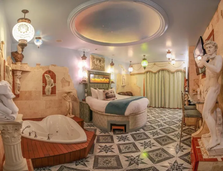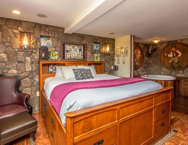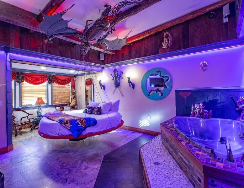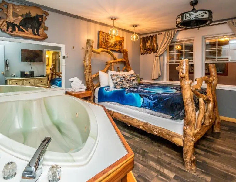 This theme hotel features uniquely decorated suites with spa baths, flat-screen cable TVs and DVD players. Adventure Suites, located just 1 mile from Conway Scenic Railroad, offers a restaurant and bar called White Horse Saloon. Cranmore Mountain is 2 miles away. The suites, which include a motorcycle suite, provide free Wi-Fi, a CD player and seating area. There is also a refrigerator. The bathrooms feature robes and a hairdryer. During their stay, guests can purchase breakfast that includes waffles and muffins. Complimentary popcorn is offered each evening. The hotel has a DVD library with over 1,500 movies and a gift shop. There is also a game room with billiards and a horseshoe pit. Adventure Suites is 1 mile from North Conway Golf Course and 8 miles from Attitash Mountain Resort. Motorcycle themed. Offers a large spa bath and small motorcycle garage with a garage door opener. Please note that the room rate is based on 2 guests. Maximum occupancy is 6 guests (see Hotel Policies)
