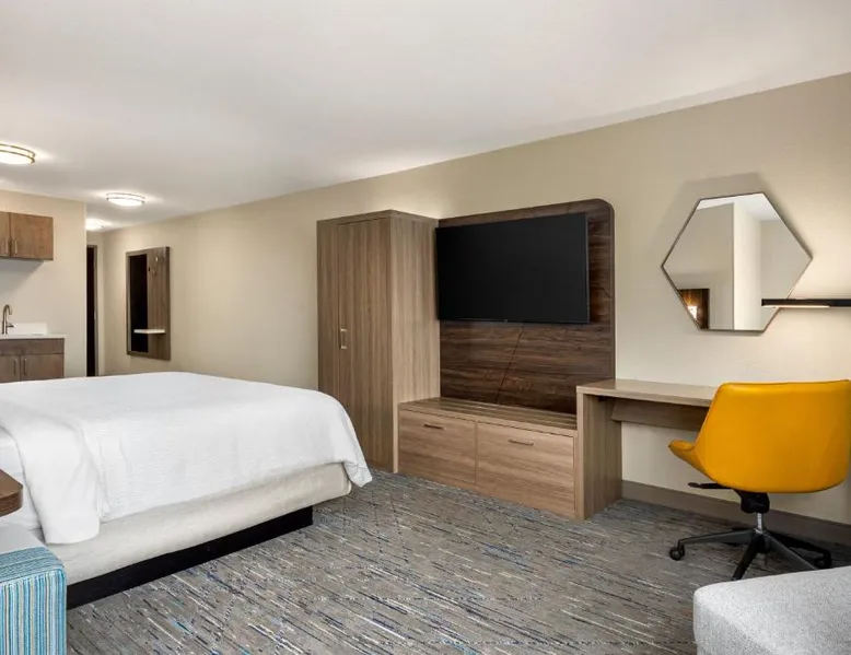 Comfortable Accommodations: Holiday Inn Express Richmond by IHG in Richmond offers air-conditioned rooms with private bathrooms, tea and coffee makers, and free WiFi. Each room includes a work desk, TV, and wardrobe, ensuring a pleasant stay. Facilities and Services: Guests can enjoy a fitness center, indoor swimming pool, and free on-site private parking. Additional amenities include a business area, outdoor seating, and a 24-hour front desk. Free WiFi is available throughout the property. Breakfast and Dining: A complimentary American buffet breakfast is served daily, featuring fresh pastries, pancakes, fruits, and juice. The dining area provides a comfortable space for guests to start their day. Location and Attractions: Located 33 mi from James M. Cox Dayton International Airport, the hotel is near attractions such as Richmond State Park and the Richmond Museum of Art. Guests appreciate the room cleanliness, breakfast provided by the property, and attentive staff. This room is equipped with a flat-screen TV, fridge, microwave, and an accessible bathroom with grab bars.