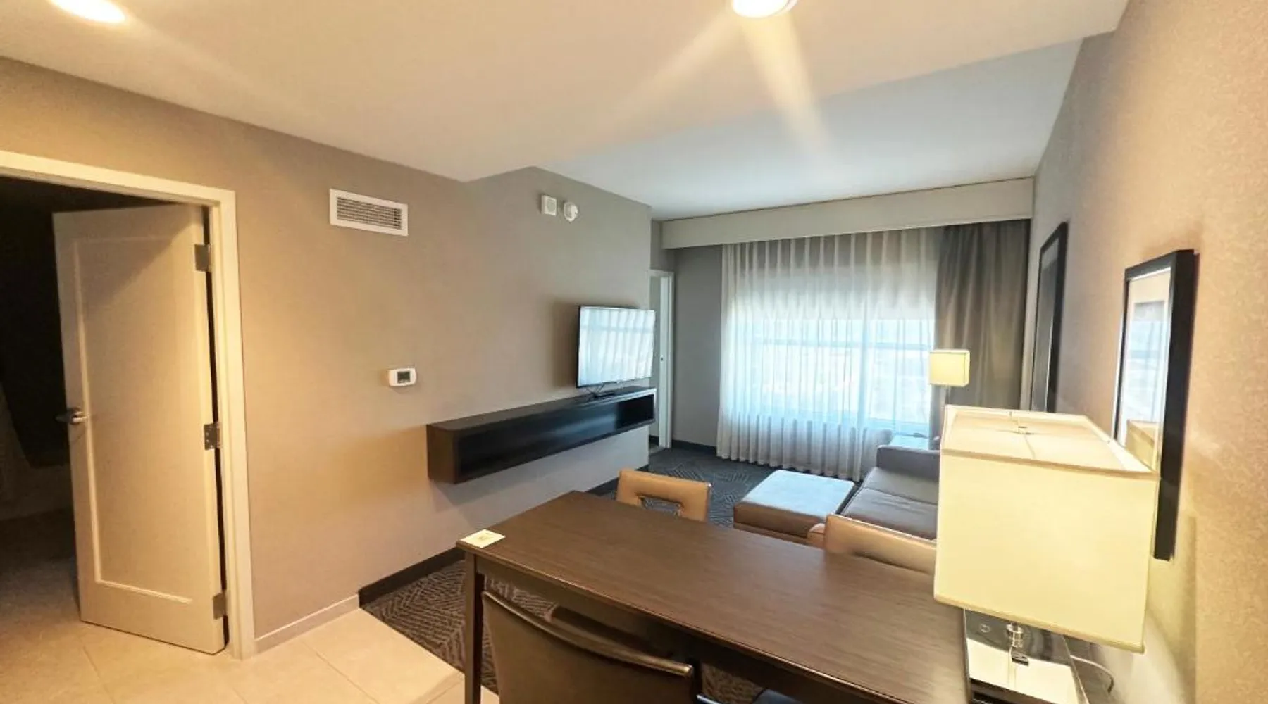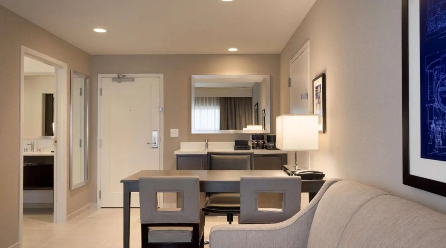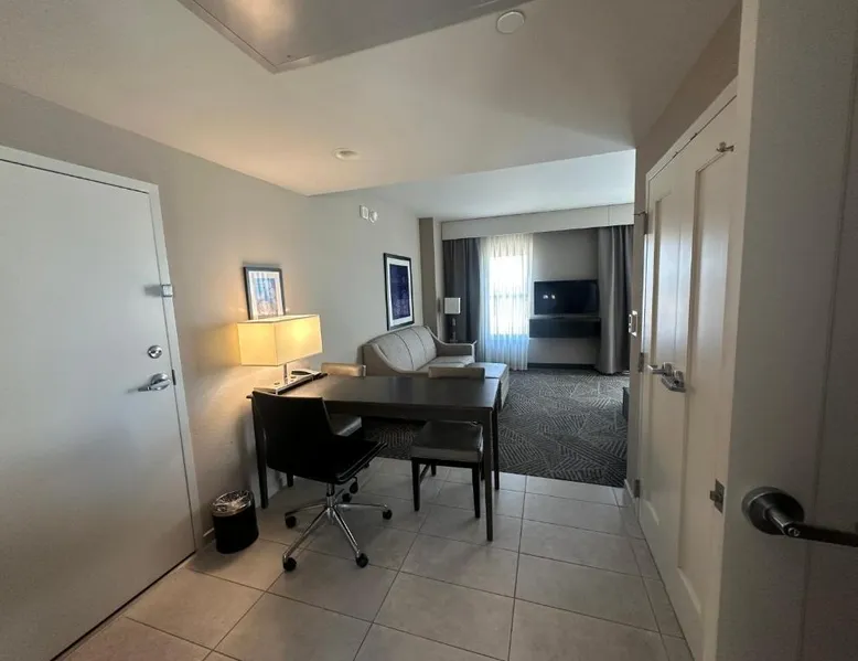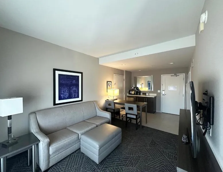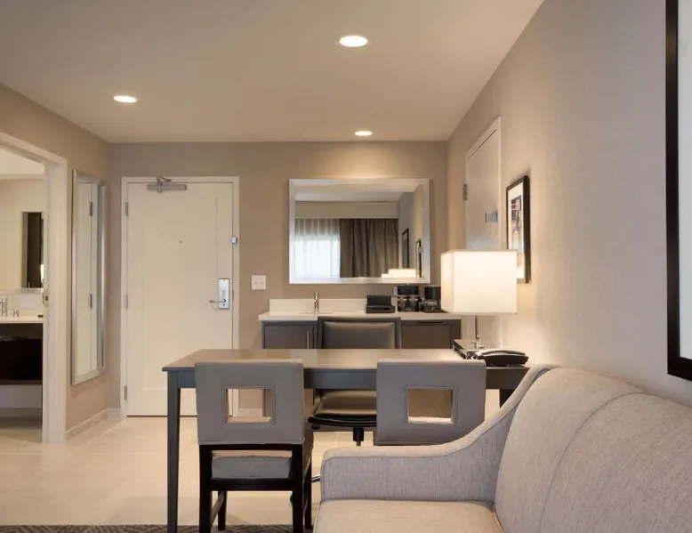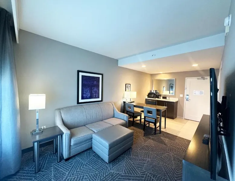 Comfortable Accommodations: Rooms feature air-conditioning, free WiFi, sofa beds, and work desks. Additional amenities include free toiletries, microwaves, and TVs. Dining and Leisure: The family-friendly restaurant serves American cuisine with a buffet breakfast. Guests can also enjoy the indoor swimming pool, fitness center, terrace, and bar. Convenient Location: Located in Olathe, the hotel is 29 mi from Kansas City International Airport. Nearby attractions include the National World War I Museum at Liberty Memorial (18 mi) and Union Station Kansas City (19 mi). Guest Services: The property offers a 24-hour front desk, free on-site parking, room service, and a business area. Additional facilities include a hot tub, fitness room, and minimarket. This suite is air-conditioned and features a flat-screen TV with cable channels, a seating area and a safe deposit box. The unit offers 2 beds.