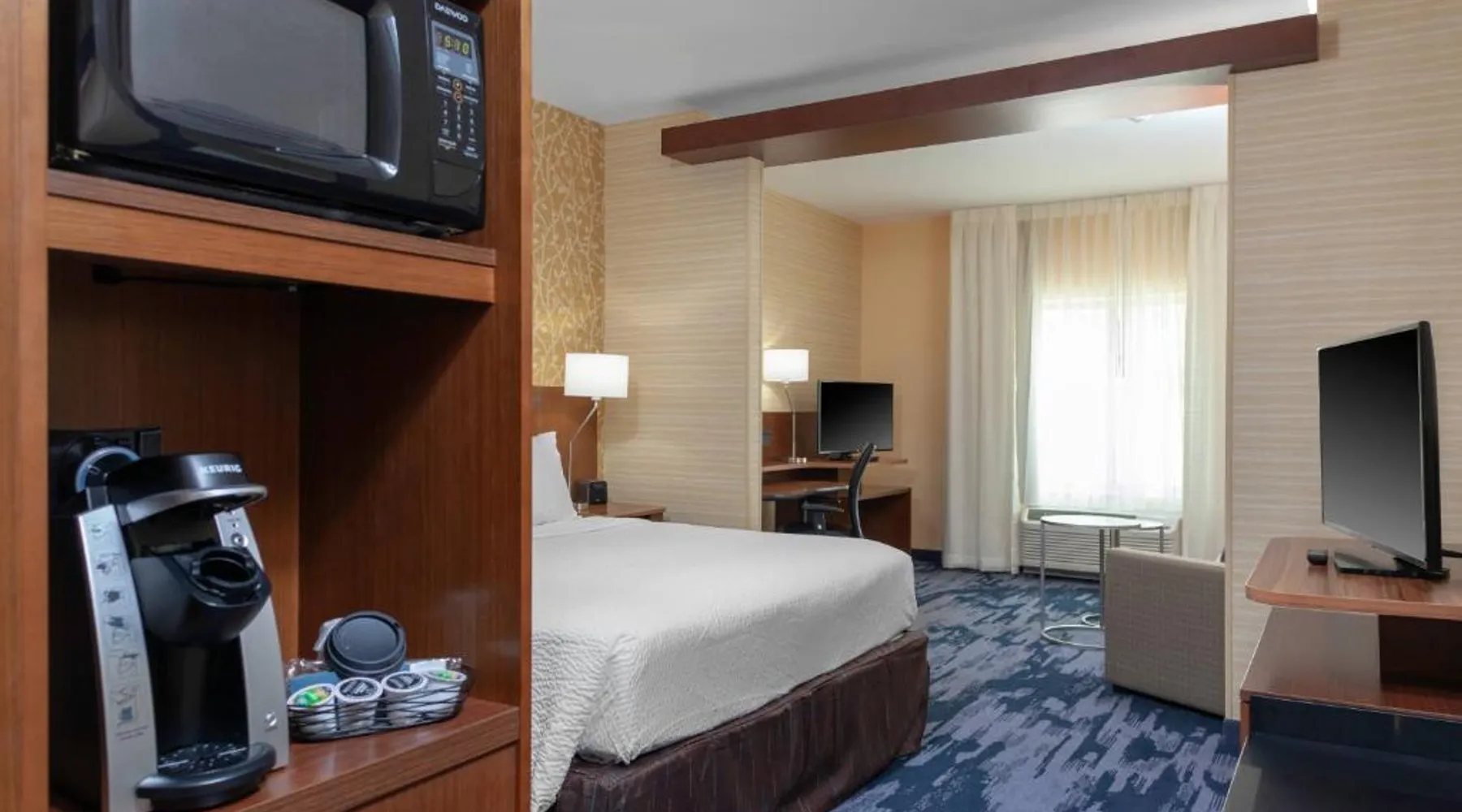 Located off Interstate 20, Fairfield Inn & Suites by Marriott Augusta Washington Rd./I-20 features a continental hot breakfast and free Wi-Fi. The Augusta National Golf Club is less than 2 miles away. A microwave, a small refrigerator and tea- and coffee-making facilities are found in each simply decorated room at the Fairfield Inn & Suites by Marriott Augusta Washington Rd./I-20. Rooms are equipped with a smart TVs with access to a streaming media service and a premium movie channel. An ergonomic work desk is provided as well. National Science Center Fort Discover is 10 minutes’ drive from the hotel. Augusta University is 4 miles away. This room features a living room area, two flat-screen TVs and an ergonomic desk. It also includes a refrigeration, microwave, coffee maker and air conditioning.