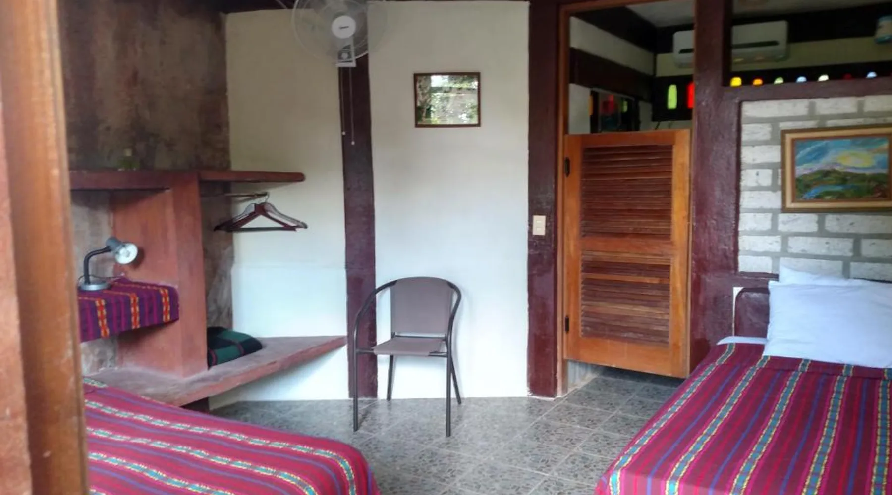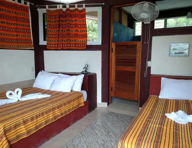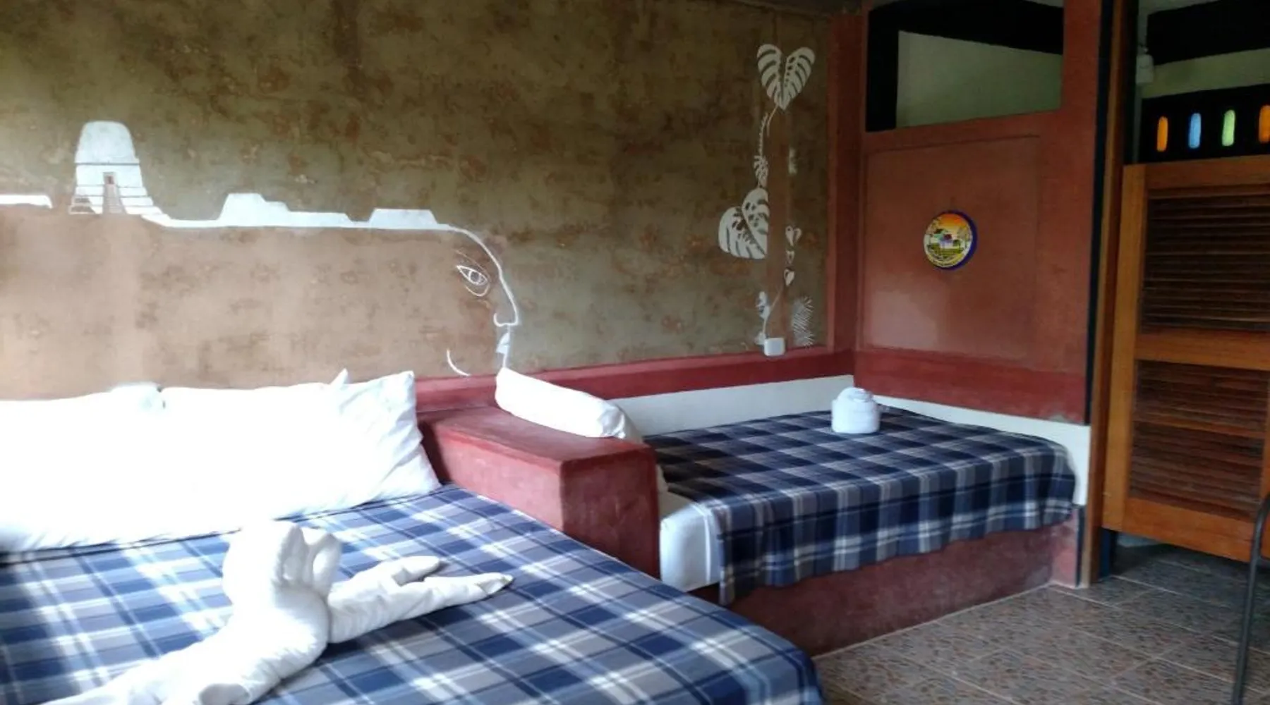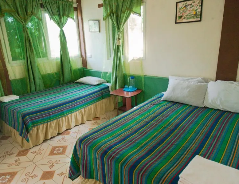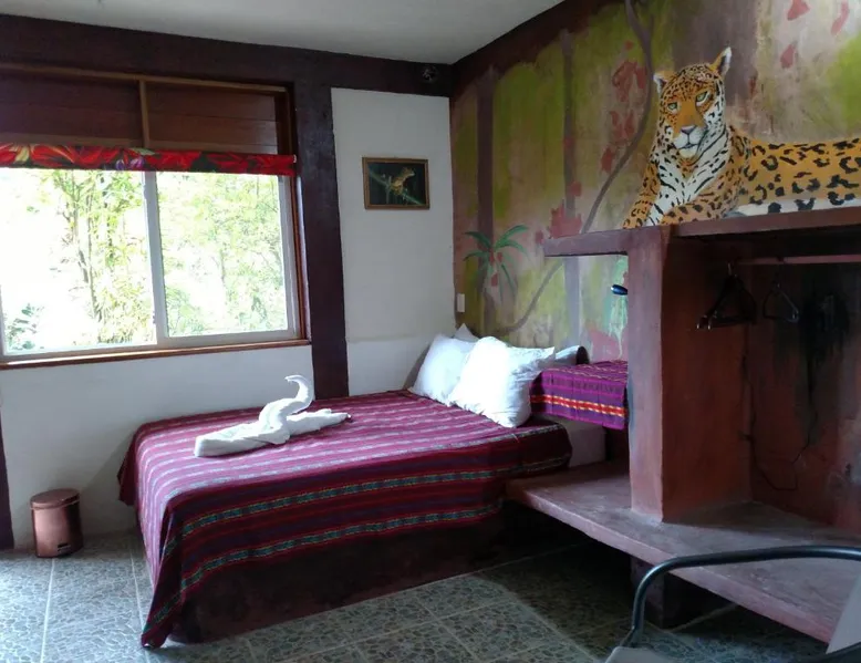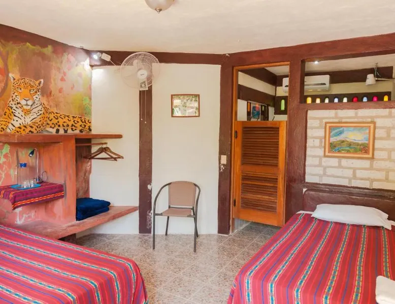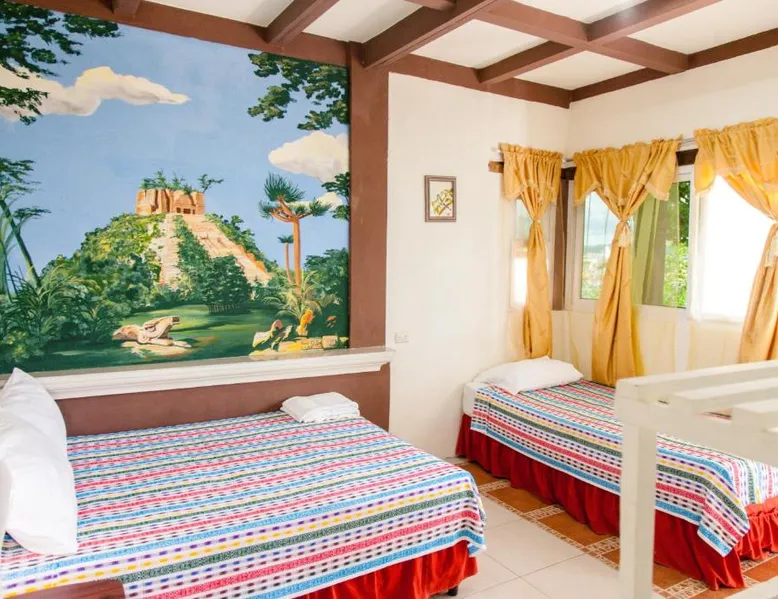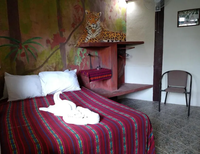 Zapote Tree Inn is located less than 16 minutes from Flores' airport and 4 minutes away from Flores island by boat, located at a privileged point to appreciate sunsets and sunrises overlooking the island and the lake. All our rooms have mosquito screens on the windows and doors. We are at the edge of the jungle with birds, iguanas, squirrels, hummingbirds, etc., and our trees provide fresh breezes and fruits. We are within 8 minutes walking distance of the archaeological excavations of Tayasal and 15 minutes walking on shady trails to the beach El Chechenal. Welcome to our home! This triple room offers a pool with a view. The triple room provides air conditioning, a private entrance, a terrace with lake views as well as a private bathroom featuring a walk-in shower. The unit offers 2 beds.