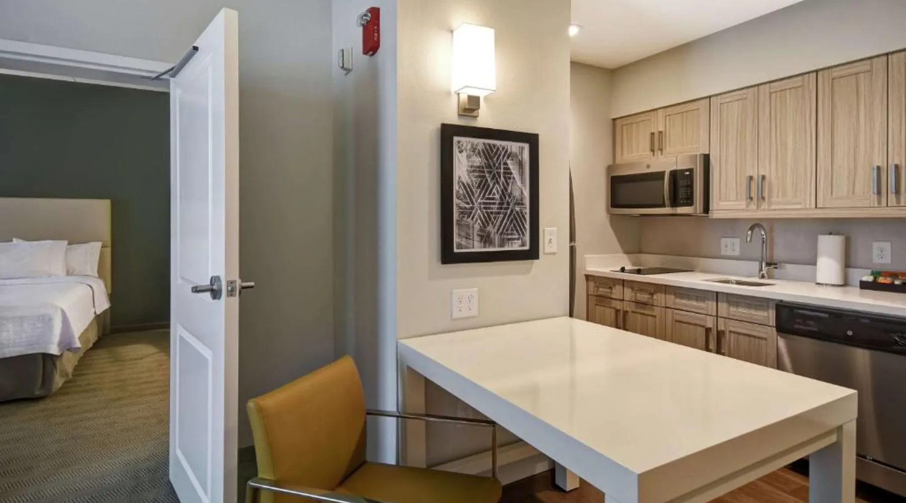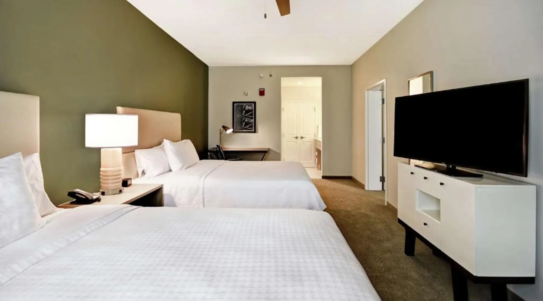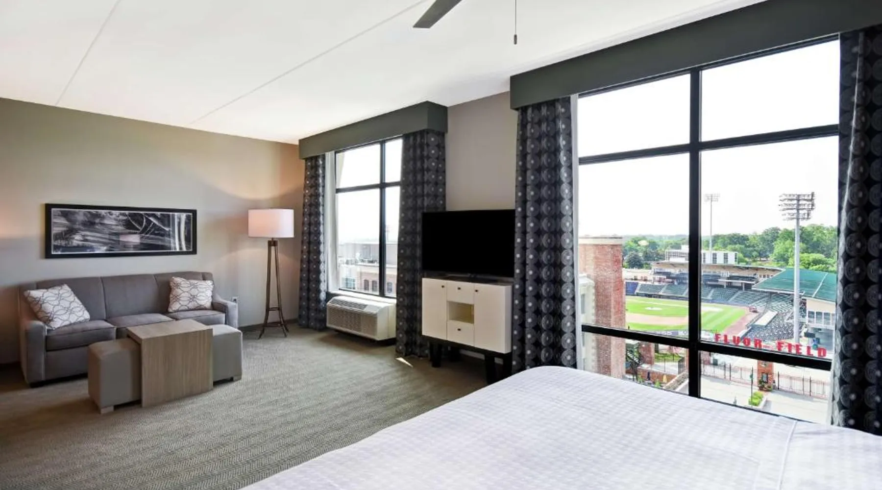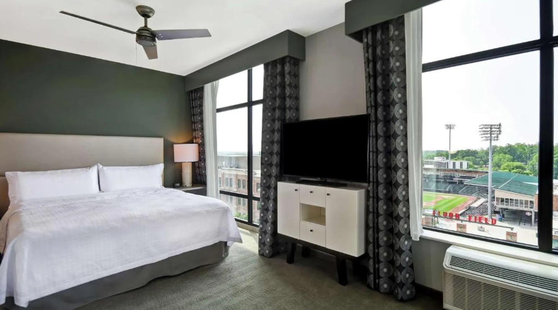 Comfortable Accommodations: Homewood Suites By Hilton Greenville Downtown in Greenville offers air-conditioned rooms with kitchen facilities, free WiFi, and amenities such as a fitness center, terrace, and seasonal outdoor swimming pool. Convenient Facilities: Guests can enjoy a lounge, outdoor fireplace, fitness room, and a 24-hour front desk. Additional services include a minimarket, daily housekeeping, child-friendly buffet, and bicycle parking. Prime Location: Located in the city center, the hotel is a 2-minute walk from Fluor Field and less than 0.6 mi from Peace Center and The Children's Museum Of The Upstate. Greenville-Spartanburg International Airport is 14 mi away. Guest Satisfaction: Highly rated for its convenient location, attentive staff, and immaculate rooms. Guests can make meals in the kitchen that features a stovetop, a refrigerator, a dishwasher and kitchenware. This suite is air-conditioned and has a seating area with a flat-screen TV, a tea and coffee maker, a wardrobe, a safe deposit box, as well as a sofa. The unit has 2 beds.