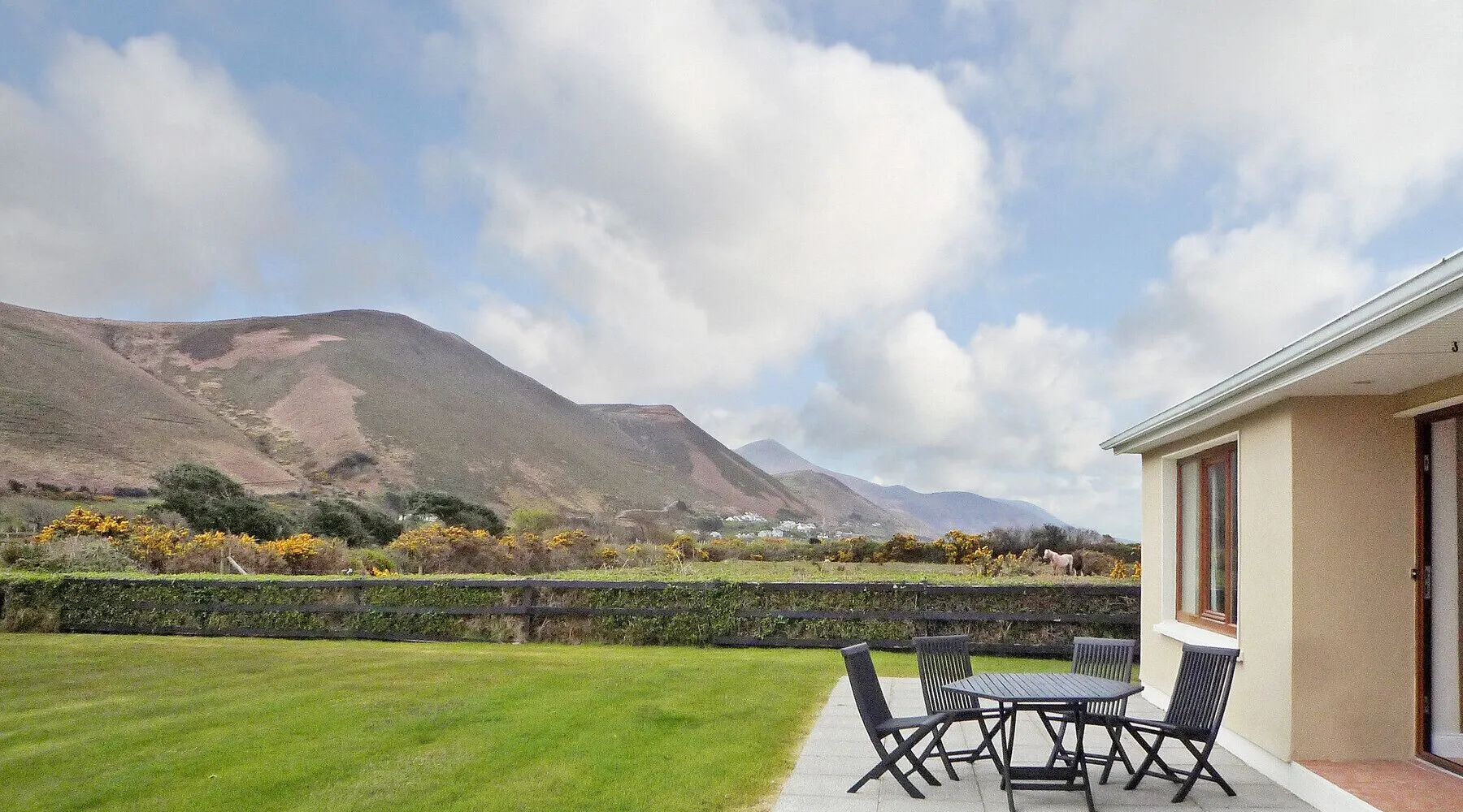 Behy Lodge Glenbeigh - DescriptionBehy Lodge Glenbeigh is a pet-friendly holiday home situated in an idyllic area close to the golden sands of Rossbeigh beach in County Kerry. Rossbeigh or Rossbehy, is a beautiful blue flag beach extending 11 km located on the Iveragh Peninsula. This beach side holiday home is a wonderful base for swimming, water sports, walking or horse-riding holiday in Ireland. Relax and enjoy the peace and tranquillity of your surroundings at this coastal holiday accommodation in Kerry. Located on Ireland’s Wild Atlantic Way and on the famous Ring of Kerry route, a magnificent base for your next self-catering holiday in the scenic Kingdom of Kerry. Behy Lodge Glenbeigh – Sleeps 8Behy Lodge is spacious and bright self-catering holiday accommodation in County Kerry. The large and modern kitchen comes with everything you would expect from a self-catering holiday home in Ireland. This holiday has 4 bedrooms sleeping 8 guests comfortably: Property layout – ground floor: -Cottage style kitchen with kitchen table that can seat 4 guests -Open plan living area with open fire and mountain views -Dining area -Bedroom 1: double ensuite sleeping 2 -Bedroom 2: double sleeping 2 -Bedroom 3: double sleeping 2 -Bedroom 4: twin sleeping 2 -Family bathroom with overhead shower, WC & basin Outside this ideally located self-catering holiday accommodation is a fabulous well-maintained garden. Enjoy preparing a summer BBQ from the Weber Gas BBQ perfect for alfresco dining. From this beautiful garden there are endless countryside views with a large patio area perfect for alfresco dining. Children will also love the mature garden providing ample space outside sports and exploring. Behy Lodge Glenbeigh has WIFI available. Towels are provided within the home. Pet Friendly Holiday Home Behy Lodge accepts pets however please note the garden is not enclosed, your pet is not permitted in the bedrooms and a maximum of 2 dogs allowed per stay. Please reserve your pet at the time of booking via our call centre, as your pet will not be accepted without prior confirmation. Local Area and Tourist AttractionsGlenbeigh is a truly magical place, immerse yourself in the friendliness and hospitality of the local people and the beauty of this wonderful holiday destination in County Kerry. Things to do in a local area: - Glenbeigh Horseshoe ( part of the greater “Kerry Way”) - Rossbeigh Strand (blue flag beach) - Kerry Bog Village Museum - Kells Bay House and Gardens - Lough Caragh - Carrauntoohil - Valentia Island - Glenbeigh pubs, restaurants and bars - Dooks Golf Club only 2km away - Rossbeigh Beach Riding Centre IMPORTANT NOTES1. Heating and Electricity: This is an extra charge which is mostly payable to the Property Manager/Owner. In some cases, energy is charged at a fixed daily rate or a rate per unit on the units consumed or you are required to top up a Pre-Paid Meter while in others, energy charges are included in the rate you have paid. We advise you to check with the local Owner/ Property Manager prior to arrival how this is calculated or prior to making the booking. 2. Security Deposit: A minimum refundable security deposit of €200 (per property) must be paid prior to check-in to your holiday home to the local Property Manager/ Owner. This is either taken over the phone by pre-authorizing your credit card when you call the Property Manager to arrange your arrival time 48 hours in advance of arrival or at others it is taken on arrival. In some locations and at certain times of year this can increase to €500 per property.