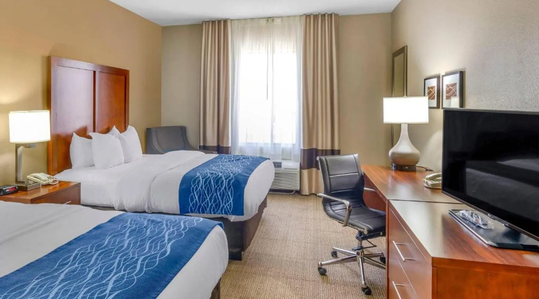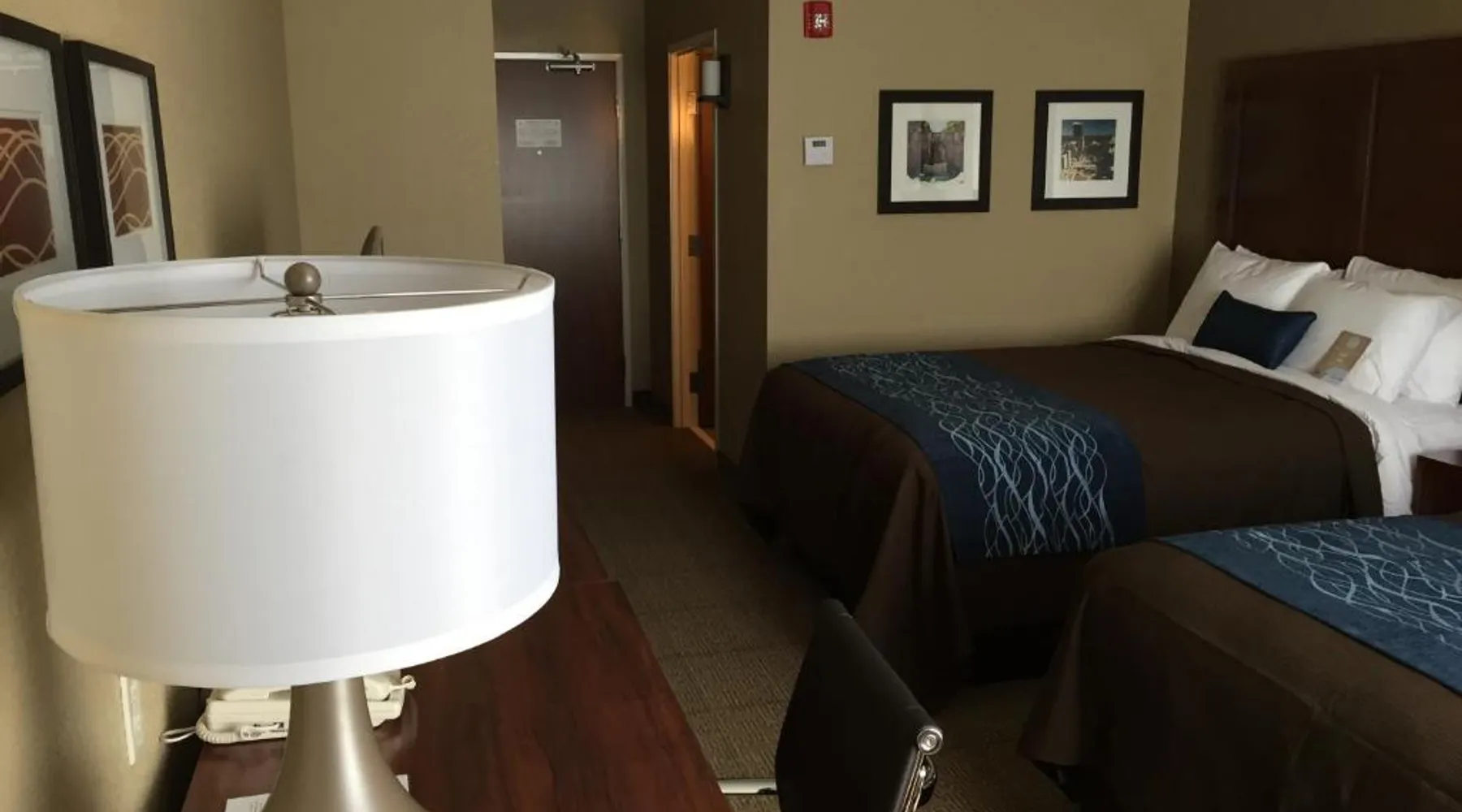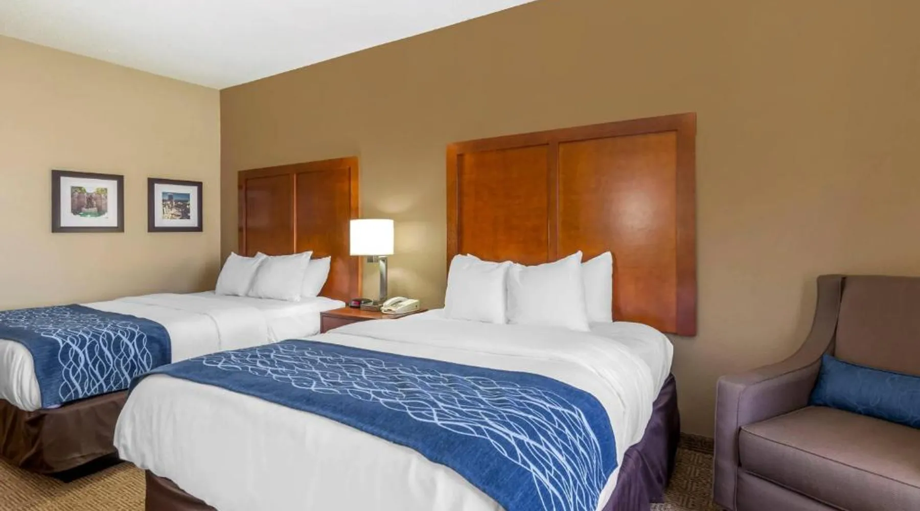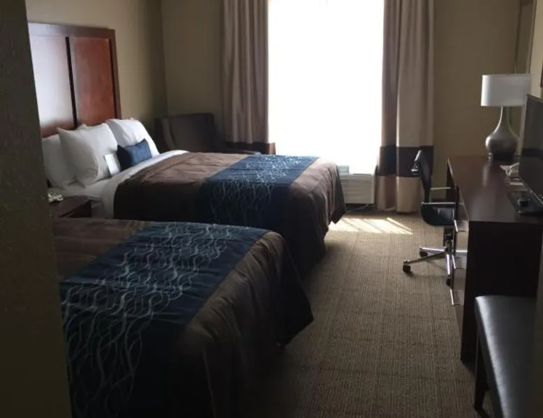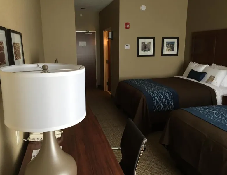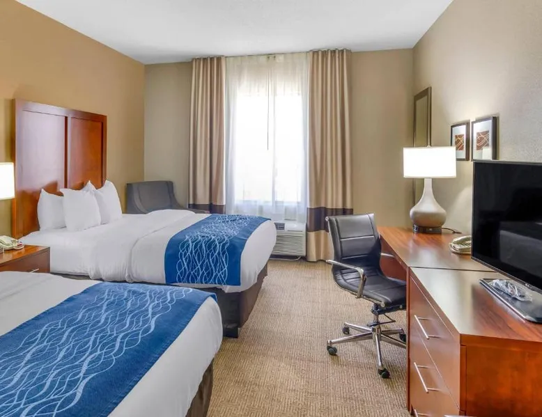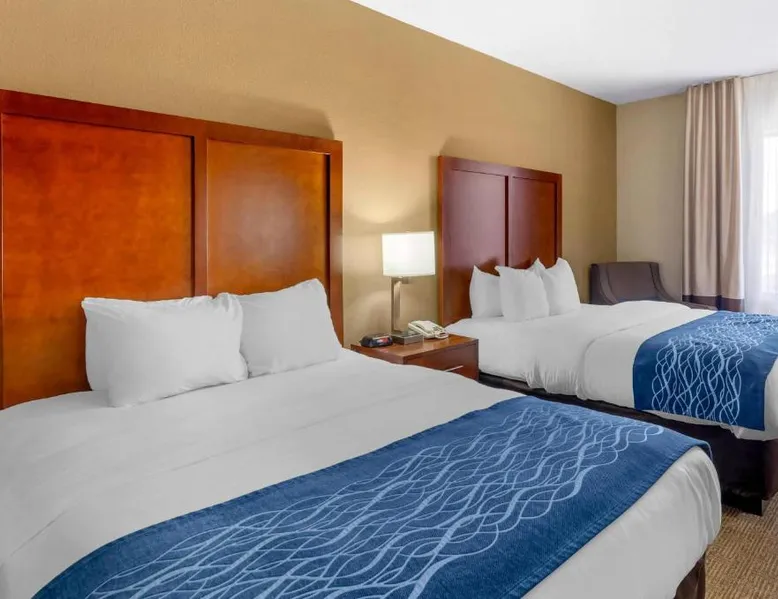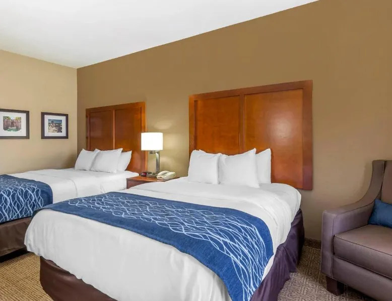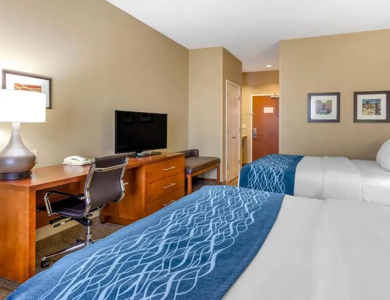 Comfortable Accommodations: Comfort Inn & Suites Lynchburg Airport - University Area in Lynchburg offers adults-only rooms with free WiFi, air-conditioning, and private bathrooms. Each room includes a work desk, refrigerator, and TV. Exceptional Facilities: Guests can enjoy a fitness center, seasonal outdoor swimming pool, and outdoor seating area. Additional amenities include a lounge, minimarket, and business area. Delicious Breakfast: A continental buffet breakfast with gluten-free options is served daily, featuring warm dishes, fresh pastries, fruits, and juice. Convenient Location: Located a few steps from Lynchburg Regional Airport, the hotel is close to Liberty University (2.5 mi), Lynchburg Stadium (6.2 mi), and other attractions. Free on-site private parking is available. This family room has a tea and coffee maker, a seating area and a TV with cable channels. The unit has 2 beds.