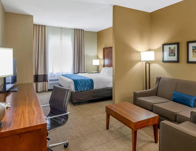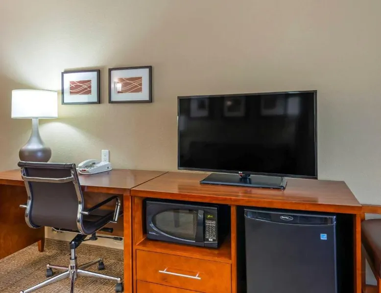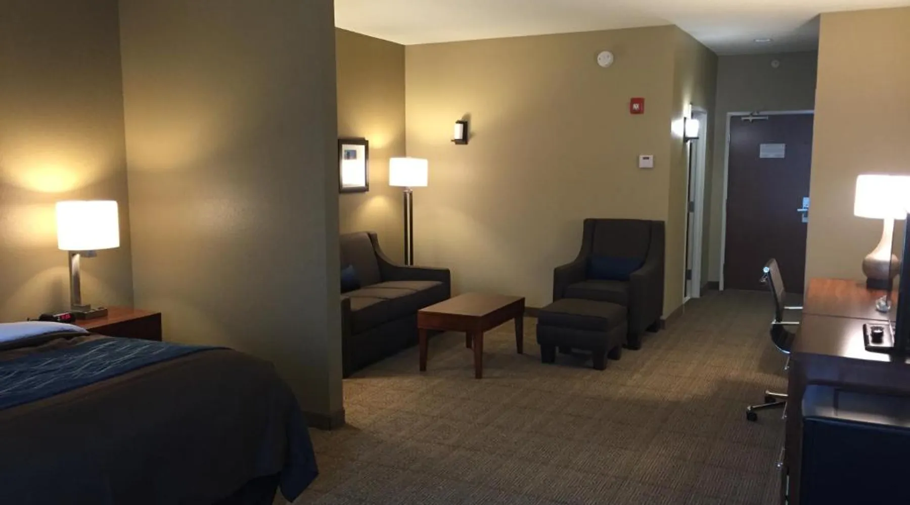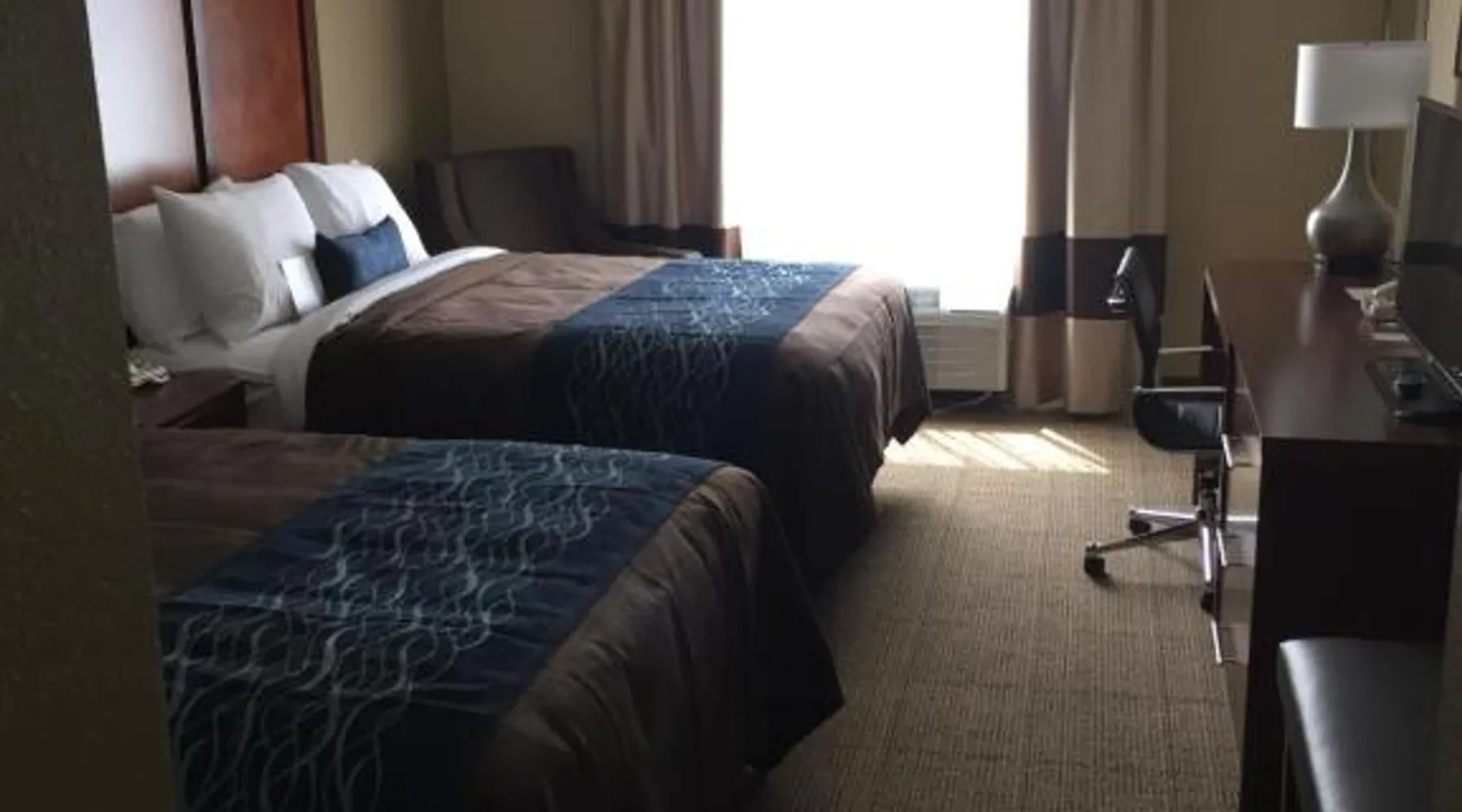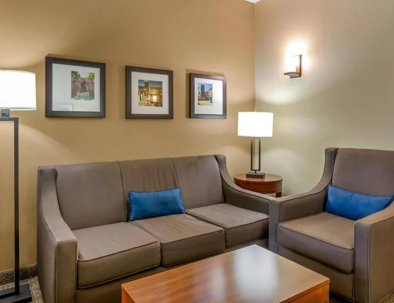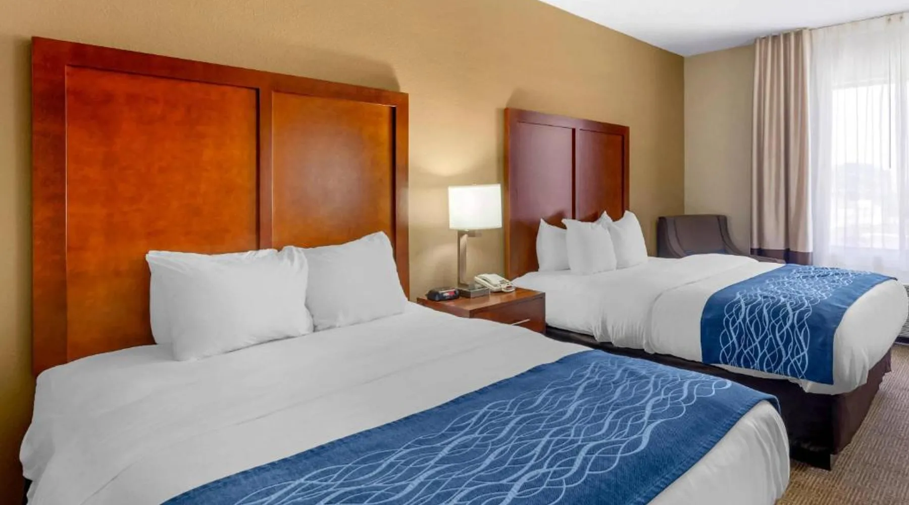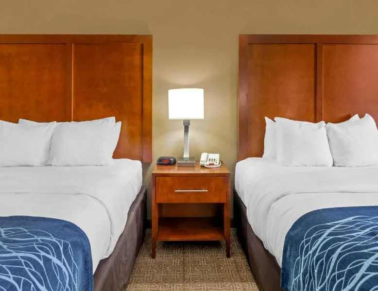 Comfortable Accommodations: Comfort Inn & Suites Lynchburg Airport - University Area in Lynchburg offers adults-only rooms with free WiFi, air-conditioning, and private bathrooms. Each room includes a work desk, refrigerator, and TV. Exceptional Facilities: Guests can enjoy a fitness center, seasonal outdoor swimming pool, and outdoor seating area. Additional amenities include a lounge, minimarket, and business area. Delicious Breakfast: A continental buffet breakfast with gluten-free options is served daily, featuring warm dishes, fresh pastries, fruits, and juice. Convenient Location: Located a few steps from Lynchburg Regional Airport, the hotel is close to Liberty University (2.5 mi), Lynchburg Stadium (6.2 mi), and other attractions. Free on-site private parking is available. This family room has a tea and coffee maker, a seating area and a TV with cable channels. The unit has 2 beds.