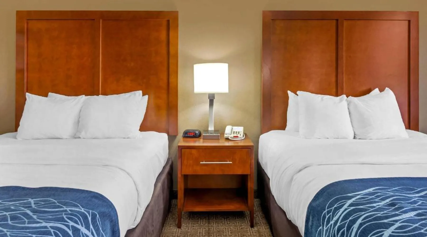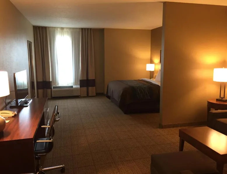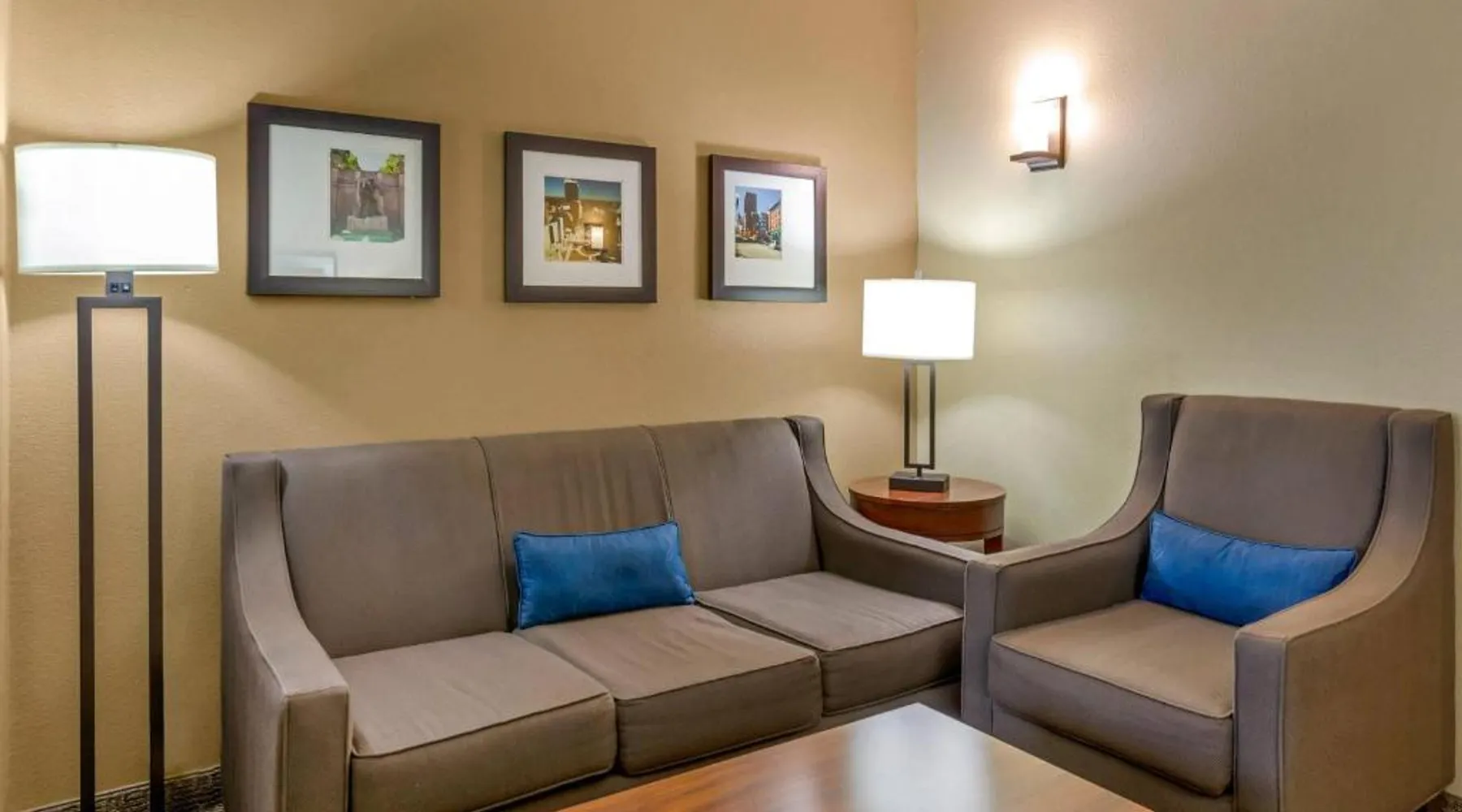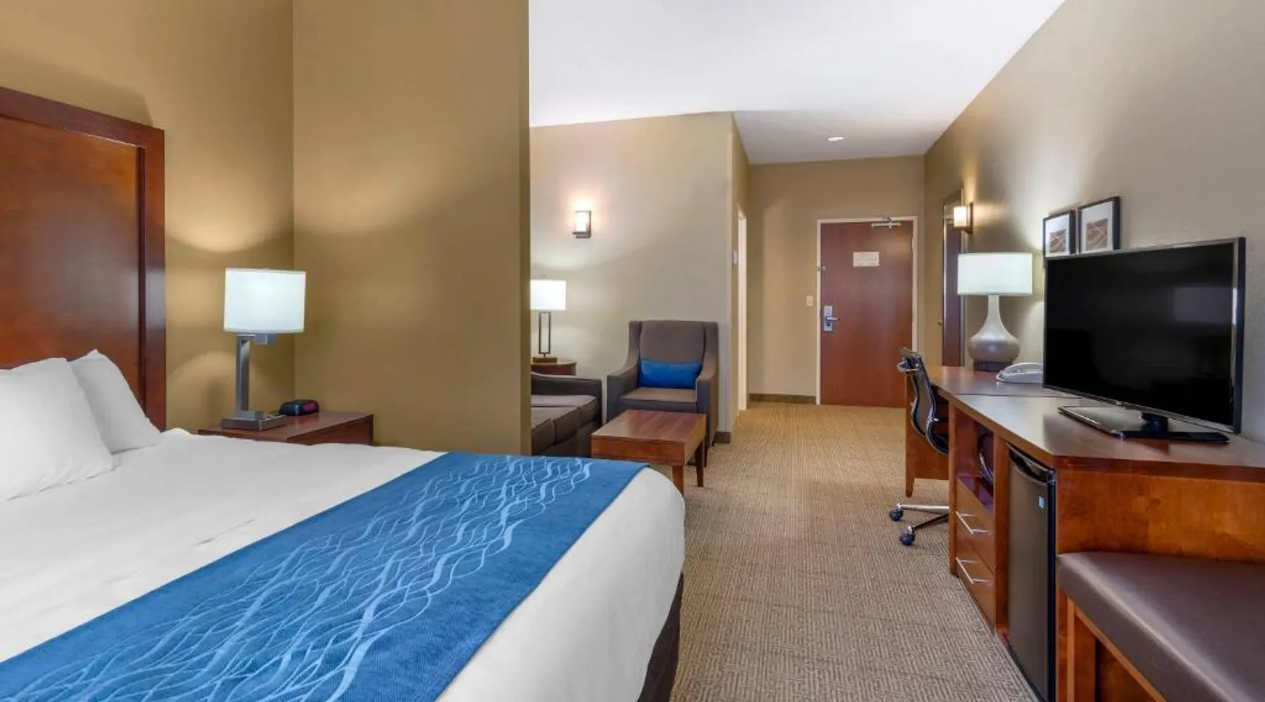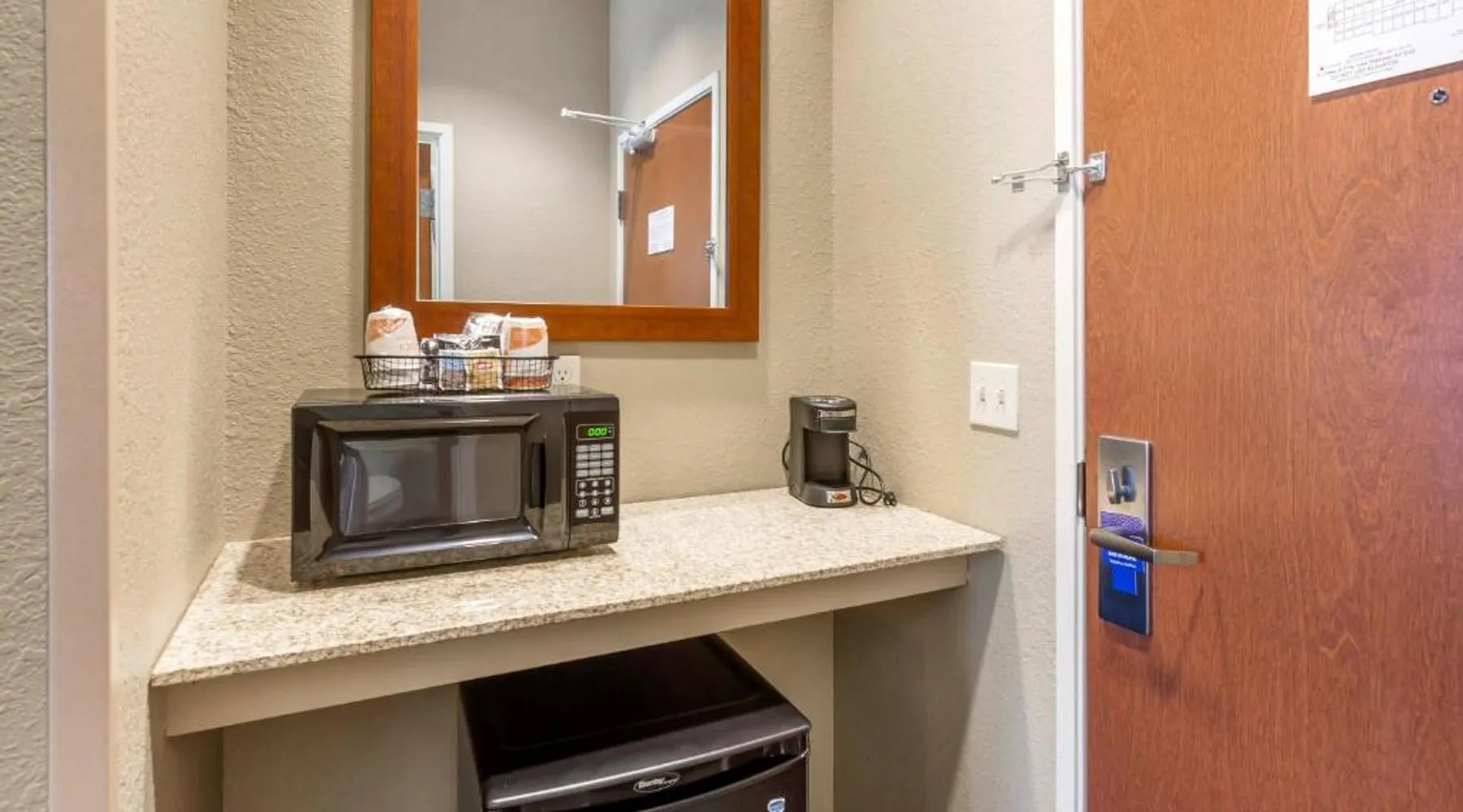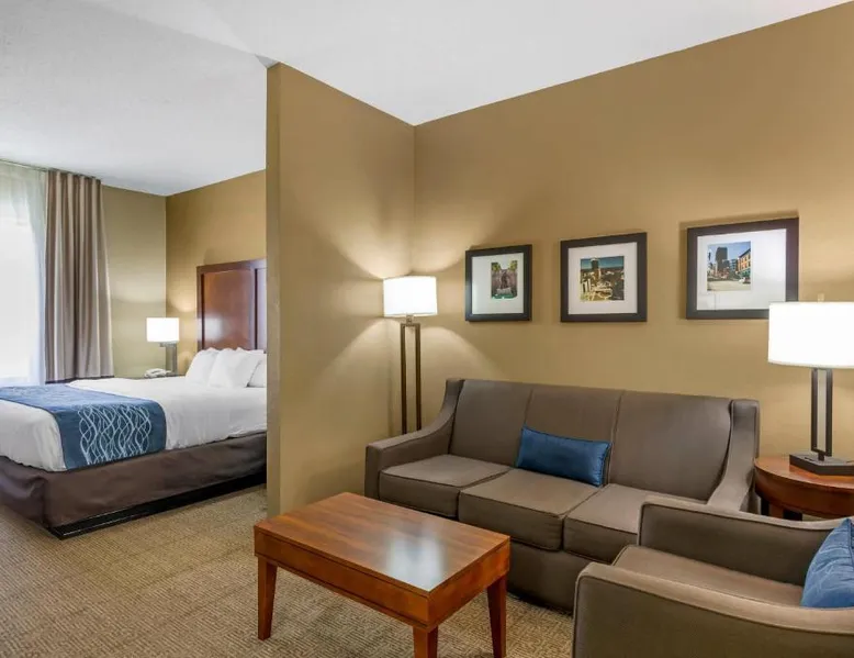 Comfortable Accommodations: Comfort Inn & Suites Lynchburg Airport - University Area in Lynchburg offers adults-only rooms with free WiFi, air-conditioning, and private bathrooms. Each room includes a work desk, refrigerator, and TV. Exceptional Facilities: Guests can enjoy a fitness center, seasonal outdoor swimming pool, and outdoor seating area. Additional amenities include a lounge, minimarket, and business area. Delicious Breakfast: A continental buffet breakfast with gluten-free options is served daily, featuring warm dishes, fresh pastries, fruits, and juice. Convenient Location: Located a few steps from Lynchburg Regional Airport, the hotel is close to Liberty University (2.5 mi), Lynchburg Stadium (6.2 mi), and other attractions. Free on-site private parking is available. This family room has a tea and coffee maker, a seating area and a TV with cable channels. The unit has 2 beds.