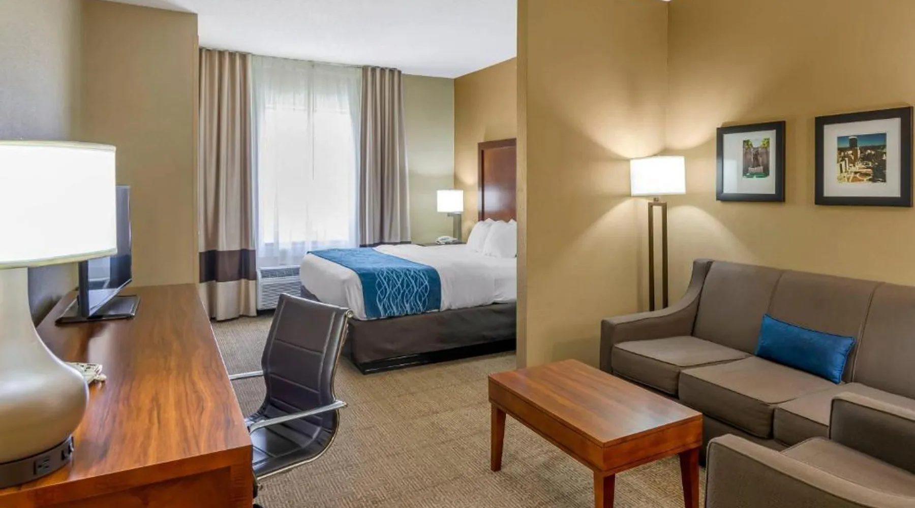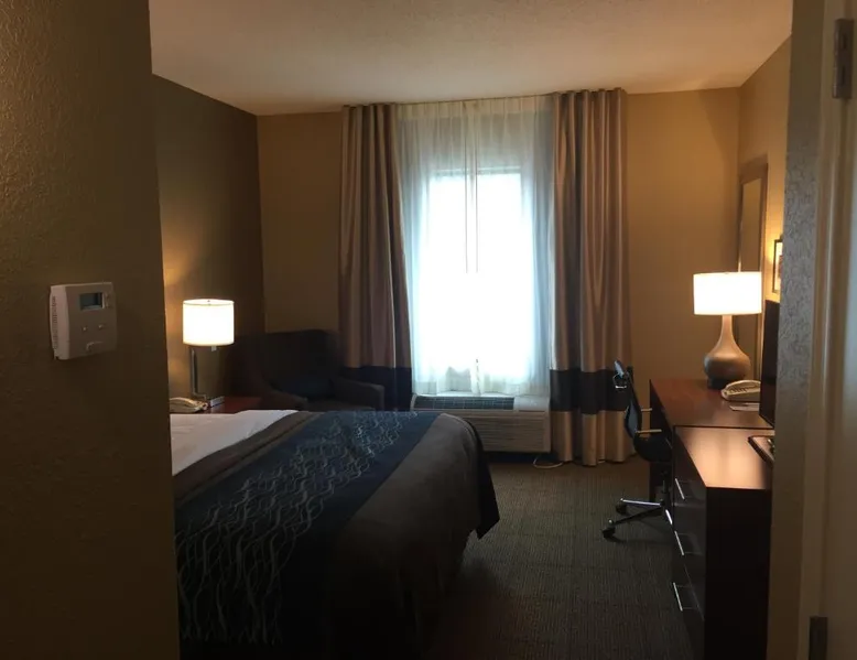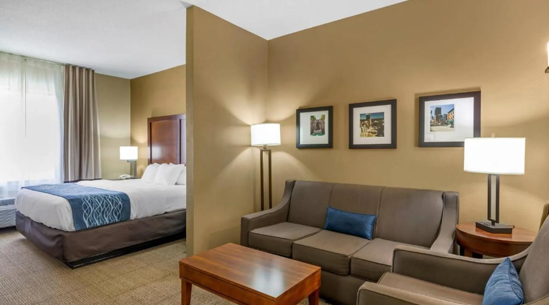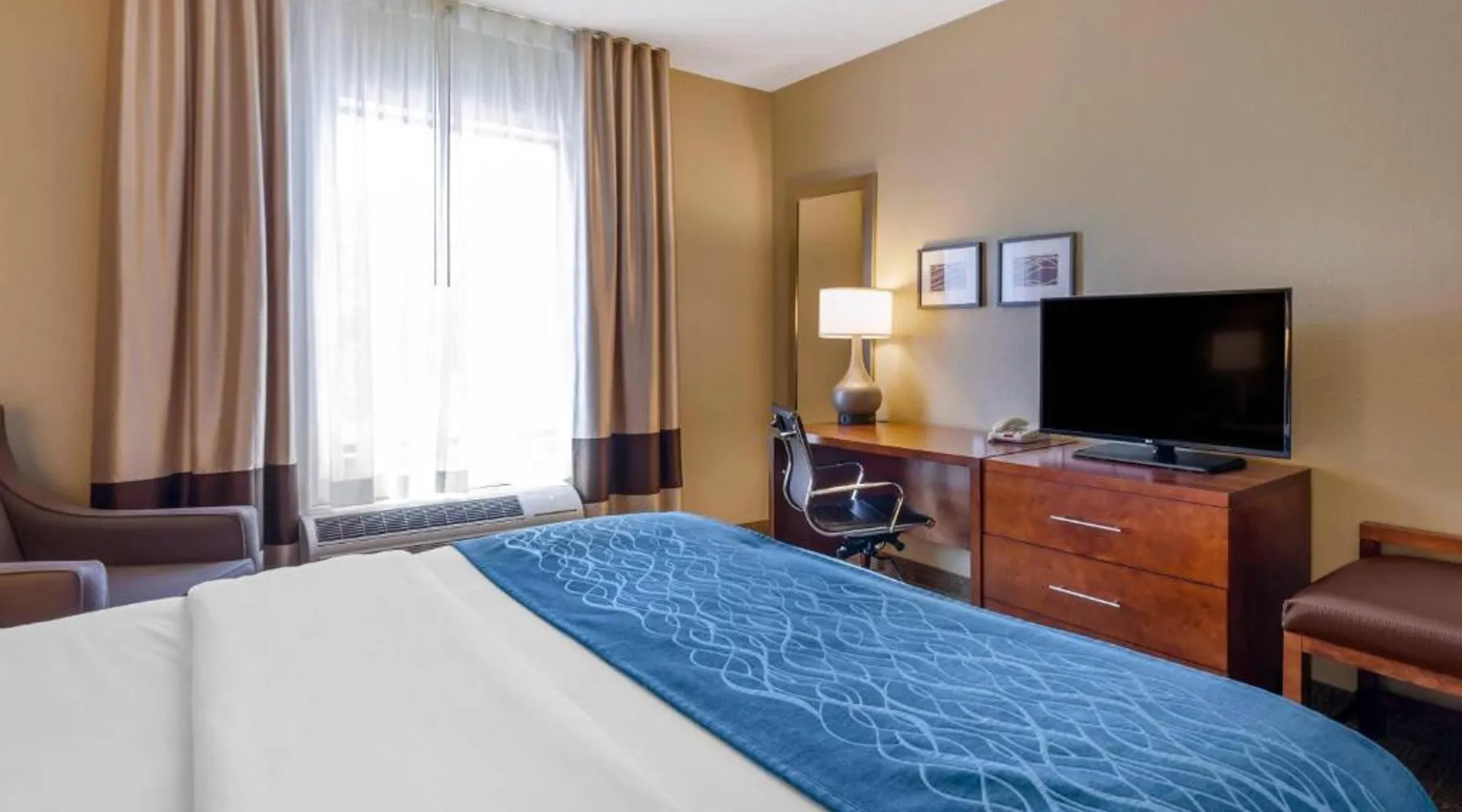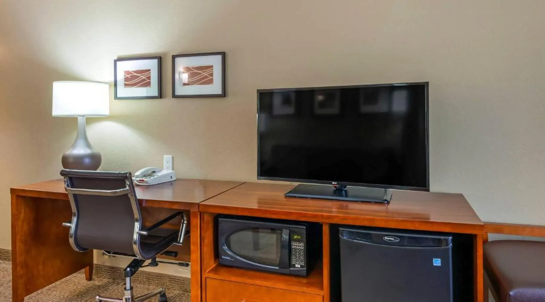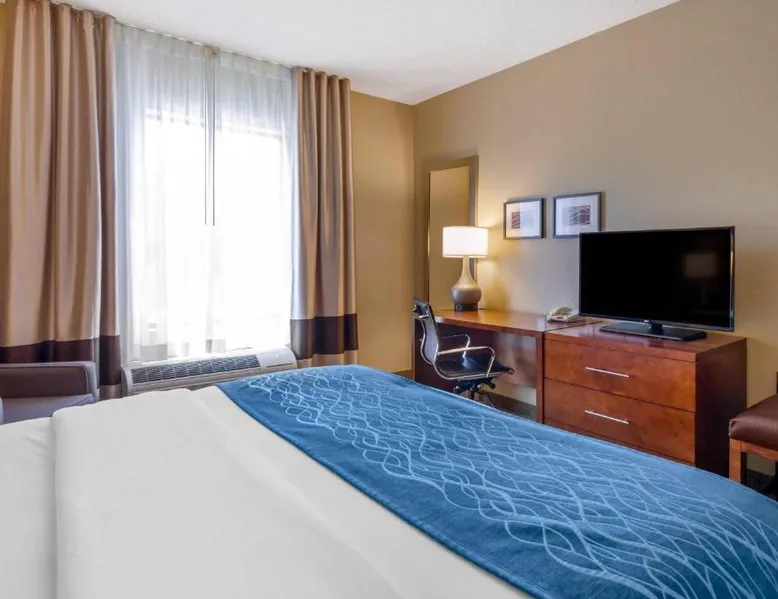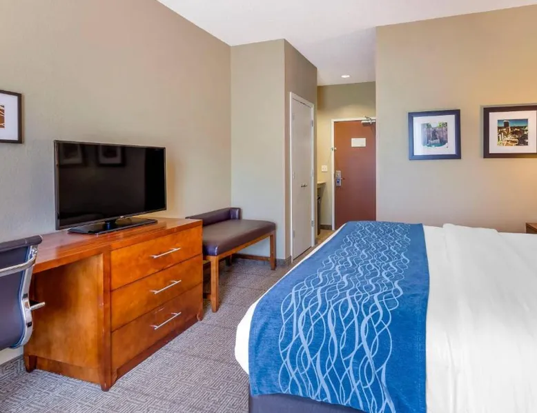 Comfortable Accommodations: Comfort Inn & Suites Lynchburg Airport - University Area in Lynchburg offers adults-only rooms with free WiFi, air-conditioning, and private bathrooms. Each room includes a work desk, refrigerator, and TV. Exceptional Facilities: Guests can enjoy a fitness center, seasonal outdoor swimming pool, and outdoor seating area. Additional amenities include a lounge, minimarket, and business area. Delicious Breakfast: A continental buffet breakfast with gluten-free options is served daily, featuring warm dishes, fresh pastries, fruits, and juice. Convenient Location: Located a few steps from Lynchburg Regional Airport, the hotel is close to Liberty University (2.5 mi), Lynchburg Stadium (6.2 mi), and other attractions. Free on-site private parking is available. This family room has a tea and coffee maker, a seating area and a TV with cable channels. The unit has 2 beds.