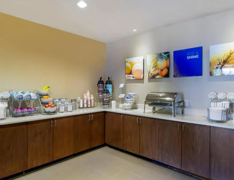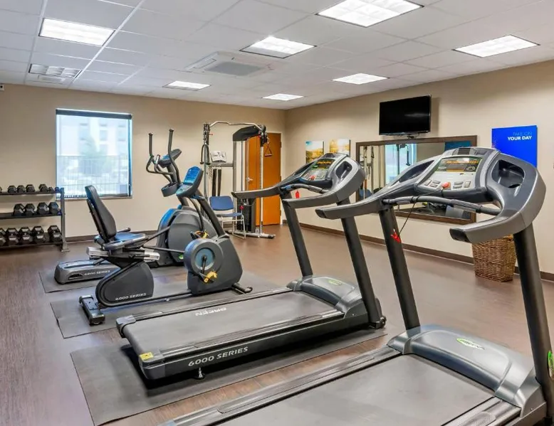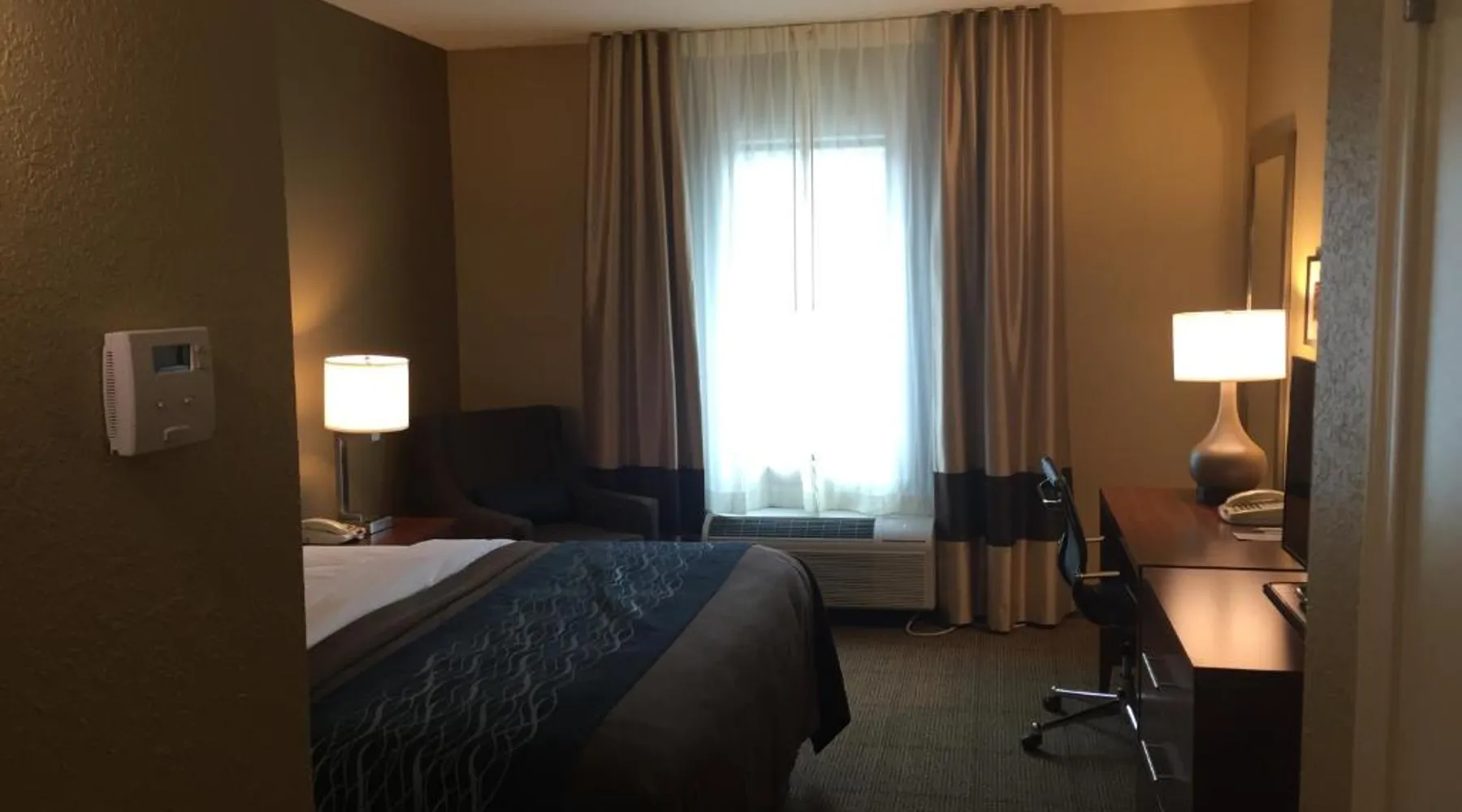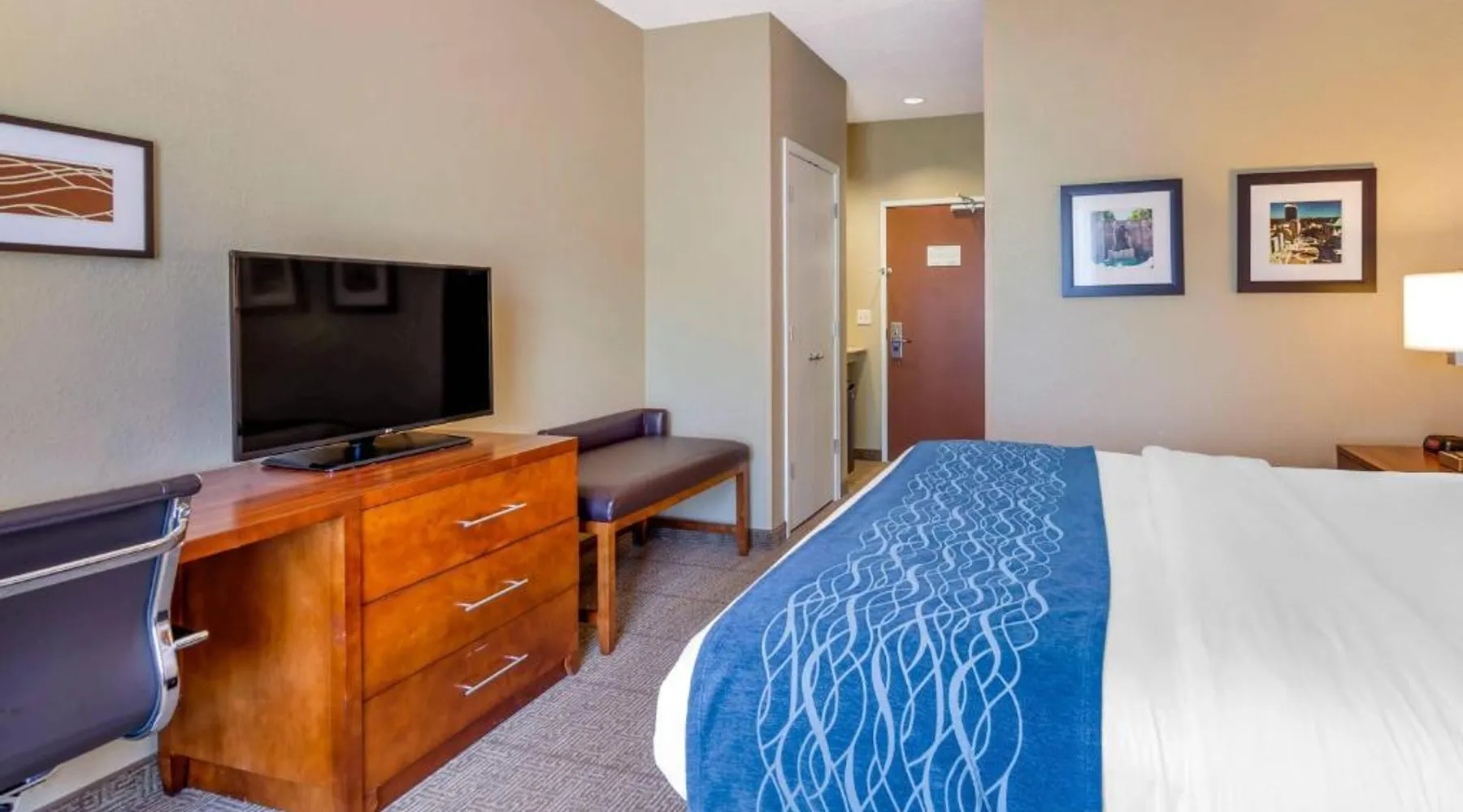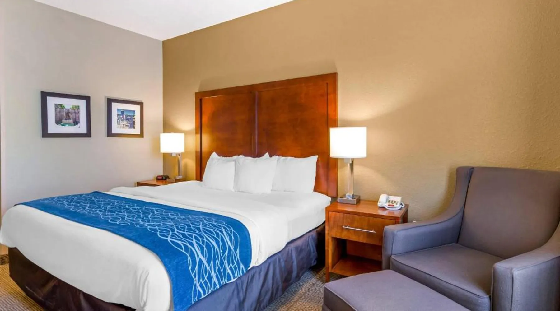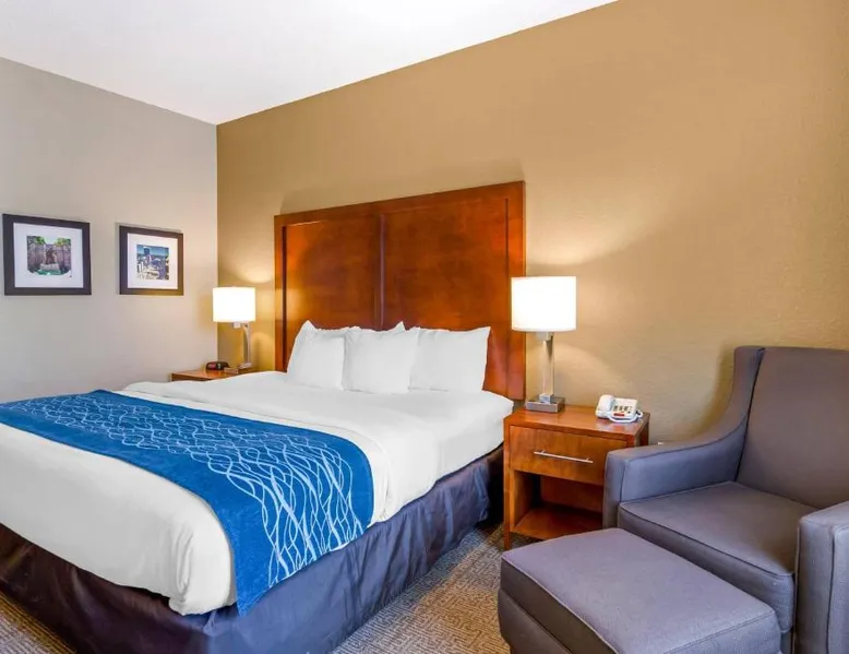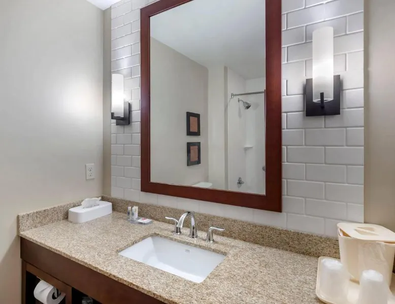 Comfortable Accommodations: Comfort Inn & Suites Lynchburg Airport - University Area in Lynchburg offers adults-only rooms with free WiFi, air-conditioning, and private bathrooms. Each room includes a work desk, refrigerator, and TV. Exceptional Facilities: Guests can enjoy a fitness center, seasonal outdoor swimming pool, and outdoor seating area. Additional amenities include a lounge, minimarket, and business area. Delicious Breakfast: A continental buffet breakfast with gluten-free options is served daily, featuring warm dishes, fresh pastries, fruits, and juice. Convenient Location: Located a few steps from Lynchburg Regional Airport, the hotel is close to Liberty University (2.5 mi), Lynchburg Stadium (6.2 mi), and other attractions. Free on-site private parking is available. This family room has a tea and coffee maker, a seating area and a TV with cable channels. The unit has 2 beds.