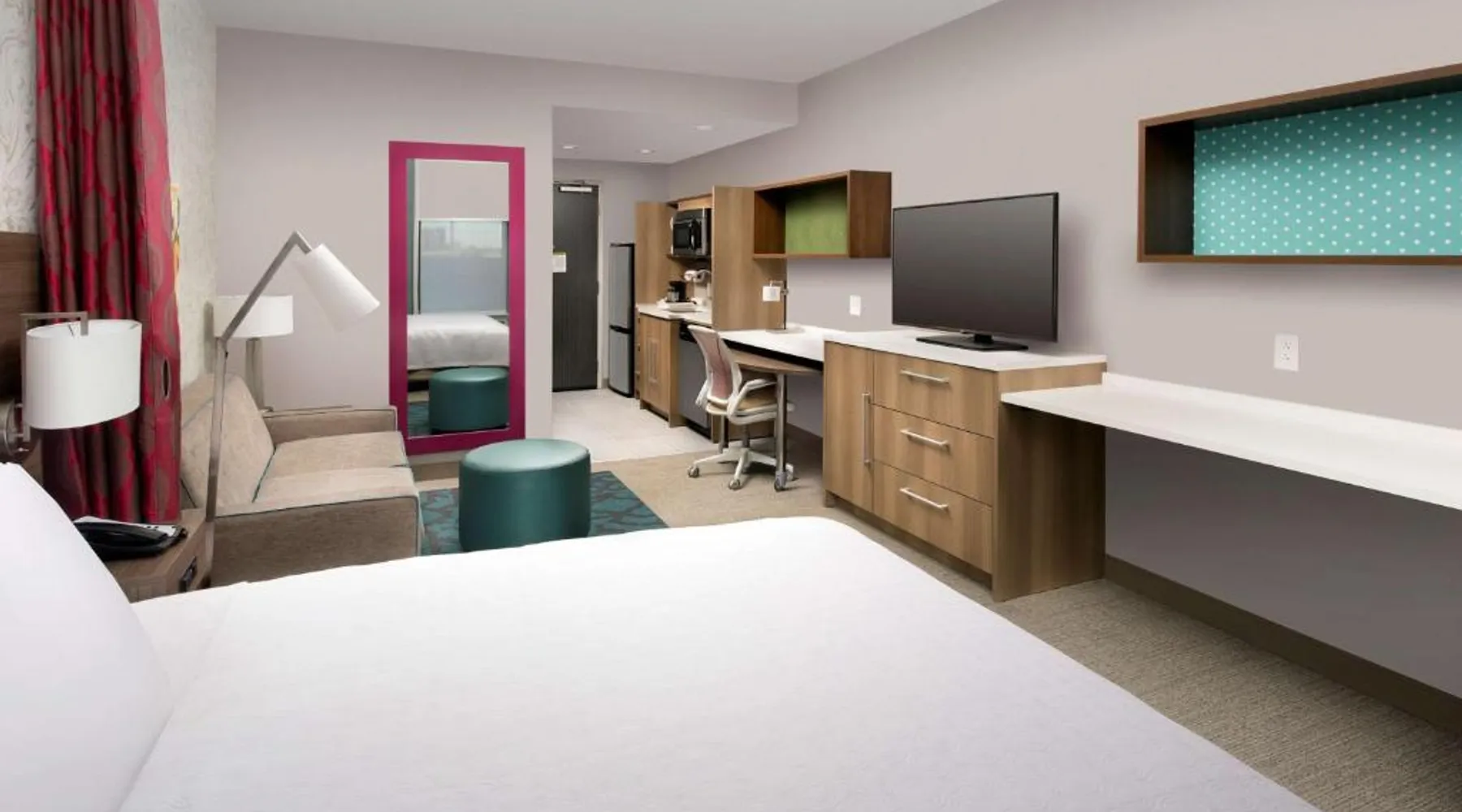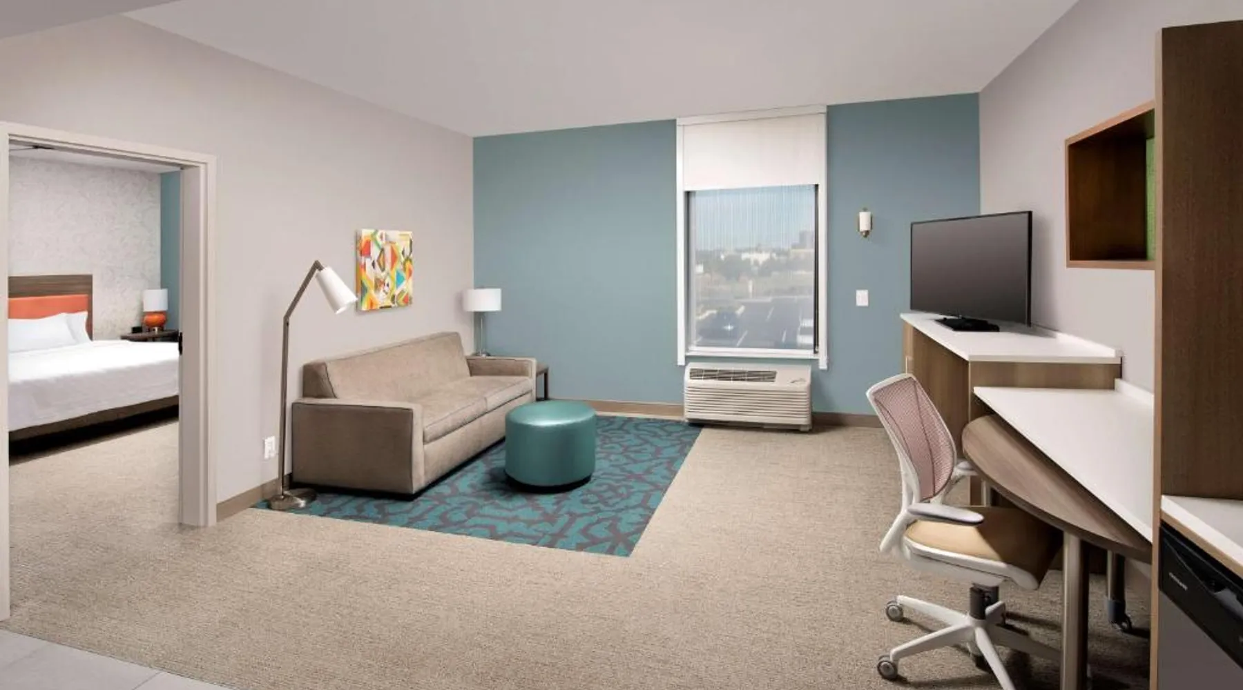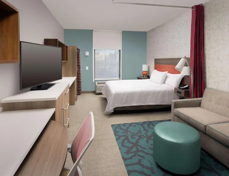 Comfortable Accommodations: Home2 Suites By Hilton Murfreesboro in Murfreesboro offers rooms with air-conditioning, kitchen facilities, and private bathrooms. Each room includes a tea and coffee maker, refrigerator, microwave, and TV. Exceptional Facilities: Guests enjoy a seasonal outdoor swimming pool, free WiFi, fitness room, and 24-hour front desk. Free on-site parking is available, along with a buffet breakfast. Prime Location: Located 25 mi from Nashville International Airport, the hotel is near attractions such as Thomas Kinkade Gallery (1.2 mi) and Stones River National Battlefield (1.8 mi). Highly rated for room cleanliness and excellent service. This room includes a seating area with a sofa bed and a large work desk with an ergonomic chair.