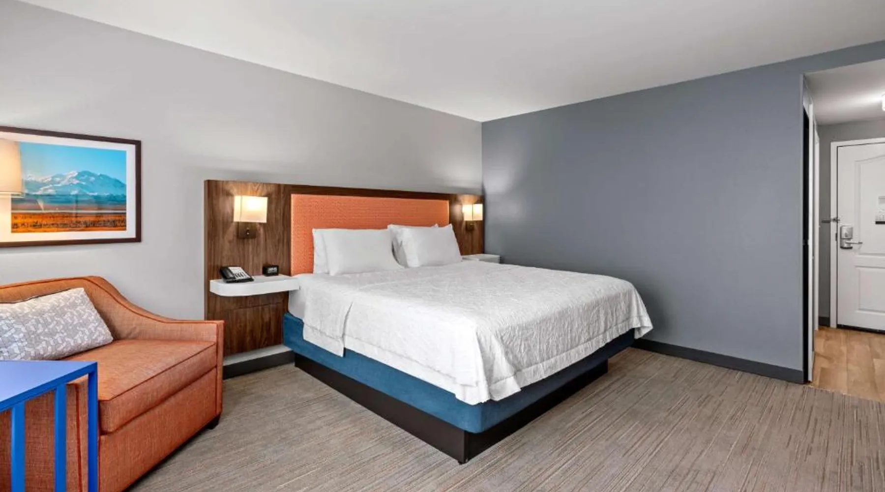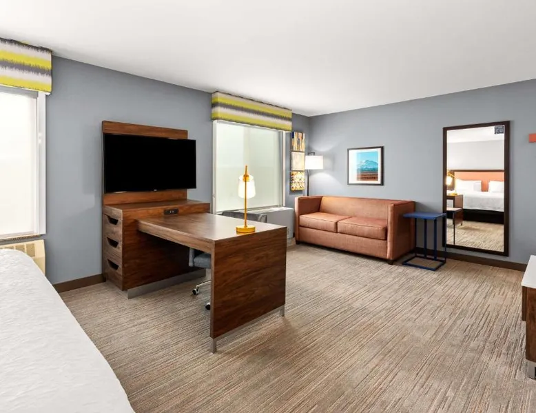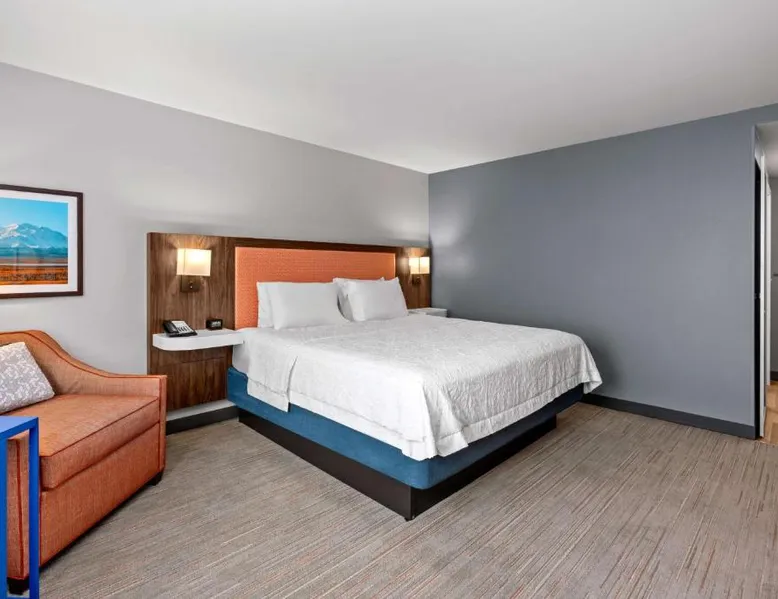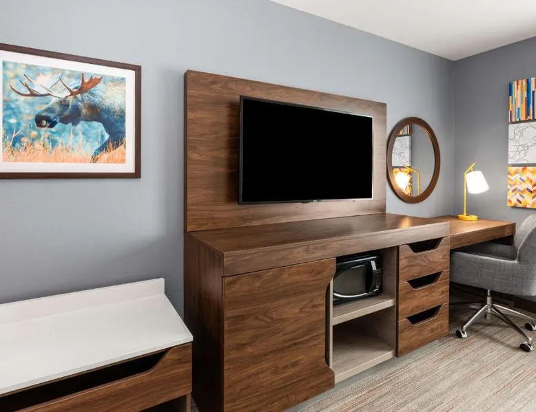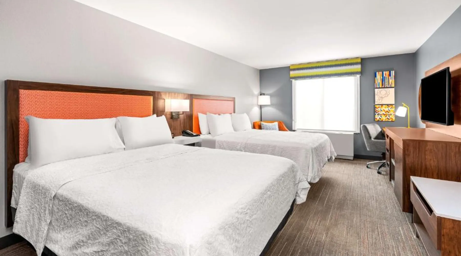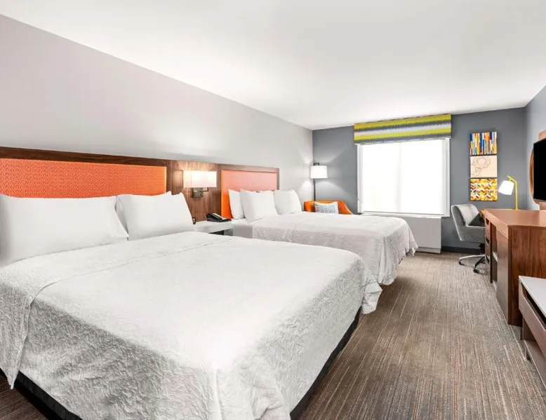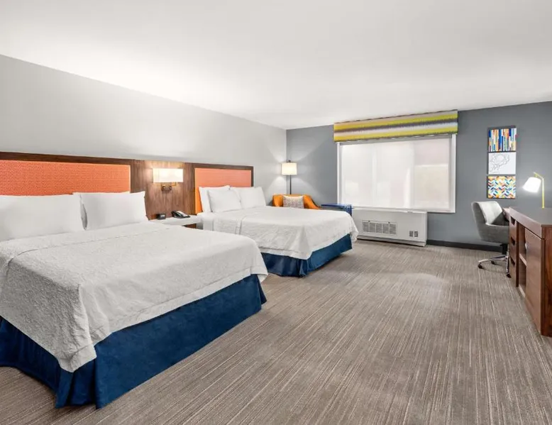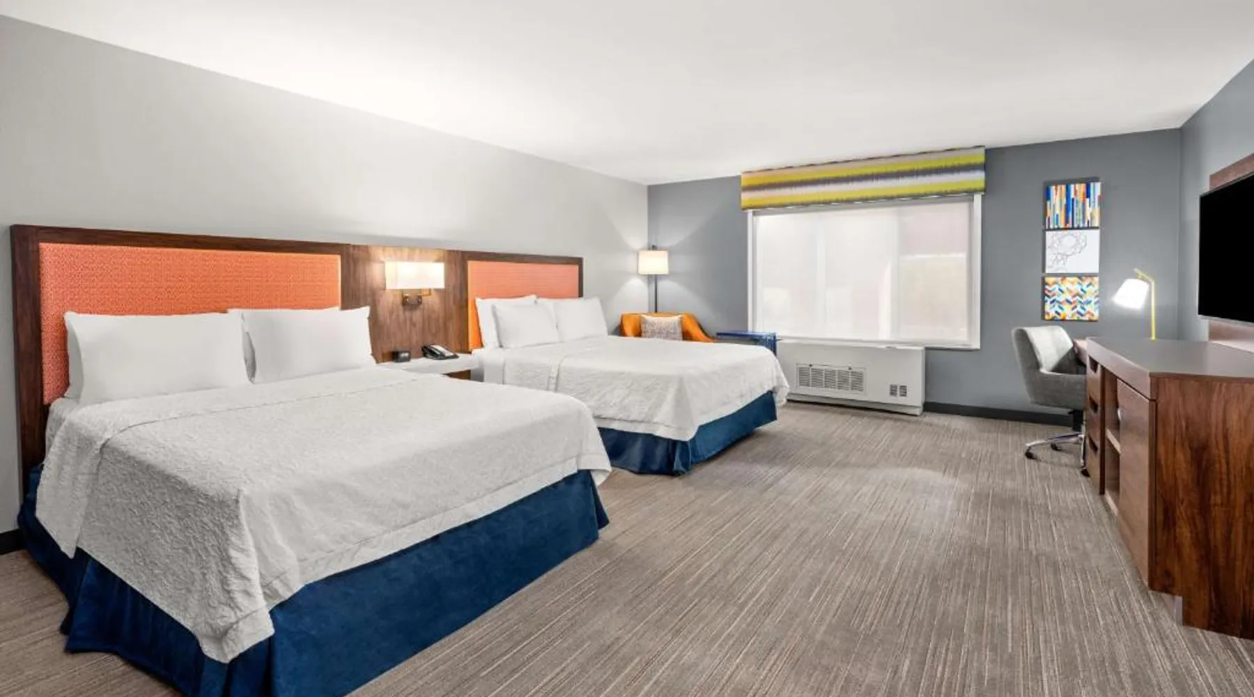 Comfortable Accommodations: Hampton Inn & Suites Fairbanks in Fairbanks offers comfortable rooms with amenities such as a fitness center, indoor swimming pool, and free airport shuttle service. Convenient Facilities: Guests enjoy private check-in and check-out, a fitness room, hot tub, 24-hour front desk, minimarket, daily housekeeping, business area, and luggage storage. Dining Options: A continental, American, and buffet breakfast is served with warm dishes, juice, fresh pastries, cheese, fruits, and a tea and coffee maker. Nearby Attractions: Located 6.2 mi from Fairbanks International Airport, the hotel is close to the Art Center (1.1 mi) and Fairbanks Exploration Historic (1.2 mi). This quadruple room provides a tea and coffee maker and a flat-screen TV. The unit offers 2 beds.