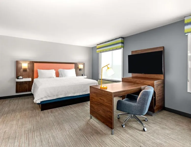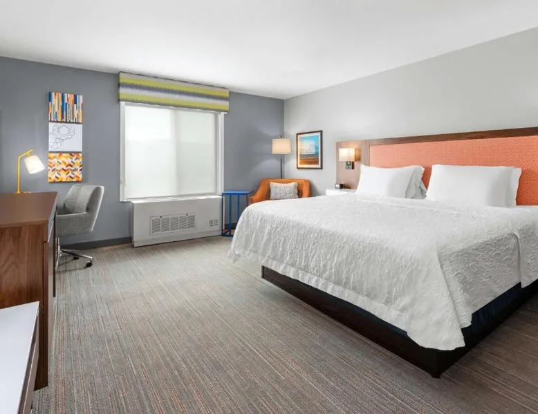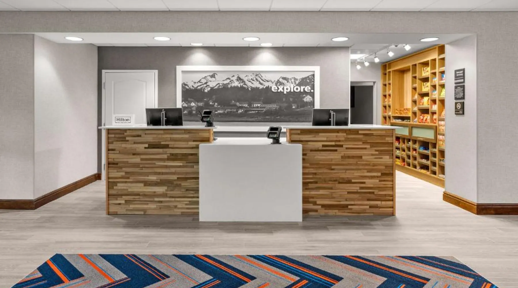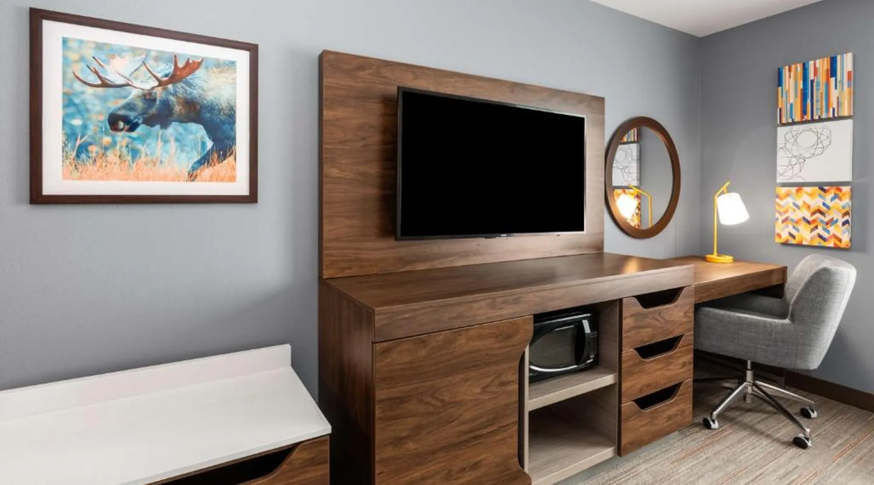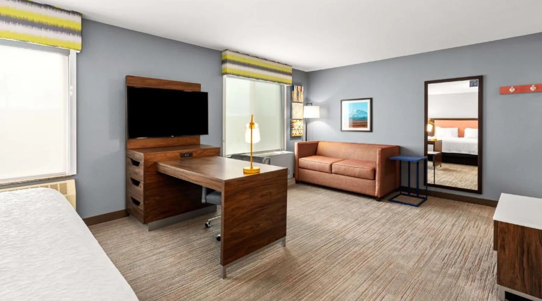 Comfortable Accommodations: Hampton Inn & Suites Fairbanks in Fairbanks offers comfortable rooms with amenities such as a fitness center, indoor swimming pool, and free airport shuttle service. Convenient Facilities: Guests enjoy private check-in and check-out, a fitness room, hot tub, 24-hour front desk, minimarket, daily housekeeping, business area, and luggage storage. Dining Options: A continental, American, and buffet breakfast is served with warm dishes, juice, fresh pastries, cheese, fruits, and a tea and coffee maker. Nearby Attractions: Located 6.2 mi from Fairbanks International Airport, the hotel is close to the Art Center (1.1 mi) and Fairbanks Exploration Historic (1.2 mi). This quadruple room provides a tea and coffee maker and a flat-screen TV. The unit offers 2 beds.