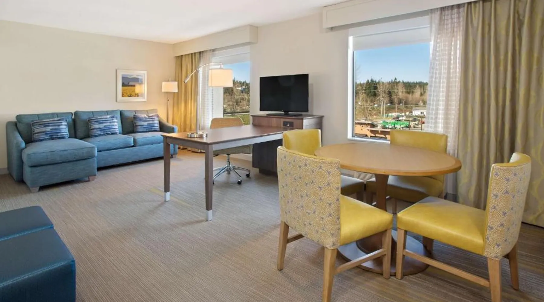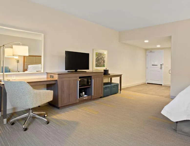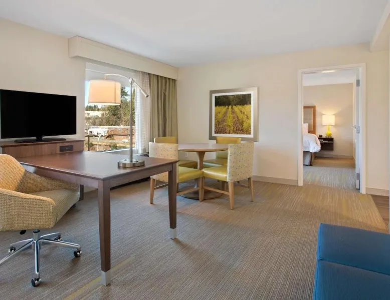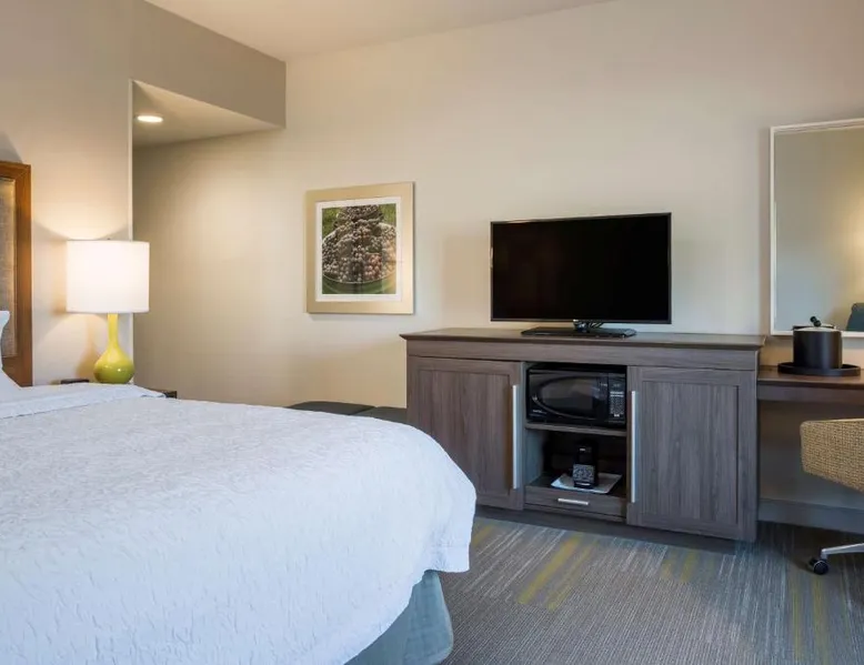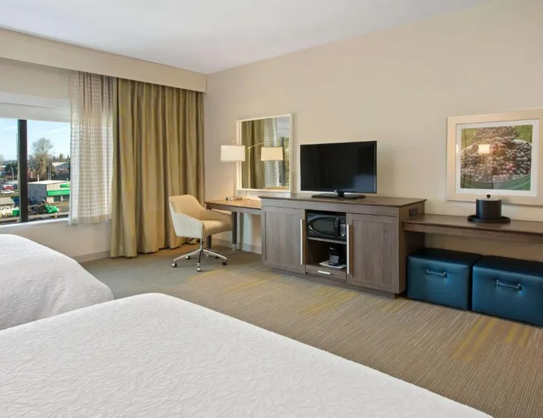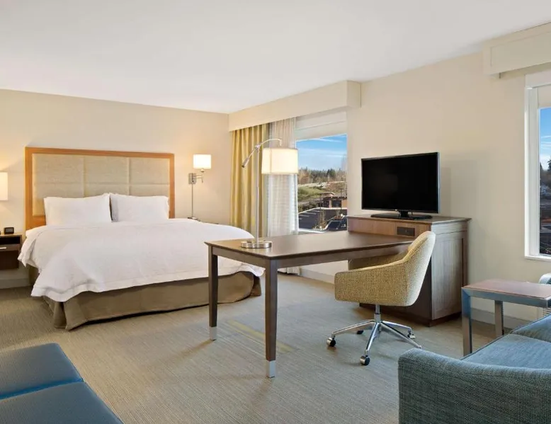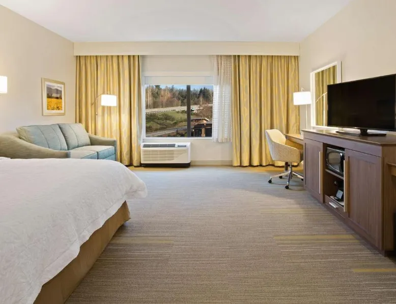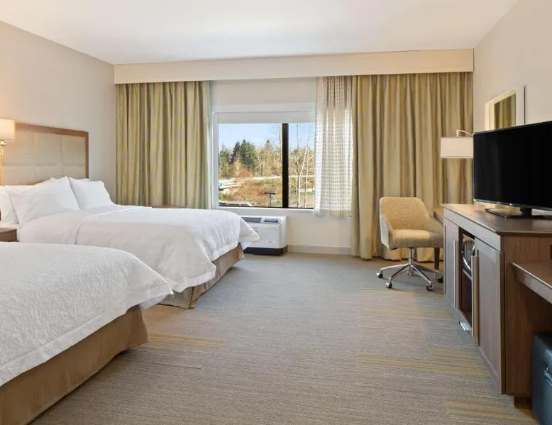 Comfortable Accommodations: Hampton Inn & Suites- Seattle Woodinville Wa in Woodinville offers family rooms with kitchenettes, refrigerators, microwaves, and free WiFi. Each room includes a sofa bed, TV, and tea and coffee maker. Facilities and Services: Guests can enjoy a fitness center, sun terrace, and outdoor seating area. Additional amenities include a lounge, business area, minimarket, and electric vehicle charging station. Free on-site private parking is available. Convenient Location: Located 14 mi from Snohomish County Airport, the hotel is near attractions such as the Space Needle (20 mi) and Future of Flight (15 mi). Free WiFi is accessible throughout the property. Guest Satisfaction: Highly rated for its breakfast, attentive staff, and clean rooms, the hotel ensures a pleasant stay for all visitors. The studio's kitchenette, which has a refrigerator and a microwave, is available for cooking and storing food. This studio features a tea and coffee maker and a flat-screen TV. The unit has 2 beds.