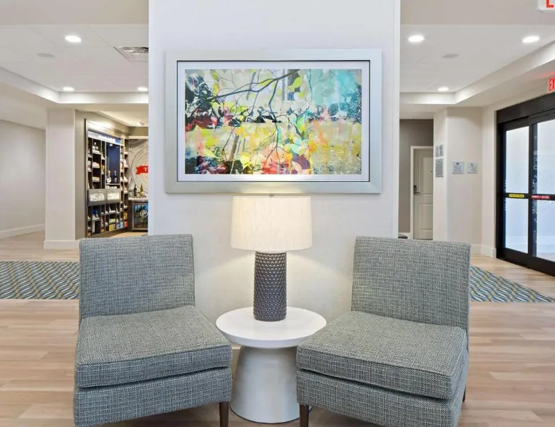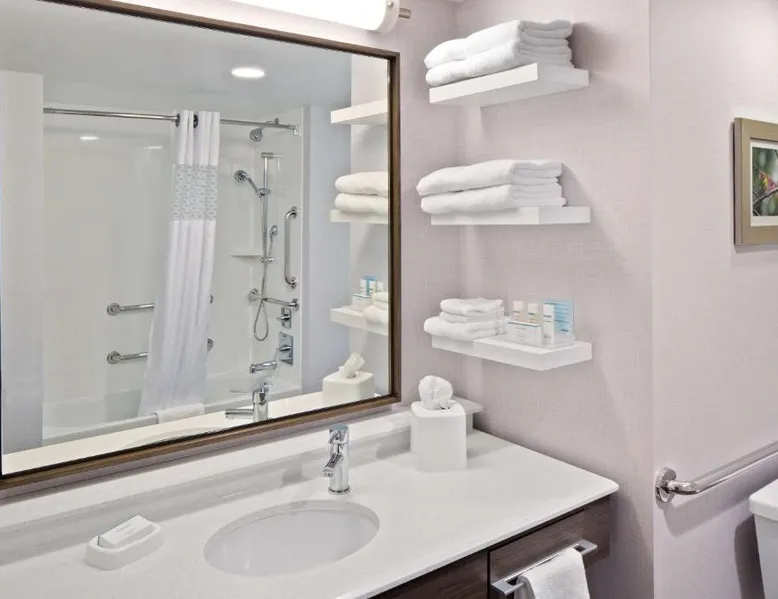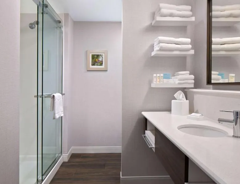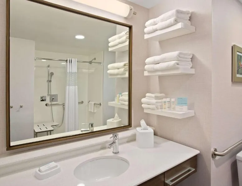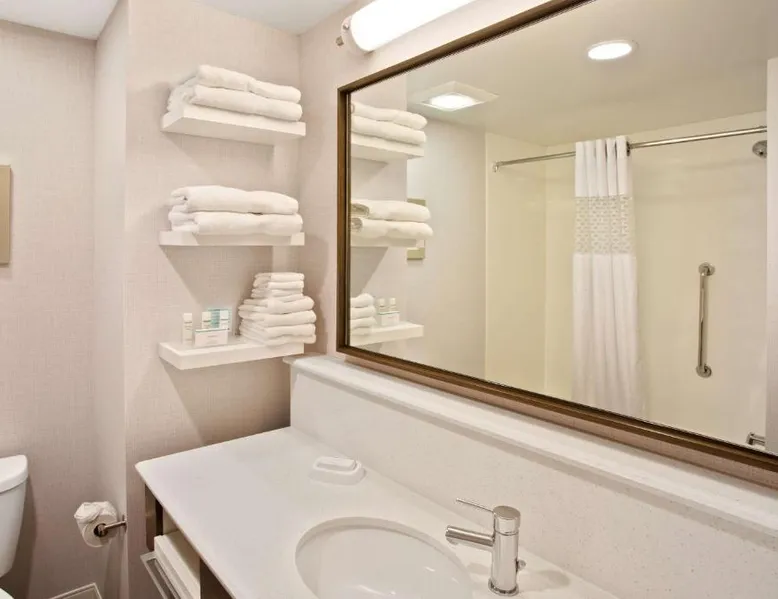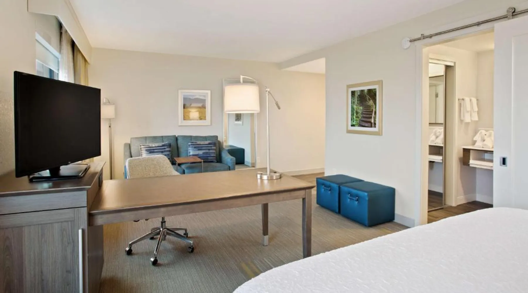 Comfortable Accommodations: Hampton Inn & Suites- Seattle Woodinville Wa in Woodinville offers family rooms with kitchenettes, refrigerators, microwaves, and free WiFi. Each room includes a sofa bed, TV, and tea and coffee maker. Facilities and Services: Guests can enjoy a fitness center, sun terrace, and outdoor seating area. Additional amenities include a lounge, business area, minimarket, and electric vehicle charging station. Free on-site private parking is available. Convenient Location: Located 14 mi from Snohomish County Airport, the hotel is near attractions such as the Space Needle (20 mi) and Future of Flight (15 mi). Free WiFi is accessible throughout the property. Guest Satisfaction: Highly rated for its breakfast, attentive staff, and clean rooms, the hotel ensures a pleasant stay for all visitors. The studio's kitchenette, which has a refrigerator and a microwave, is available for cooking and storing food. This studio features a tea and coffee maker and a flat-screen TV. The unit has 2 beds.
