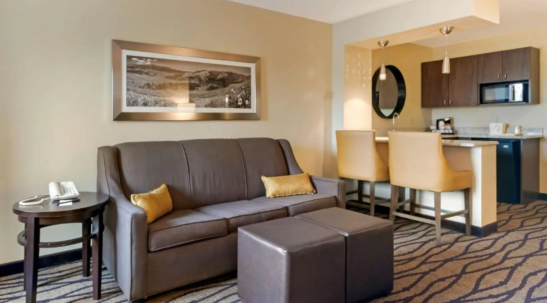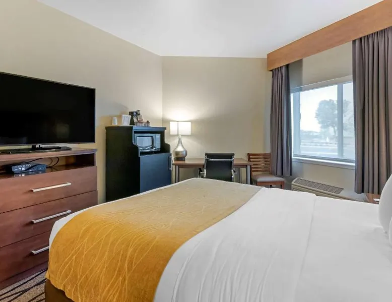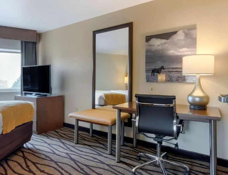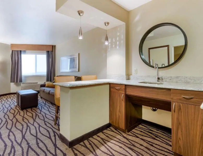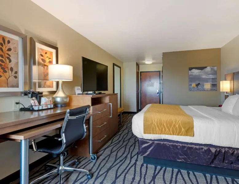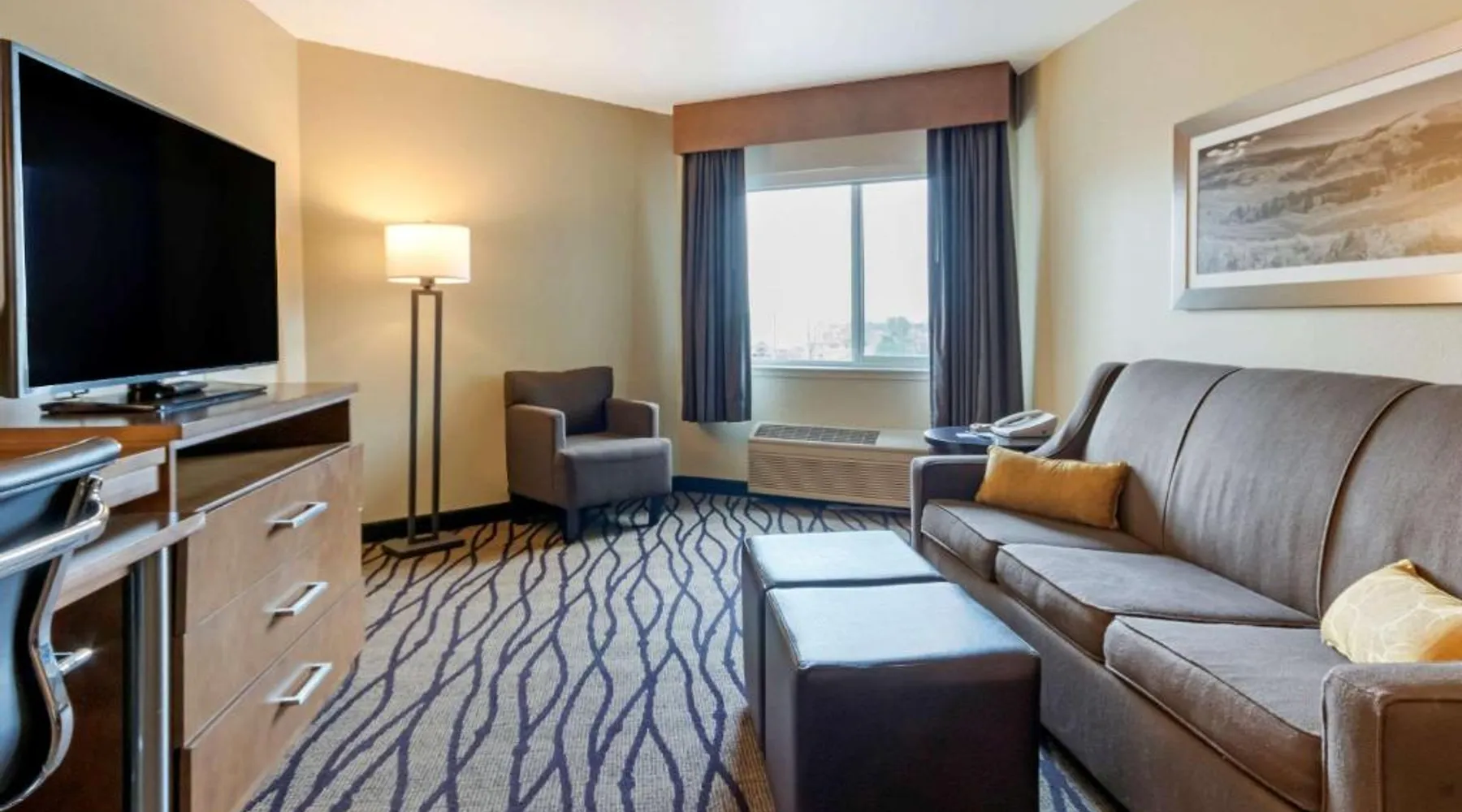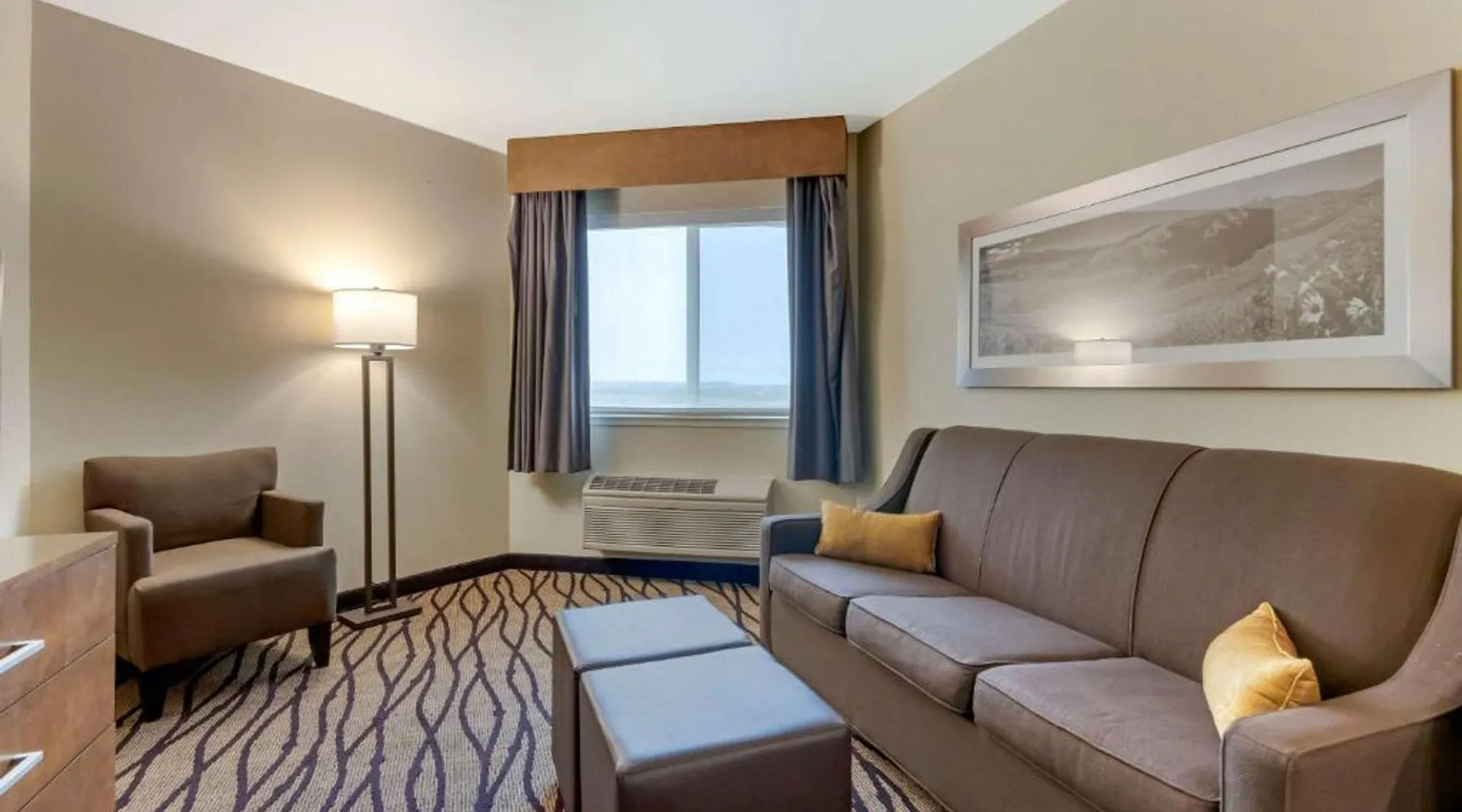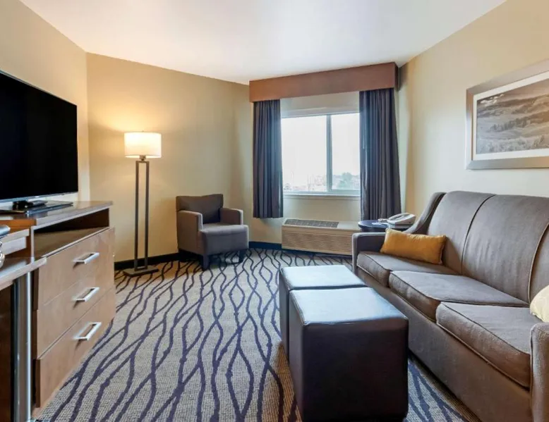Comfortable Accommodations: Comfort Inn & Suites Market - Airport in Great Falls offers comfortable rooms with private bathrooms, air-conditioning, and free WiFi. Each room includes a TV, work desk, and free toiletries. Convenient Facilities: Guests enjoy free on-site private parking, a continental buffet breakfast, and a coffee machine. Additional amenities include a washing machine, hairdryer, refrigerator, microwave, and wardrobe. Prime Location: Located 3.7 mi from Great Falls International Airport, the hotel is praised for its room cleanliness, convenient location, and comfortable rooms. This suite features a private bathroom and a sofa. This suite offers a flat-screen TV.