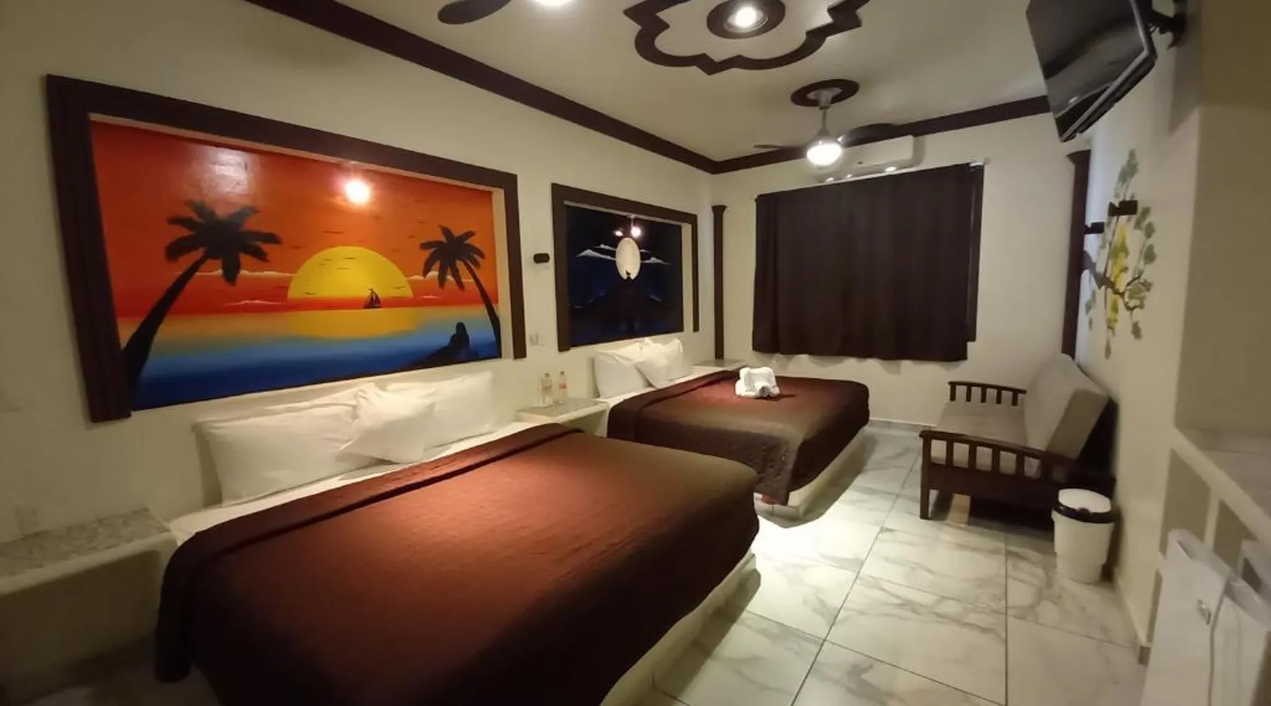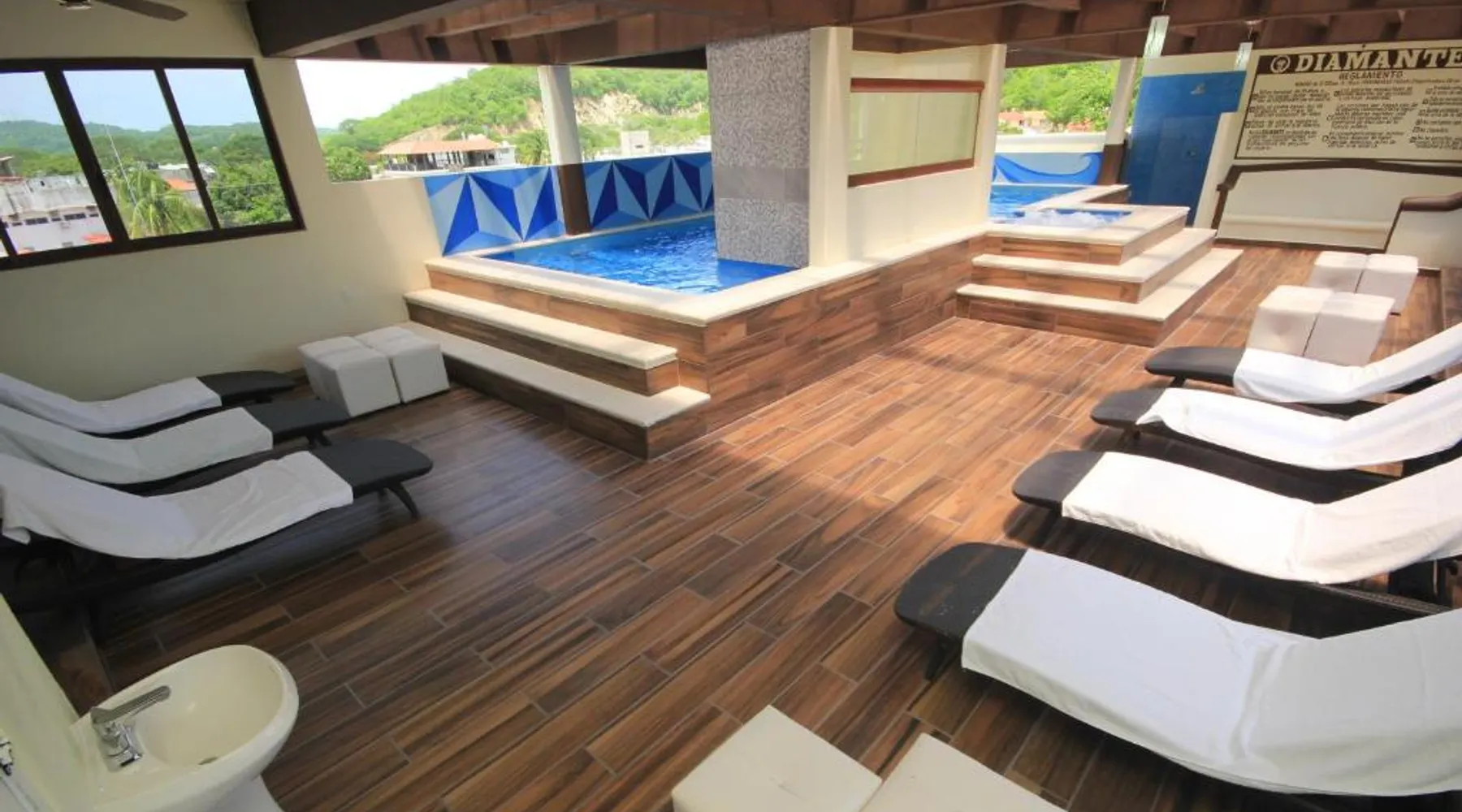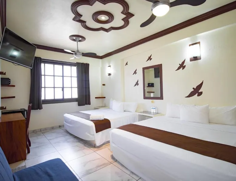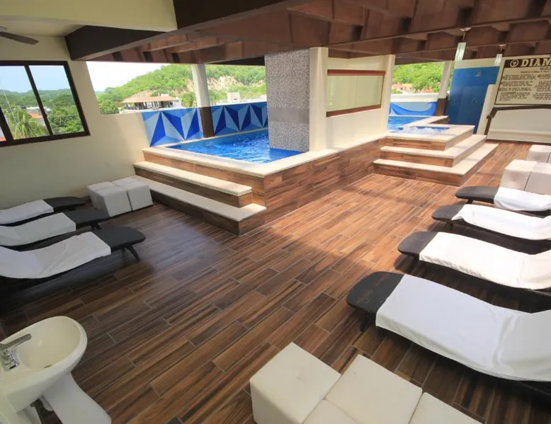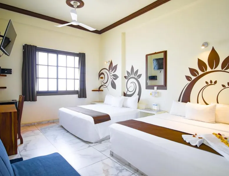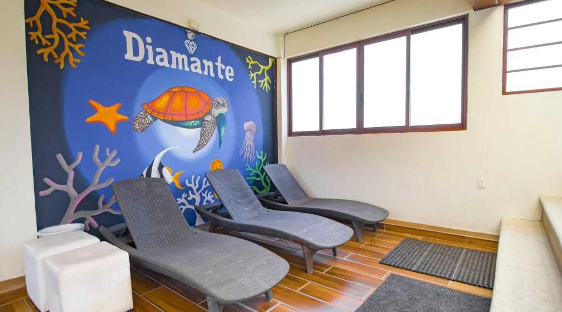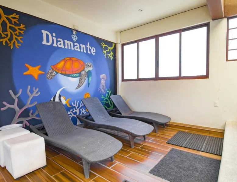 Comfortable Accommodations: Hotel Diamante in Bahías de Huatulco offers family rooms with air-conditioning, private bathrooms, and free WiFi. Each room includes a refrigerator, TV, and free toiletries. Exceptional Facilities: Guests can enjoy a rooftop swimming pool, hot tub, and public bath. Additional amenities include a 24-hour front desk, housekeeping service, room service, bike hire, tour desk, and luggage storage. Prime Location: Located 8.1 mi from Huatulco International Airport, the hotel is near Santa Cruz Beach (1.2 mi), Downtown Huatulco/Crucecita (2-minute walk), and Huatulco National Park (4.3 mi). Free on-site private parking is available. Guest Satisfaction: Highly rated for room cleanliness, Hotel Diamante ensures a pleasant stay for all visitors. Boasting 2 bedrooms and 1 bathroom, this spacious suite has a well-fitted kitchen and a dining area. The suite's kitchen, which has a refrigerator and kitchenware, is available for cooking and storing food. The suite offers air conditioning, a tea and coffee maker, a safe deposit box, a sofa and a flat-screen TV with cable channels. The unit offers 6 beds.