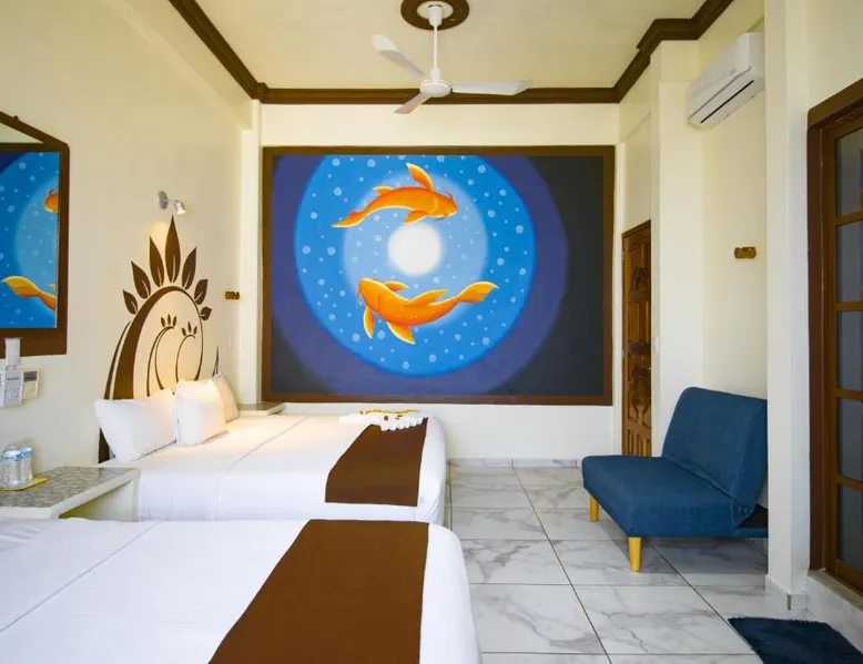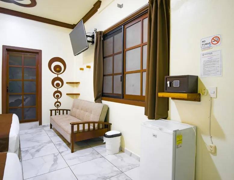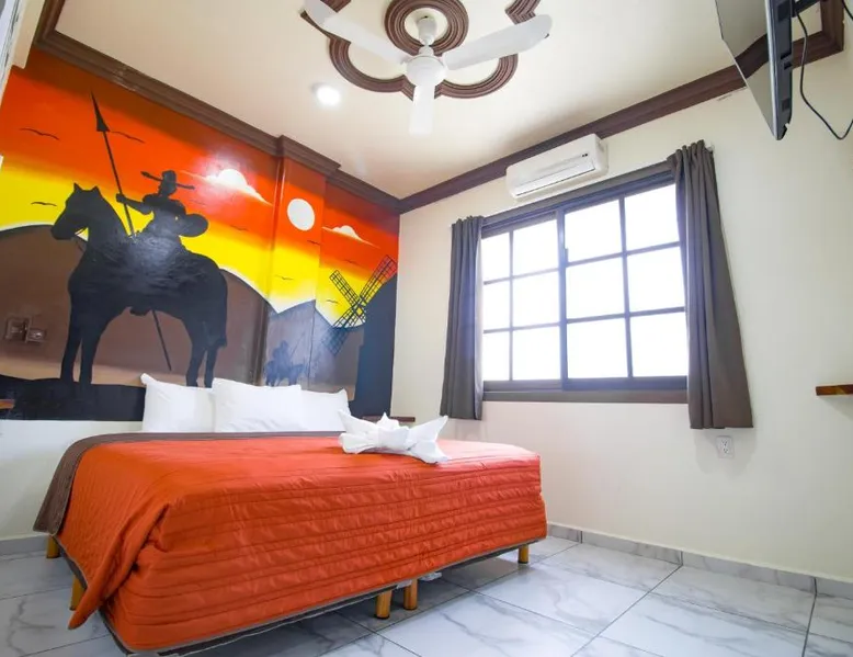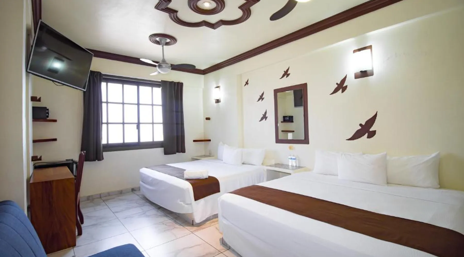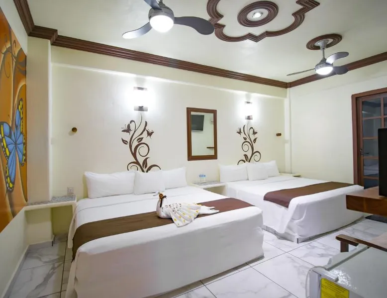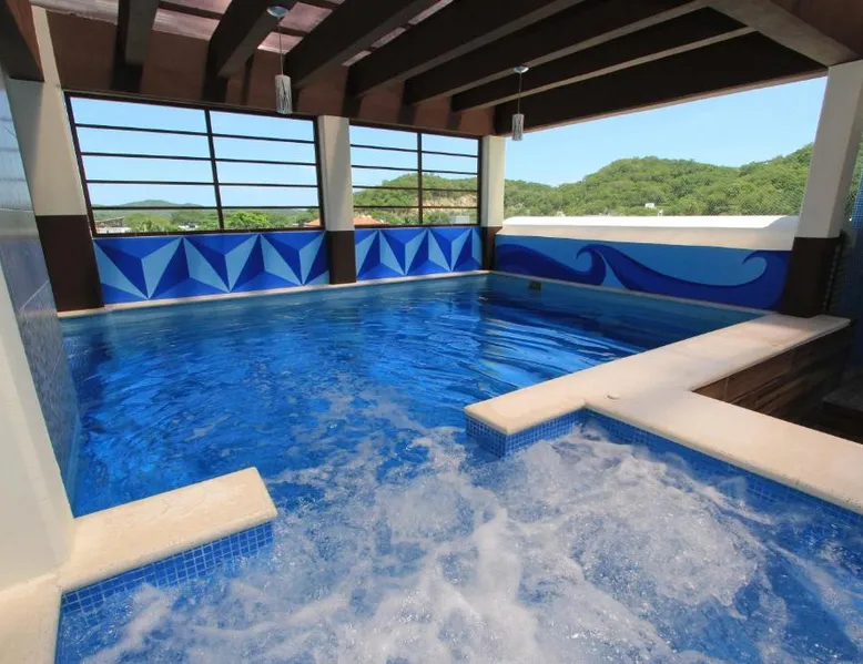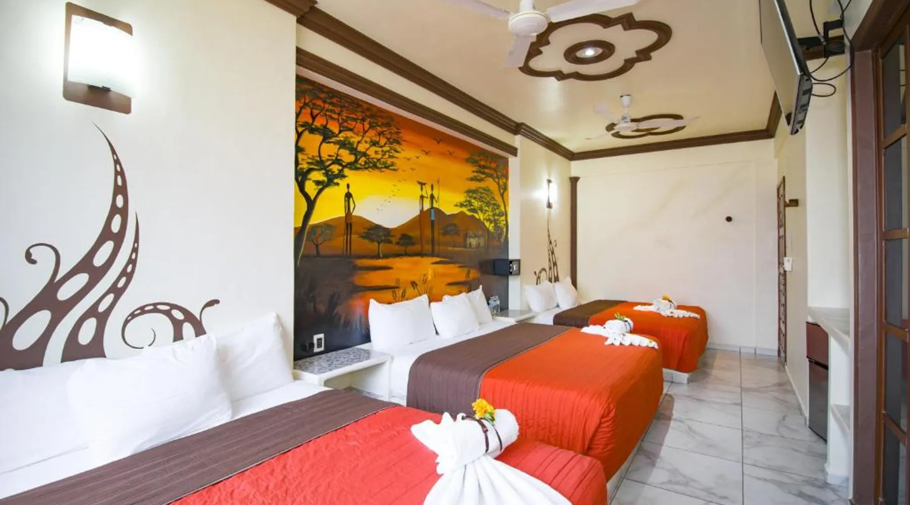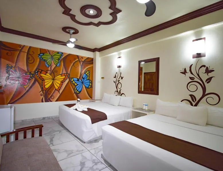 Comfortable Accommodations: Hotel Diamante in Bahías de Huatulco offers family rooms with air-conditioning, private bathrooms, and free WiFi. Each room includes a refrigerator, TV, and free toiletries. Exceptional Facilities: Guests can enjoy a rooftop swimming pool, hot tub, and public bath. Additional amenities include a 24-hour front desk, housekeeping service, room service, bike hire, tour desk, and luggage storage. Prime Location: Located 8.1 mi from Huatulco International Airport, the hotel is near Santa Cruz Beach (1.2 mi), Downtown Huatulco/Crucecita (2-minute walk), and Huatulco National Park (4.3 mi). Free on-site private parking is available. Guest Satisfaction: Highly rated for room cleanliness, Hotel Diamante ensures a pleasant stay for all visitors. Boasting 2 bedrooms and 1 bathroom, this spacious suite has a well-fitted kitchen and a dining area. The suite's kitchen, which has a refrigerator and kitchenware, is available for cooking and storing food. The suite offers air conditioning, a tea and coffee maker, a safe deposit box, a sofa and a flat-screen TV with cable channels. The unit offers 6 beds.