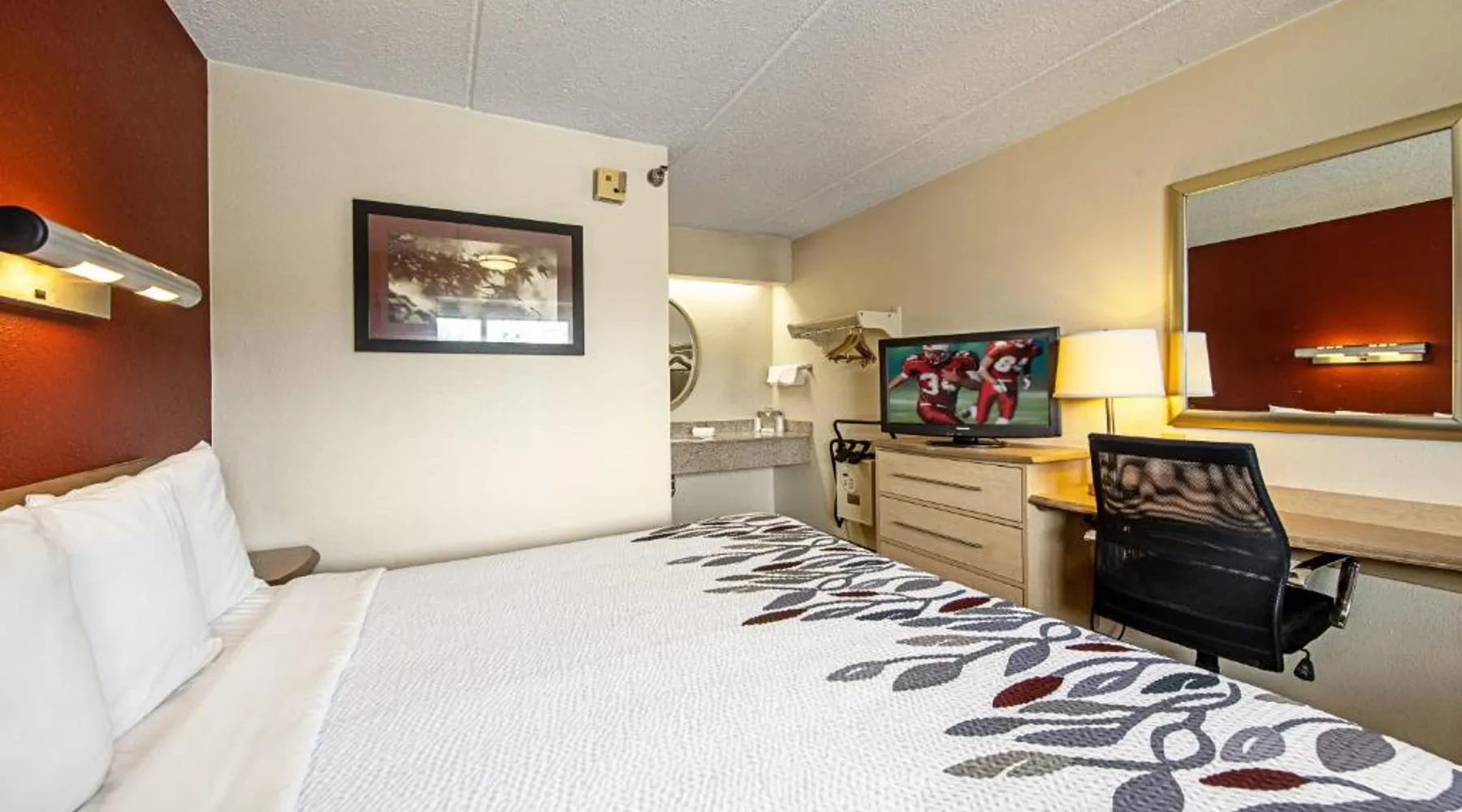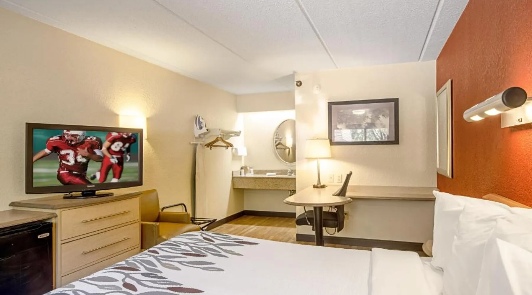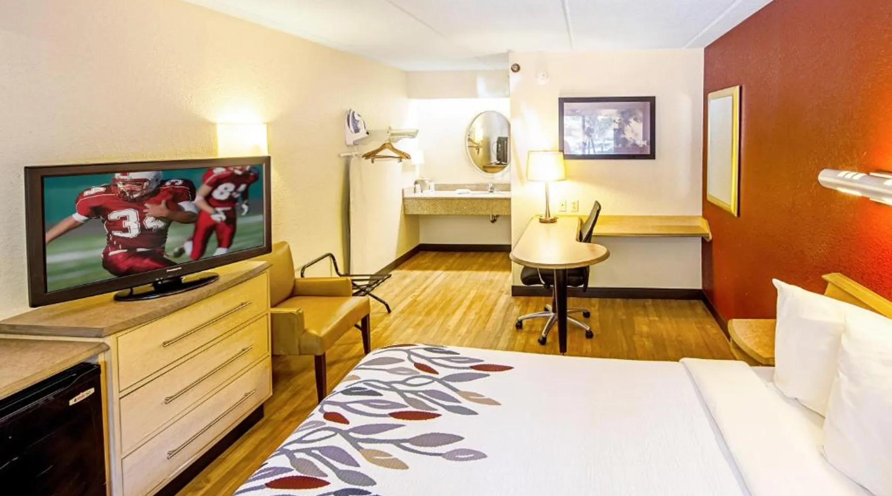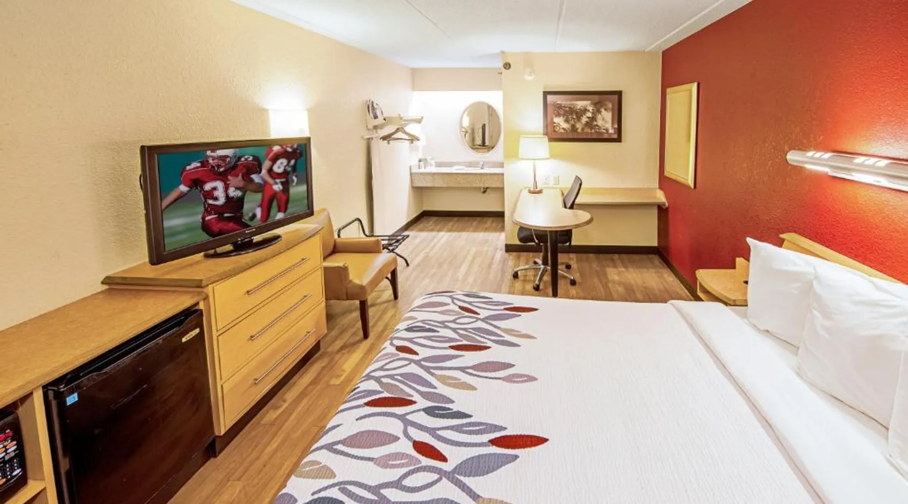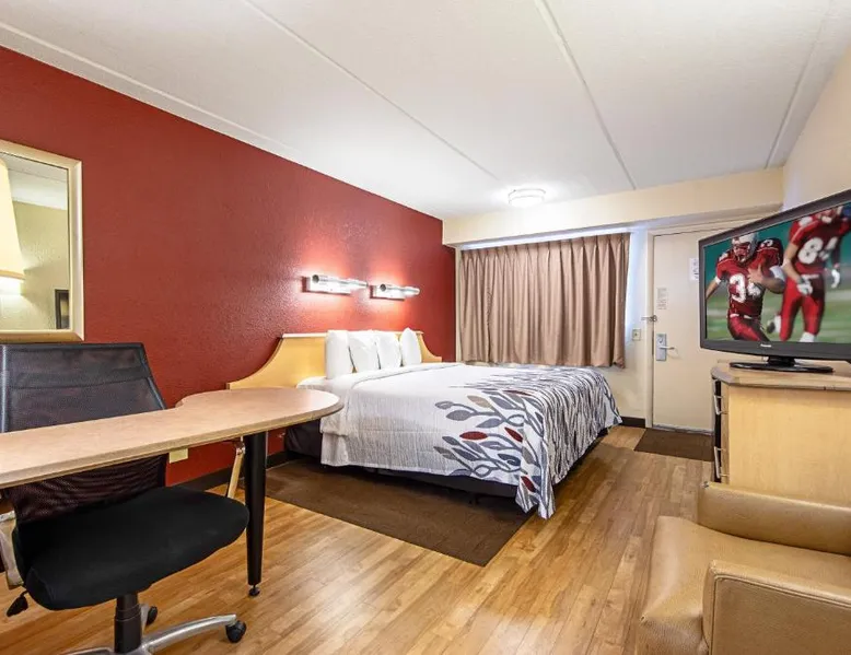 This Johnson City motel is located off Interstate 26 Exit 20 and features free Wi-Fi. Rooms have a flat-screen cable television. East Tennessee University is 3 mi away. A hardwood floor is featured in every air-conditioned room at this Johnson City Red Roof Inn. A small refrigerator and a microwave are included in select rooms. The 24-hour reception offers a safety deposit box for a fee at this nonsmoking Red Roof Inn Johnson City. Free parking is provided on site. The motel 16 minutes’ drive from Roan Mountain State Park. The East Tennessee State University Natural History Museum is 9.9 mi away. This property provides daily housekeeping for stays of 1 – 6 nights. Housekeeping is provided once a week for 7-night minimum stays. A flat-screen cable TV, alarm clock, and hardwood floor are featured in this room.
